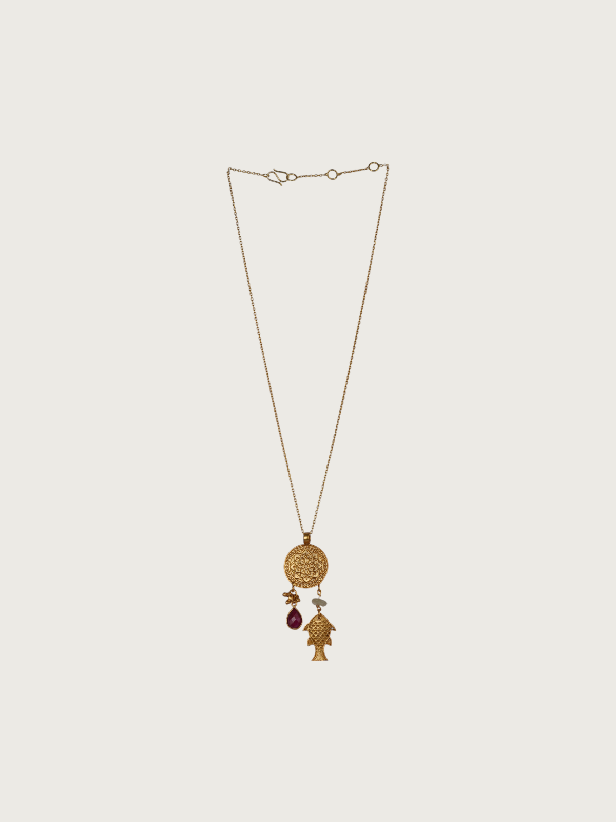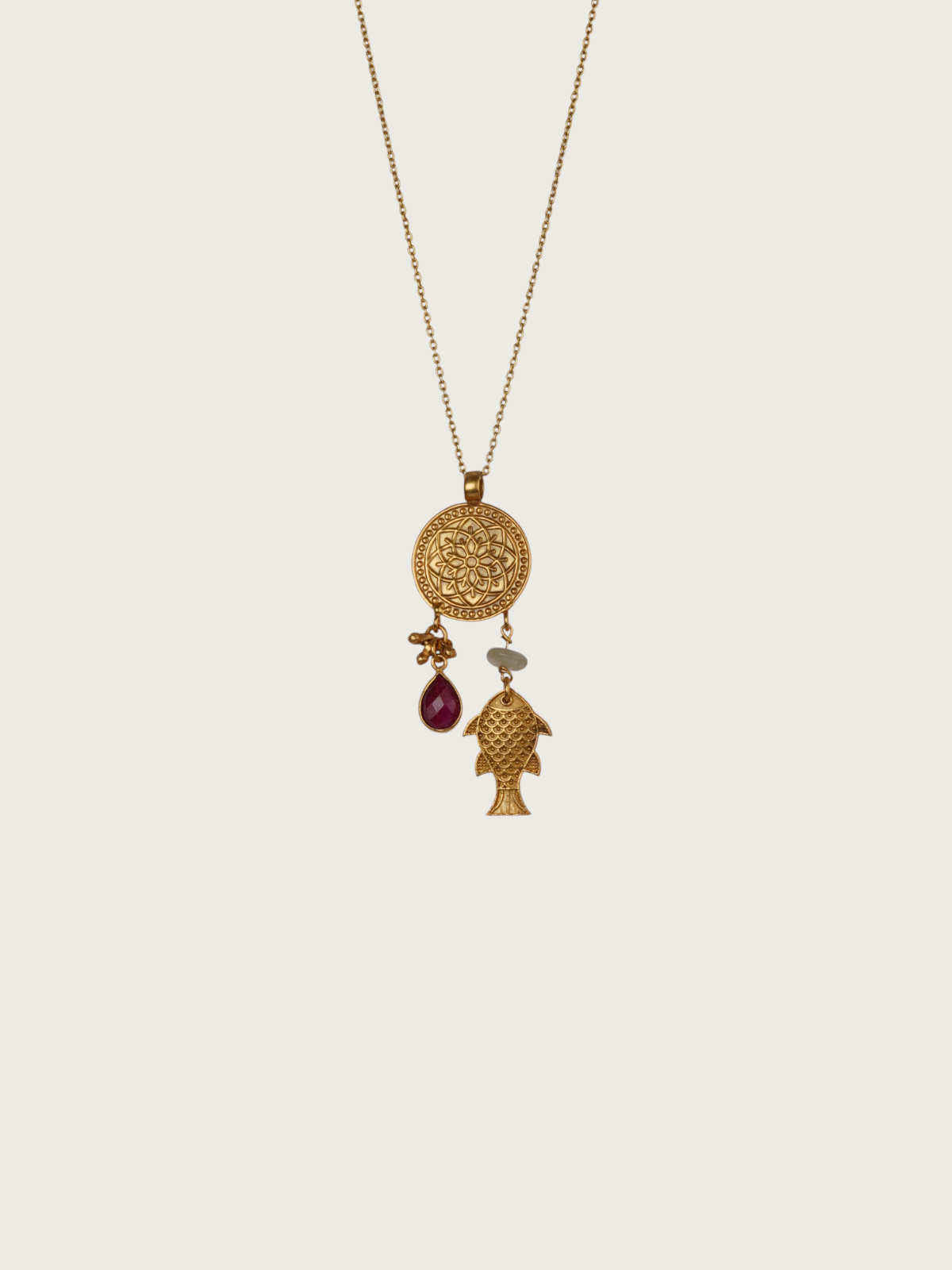 Celebrate intricate craftsmanship with this Mandala Charm Drop Necklace – a radiant blend of cultural symbolism and ornamental detailing. The centerpiece features a finely carved gold-toned mandala disc, a motif symbolizing wholeness and cosmic harmony. Hanging from it are eclectic charms – a dainty fish, deep red teardrop stone, and a pearl-like accent – each thoughtfully composed to bring uniqueness and visual interest.