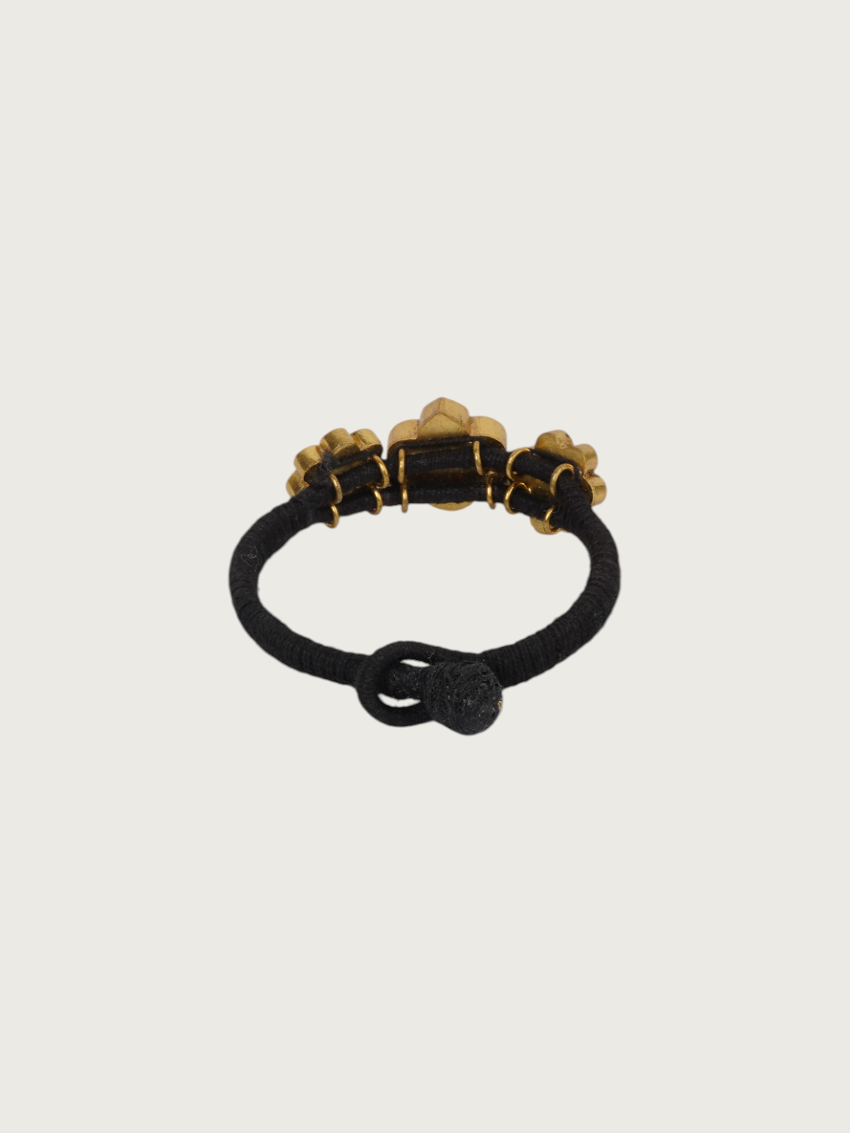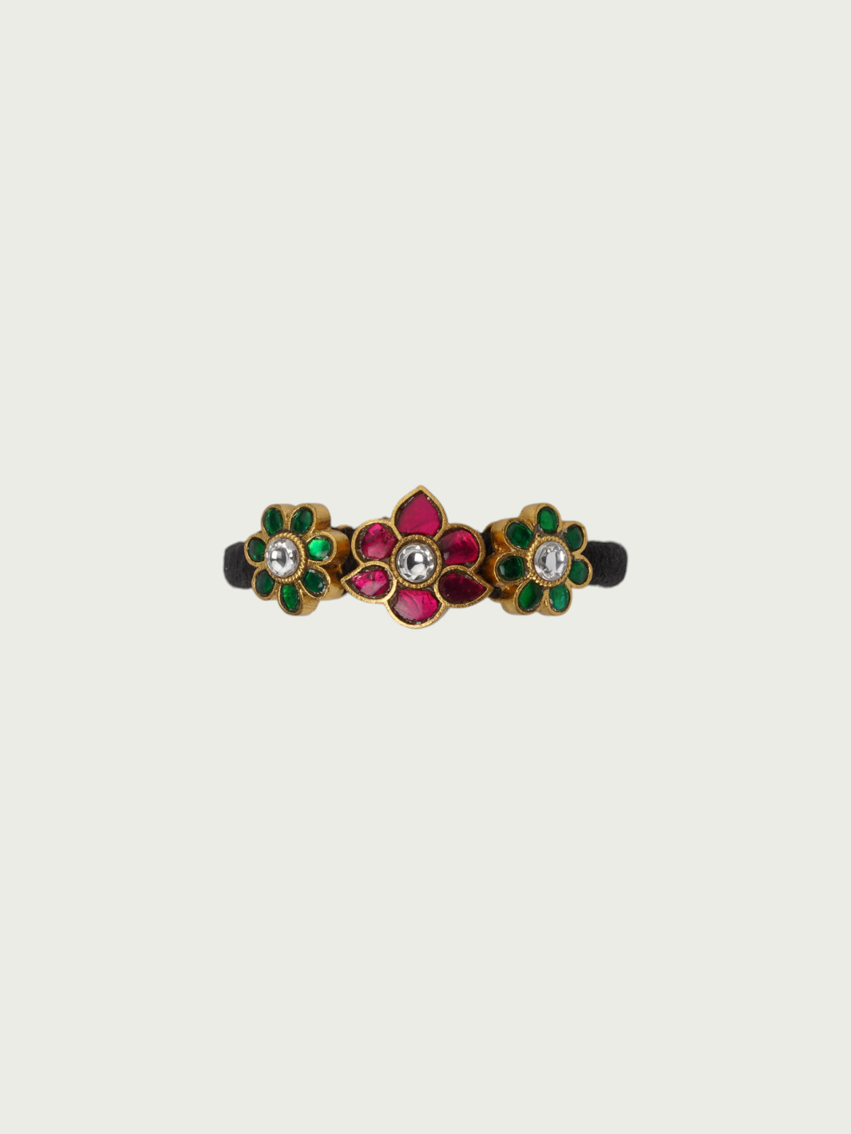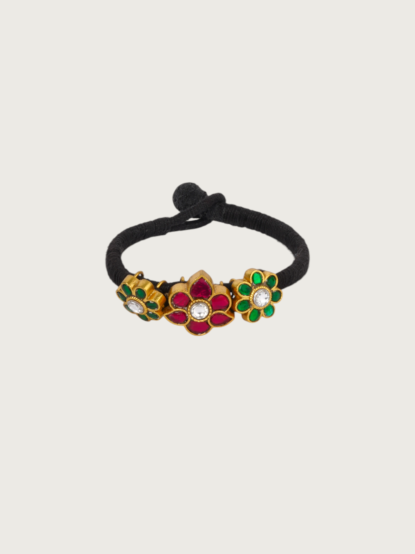 This vibrant gold-plated thread bracelet features a striking trio of floral motifs in red and green meenakari work, set against a black adjustable thread. Each flower is beautifully accented with a mirror-polish white stone at the center, offering an eye-catching contrast to the rich enamel tones. The design evokes a playful yet elegant charm, perfect for stacking or making a statement on its own. Lightweight and adjustable, it blends traditional craftsmanship with contemporary style effortlessly.