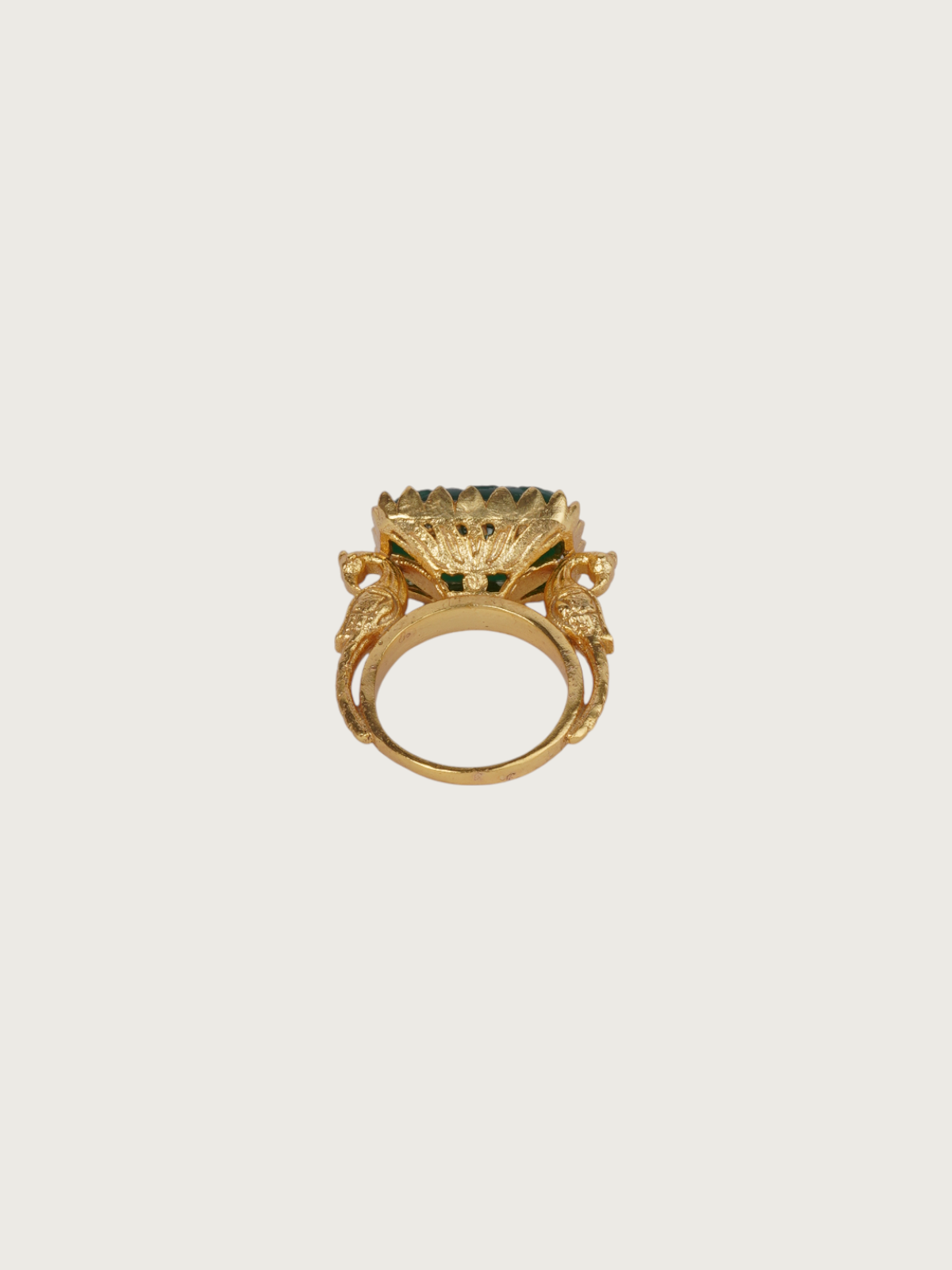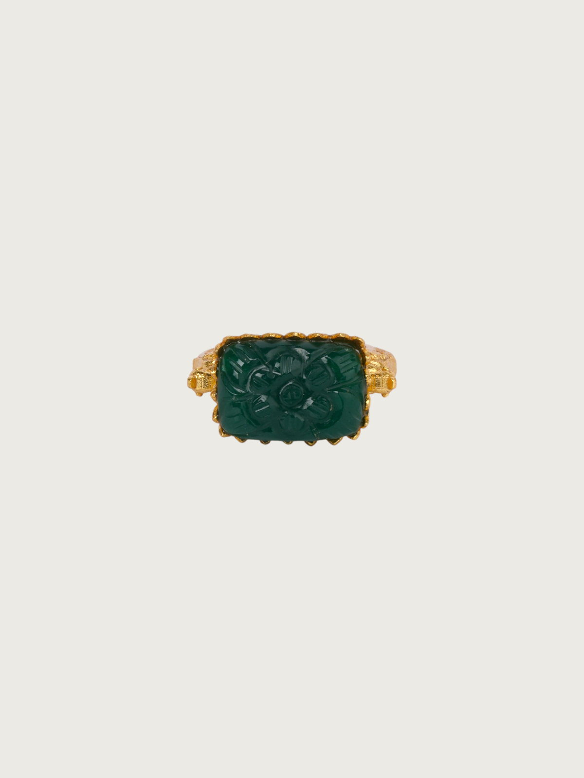 Bold yet regal, this statement ring is crafted with a central dak green stone surrounded by petal-shaped kundan detailing, exuding timeless beauty. The intricately carved green centerpiece is held in a gold-plated floral setting with rich antique-inspired textures along the sides and band. Whether worn solo or stacked with complementing pieces, it’s an elegant addition to your traditional or fusion wardrobe.