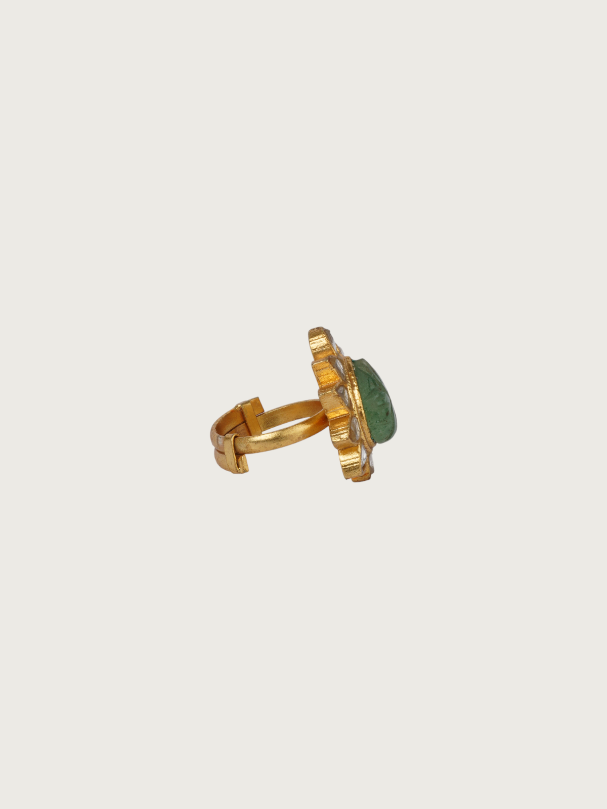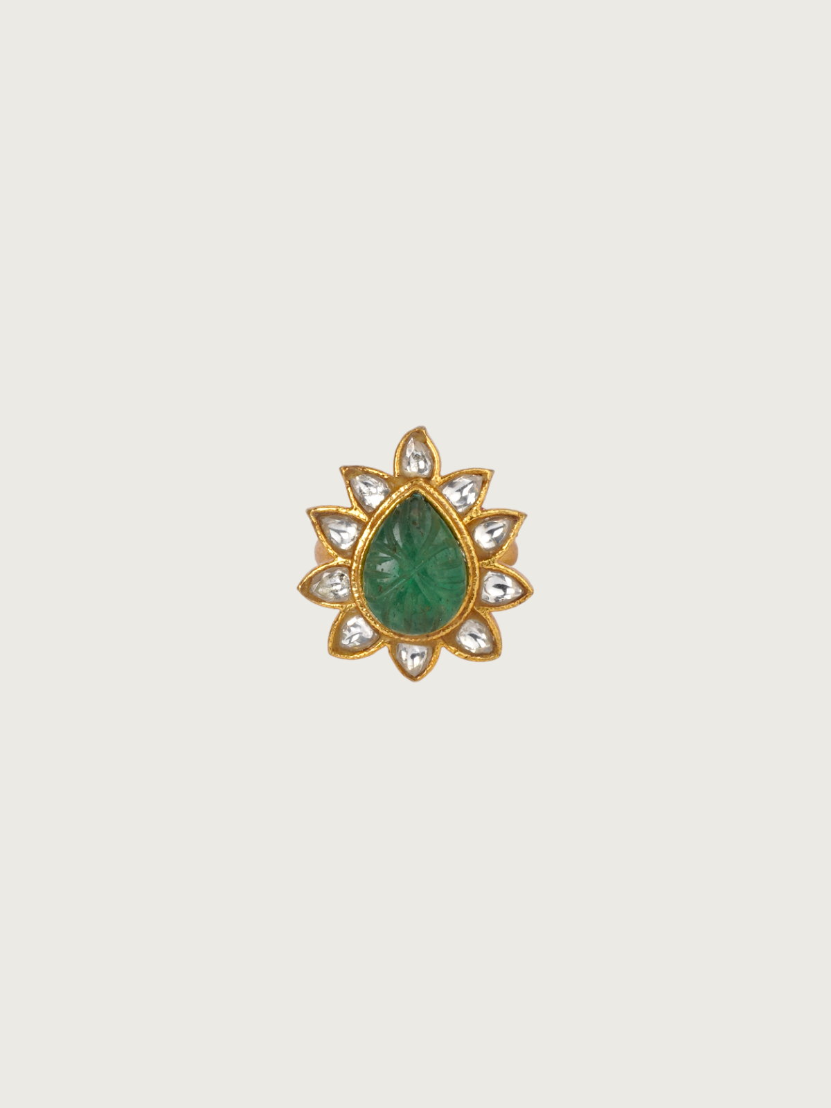 Blooming with charm, this lotus-inspired statement ring features a teardrop-shaped carved green stone at its center, surrounded by glimmering petal-shaped jadau accents in a floral silhouette. The exquisite detailing, paired with a radiant gold-plated finish, creates a delicate balance of tradition and boldness.