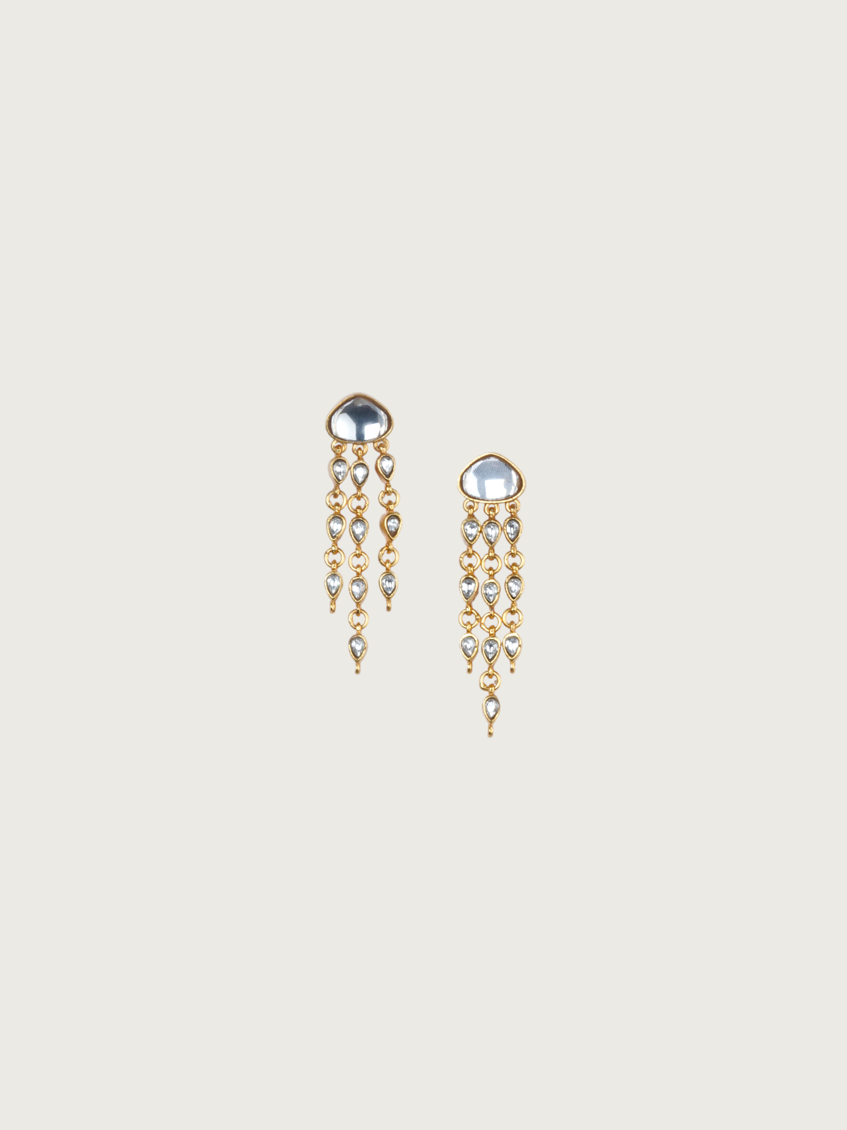 Add a graceful sway to your style with these exquisite gold-plated kundan drop earrings. Designed with a mirror-finish top piece and cascading lines of teardrop kundan stones, these earrings evoke a sense of fluidity and elegance. The chandelier-inspired silhouette creates a striking look while maintaining a delicate balance of tradition and modern minimalism.