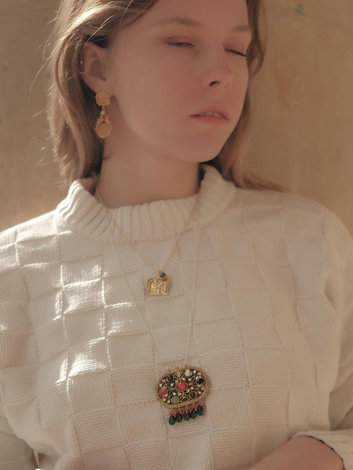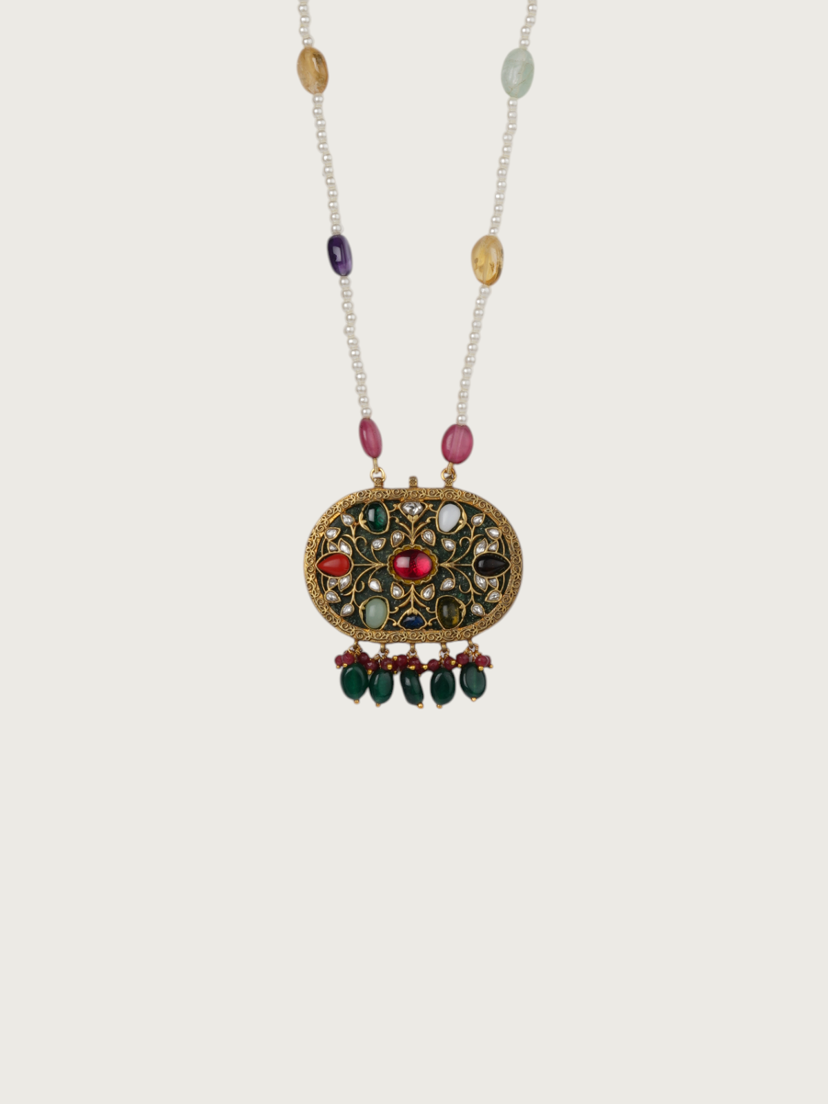 This regal oval pendant necklace showcases a captivating mix of deep green, red, and pearl-like stones set in an intricately crafted gold-plated frame. Inspired by Mughal royal jewels, the pendant features delicate hanging beads that add a touch of movement and elegance. A timeless piece to elevate any outfit with heritage charm.