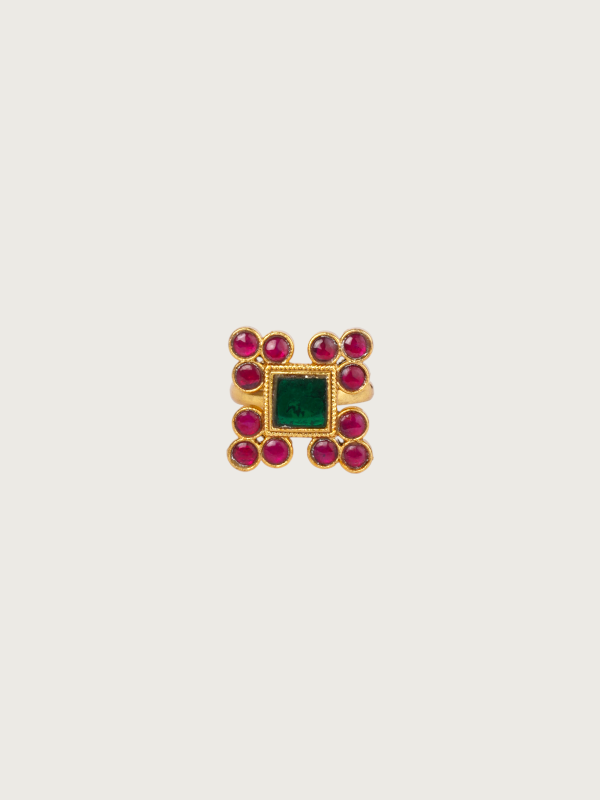 The Mughal Royal Square Ring is a regal statement piece, inspired by the grandeur of Indian royal jewelry. Designed with a bold square motif, this handcrafted ring features deep red and green detailing set in a gold-plated finish, creating an exquisite fusion of vintage charm and contemporary elegance.