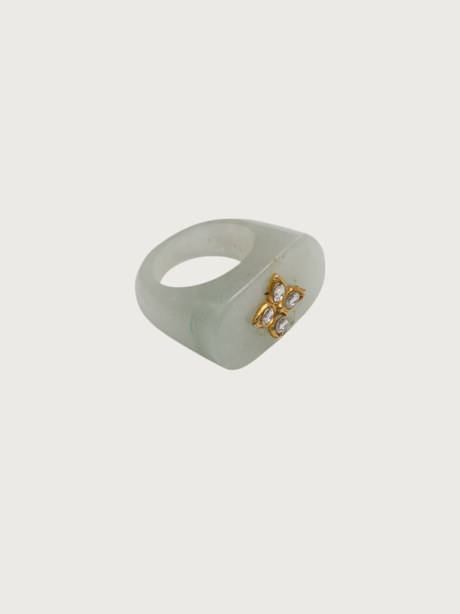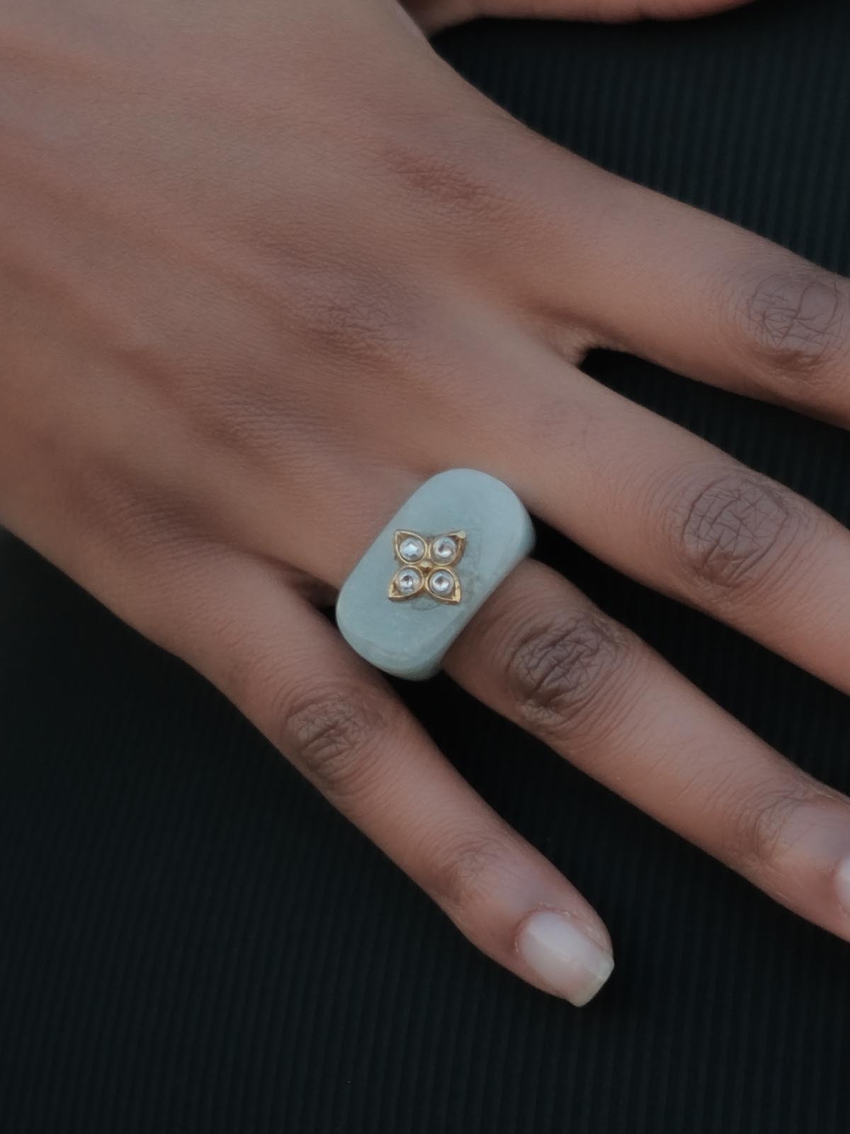 Timeless and elegant, this handcrafted green signet ring showcases Mughal-inspired floral detailing, accented with jadau stones in a gold-plated bezel. The smooth jade body brings a soft, natural charm, making this ring a modern heirloom with a vintage touch.