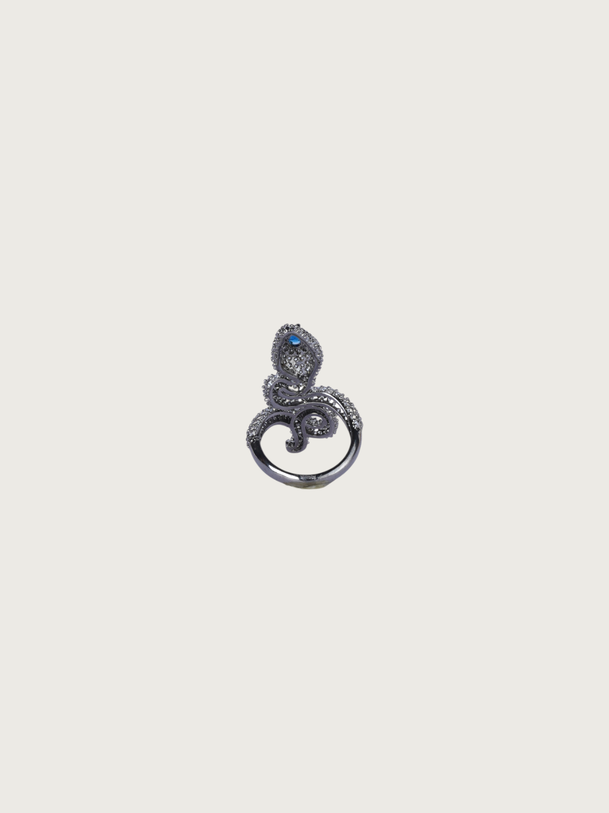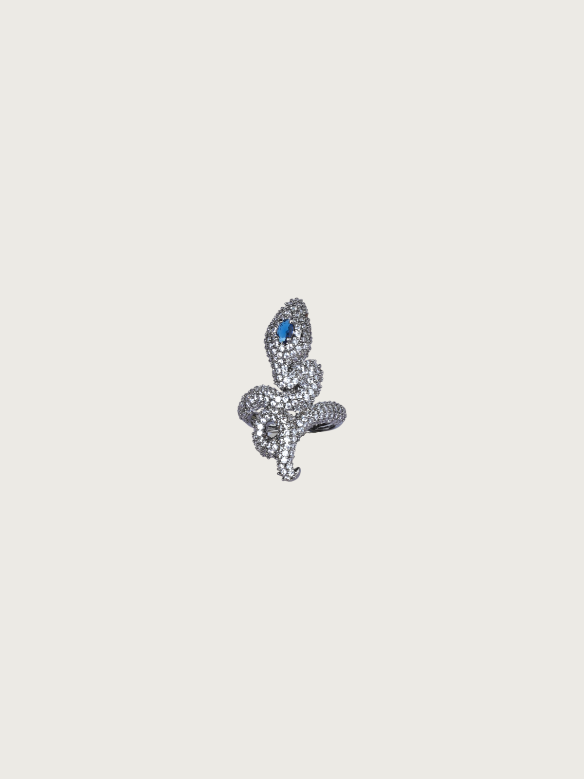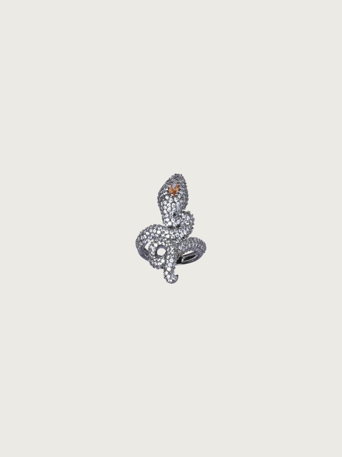 A dazzling embodiment of power and mystique, this silver snake ring is a head-turning addition to your statement jewelry collection. Fully encrusted with high-shine white crystals on a sleek silver-toned base, this design coils beautifully around your finger to create a bold silhouette. The striking serpent head is accentuated with a teardrop-shaped eye stone available in black, blue, and amber-orange, each adding a unique personality and intensity to the design.