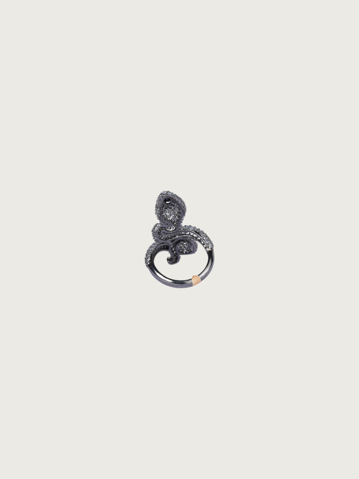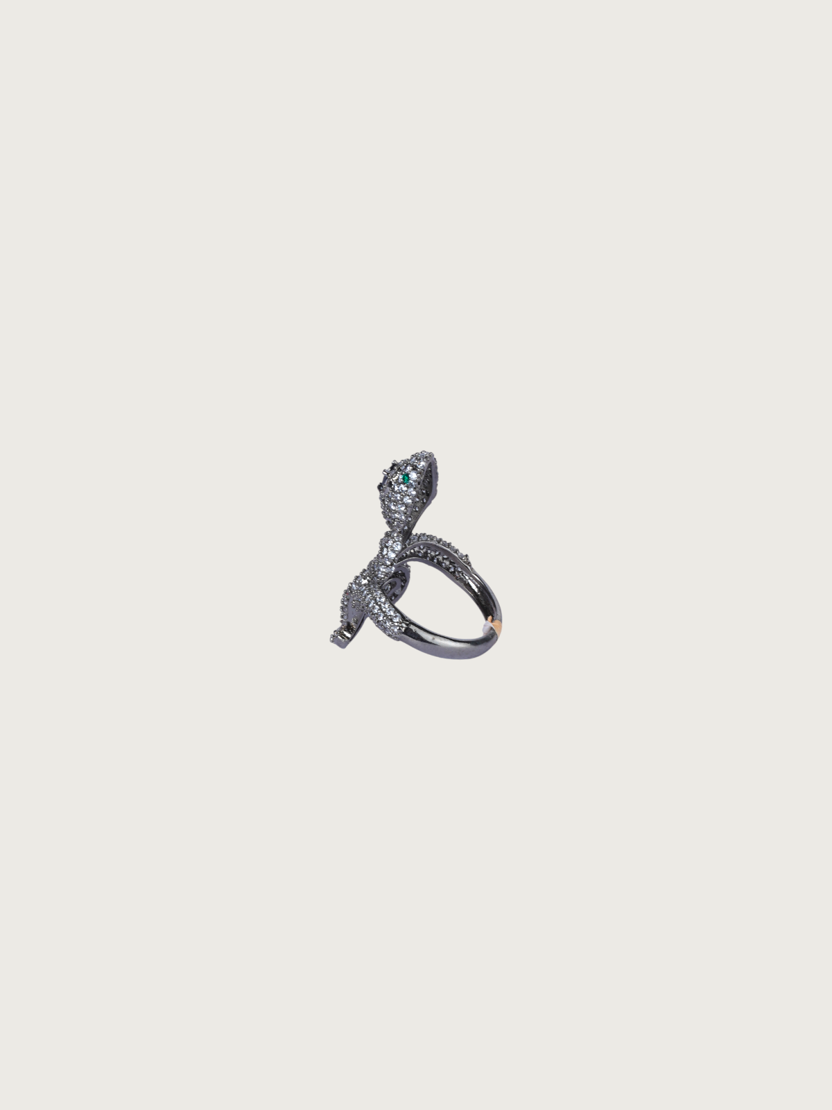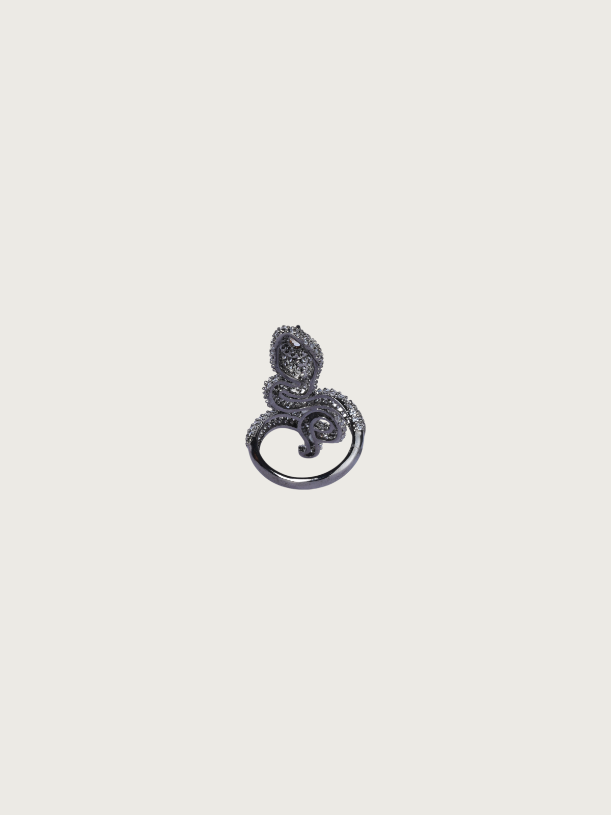 A dazzling embodiment of power and mystique, this silver snake ring is a head-turning addition to your statement jewelry collection. Fully encrusted with high-shine white crystals on a sleek silver-toned base, this design coils beautifully around your finger to create a bold silhouette. The striking serpent head is accentuated with a teardrop-shaped eye stone available in black, blue, and amber-orange, each adding a unique personality and intensity to the design.