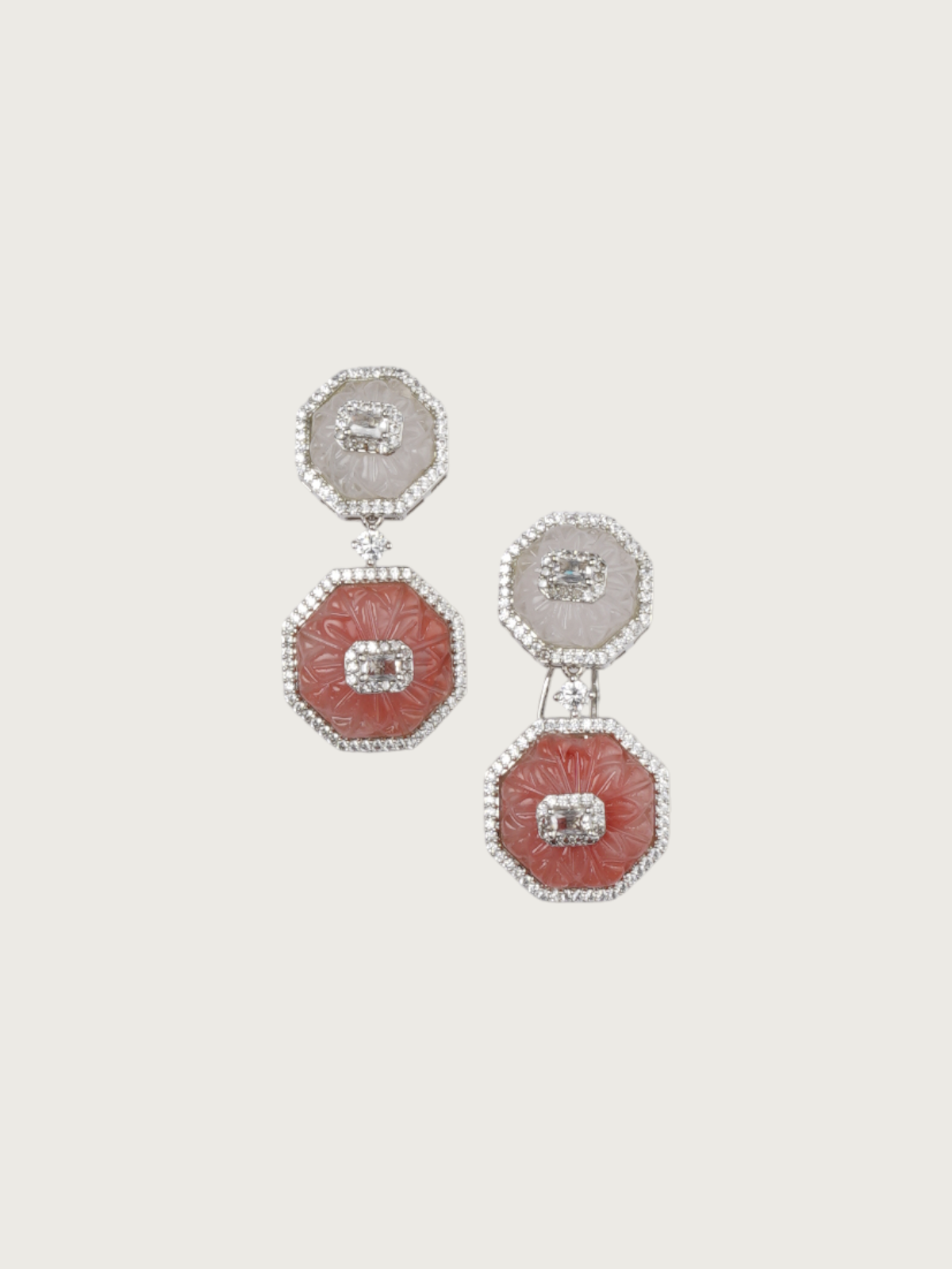 Celebrate symmetry and elegance with our OctaBloom Dual-Stone Carved Earrings — a harmonious blend of intricate artistry and timeless charm. These unique earrings feature a striking octagonal silhouette with a hand-carved floral pattern on each tier. The top half showcases a luminous white-toned base, contrasted beautifully by either a soft blush pink or a muted beige tone on the bottom tier.