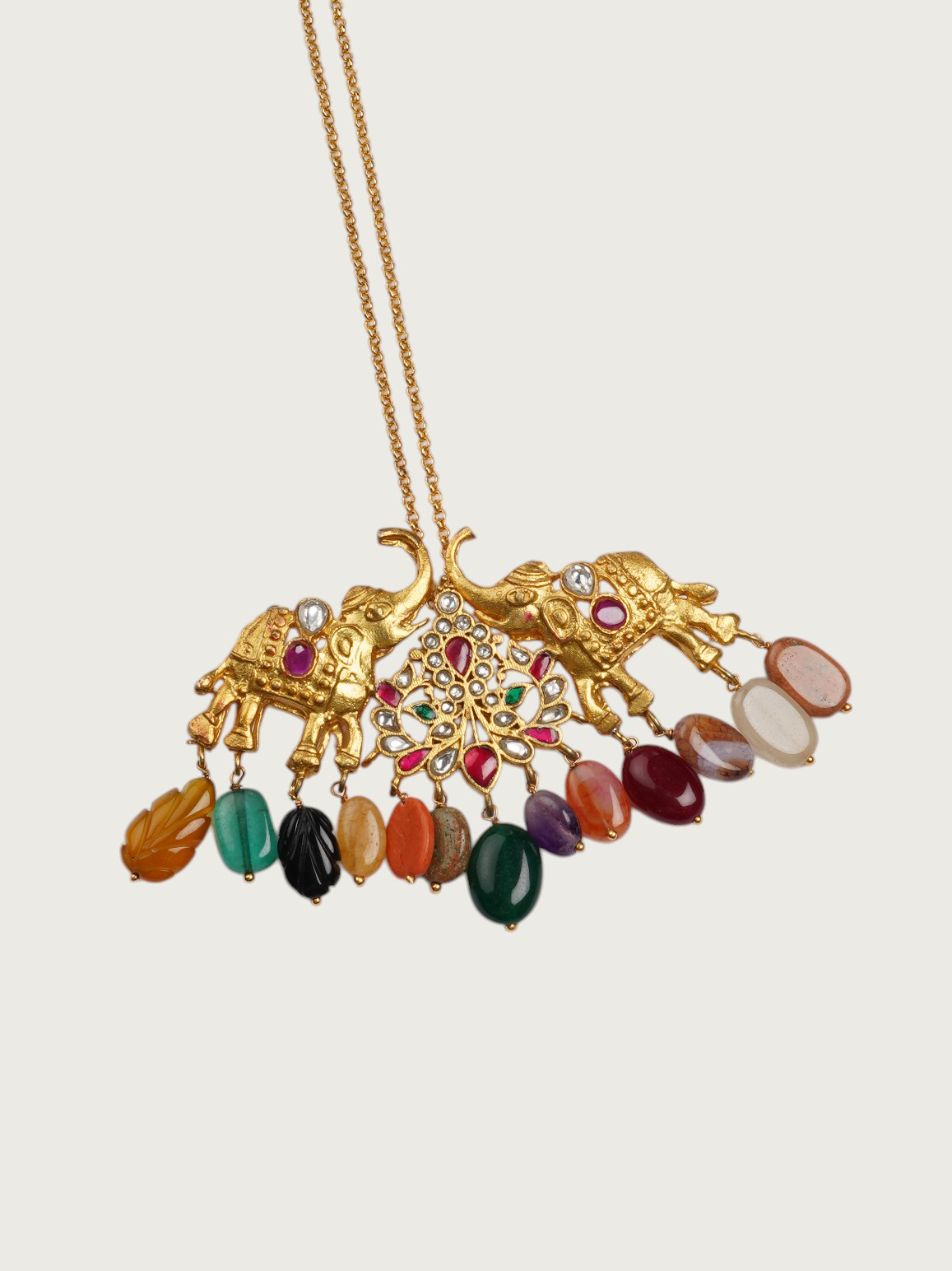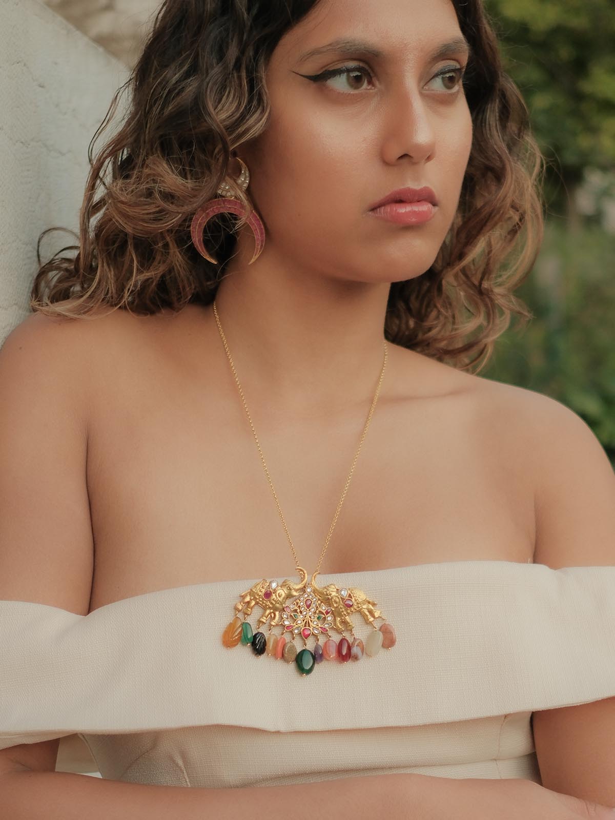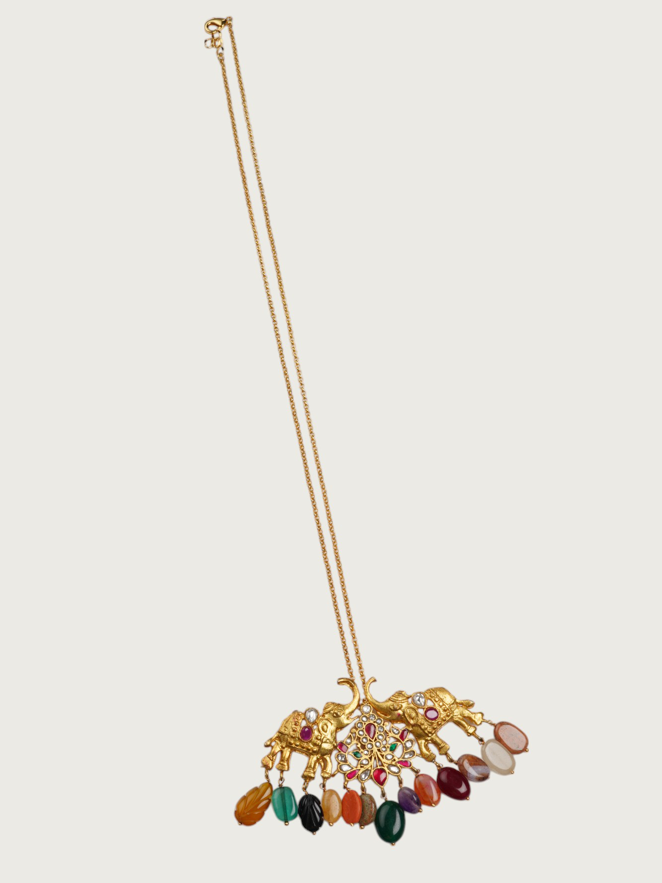 The Elephant Charm Drop Necklace by Tver features a majestic design with intricately carved gold-plated brass elephants and vibrant dangling beads. Inspired by royal Indian motifs, this necklace brings a playful yet elegant charm to your jewelry collection, making it a timeless statement piece.