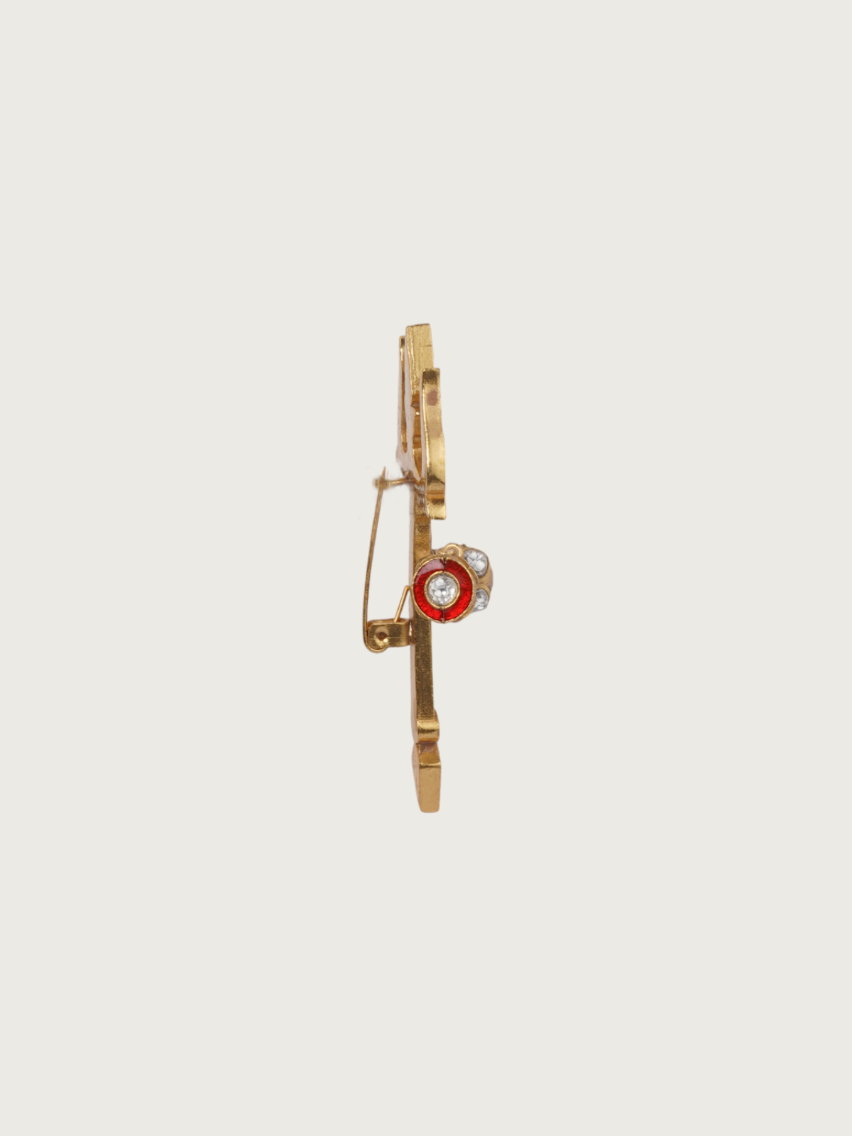 Channel strength and sacred symbolism with this gold-plated Trishul brooch, exquisitely crafted with hand-set kundan stones. Featuring a powerful trident silhouette with a delicate damru at its center, this brooch brings together traditional motifs and elegant sparkle. The kundan embellishments reflect light beautifully, making it a statement of both style and cultural reverence.