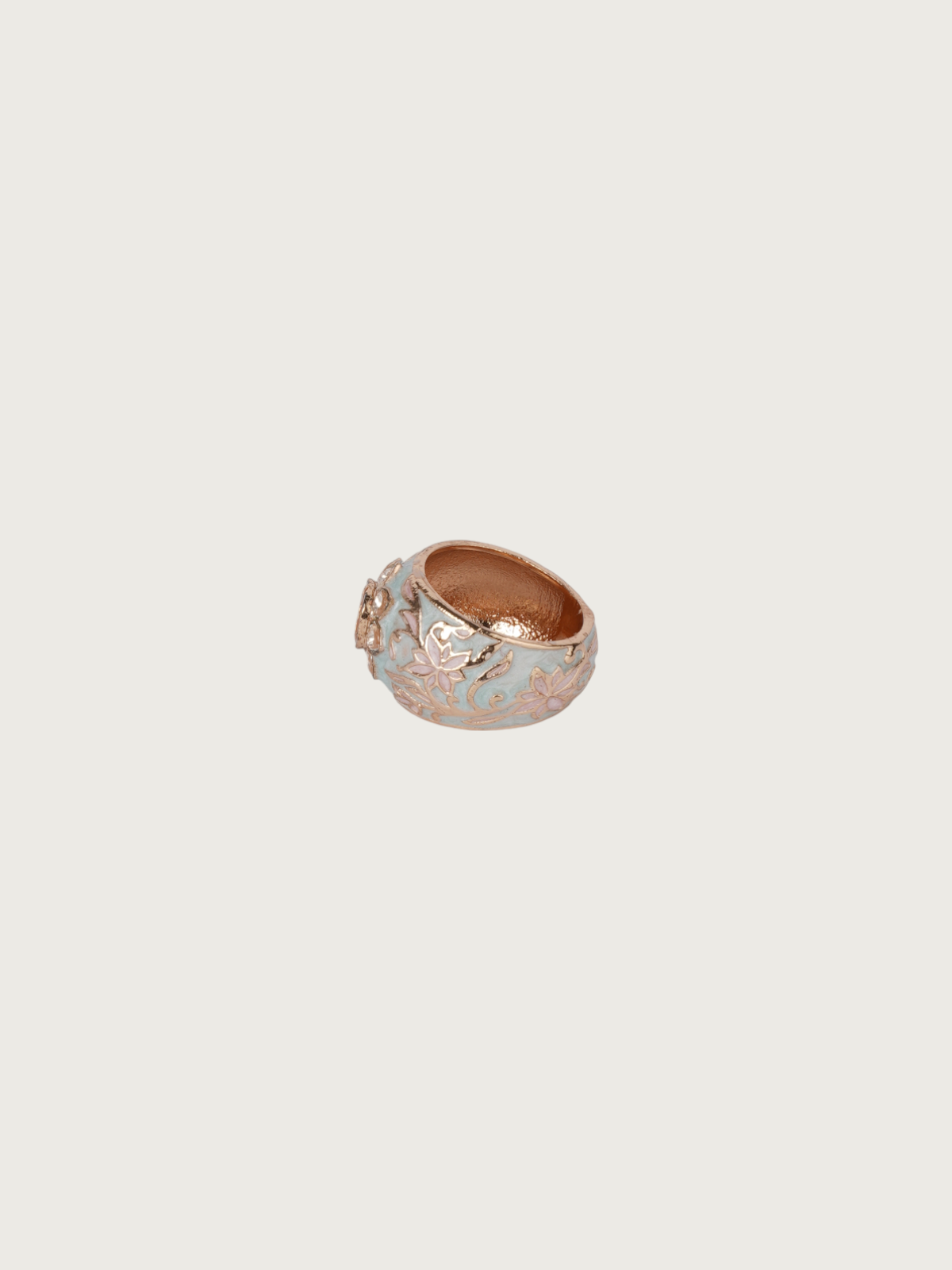 This ring blends tradition and simplicity — its soft colors and smooth contours make it a perfect statement piece that feels both timeless and contemporary. Crafted in brass with enamel detailing and kundan-style embellishments.