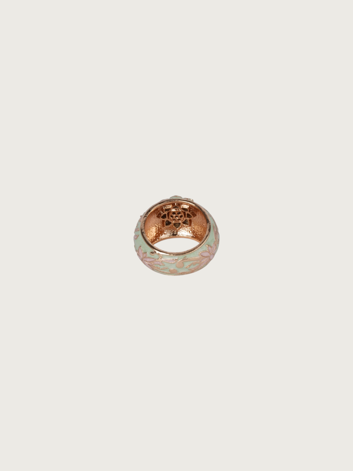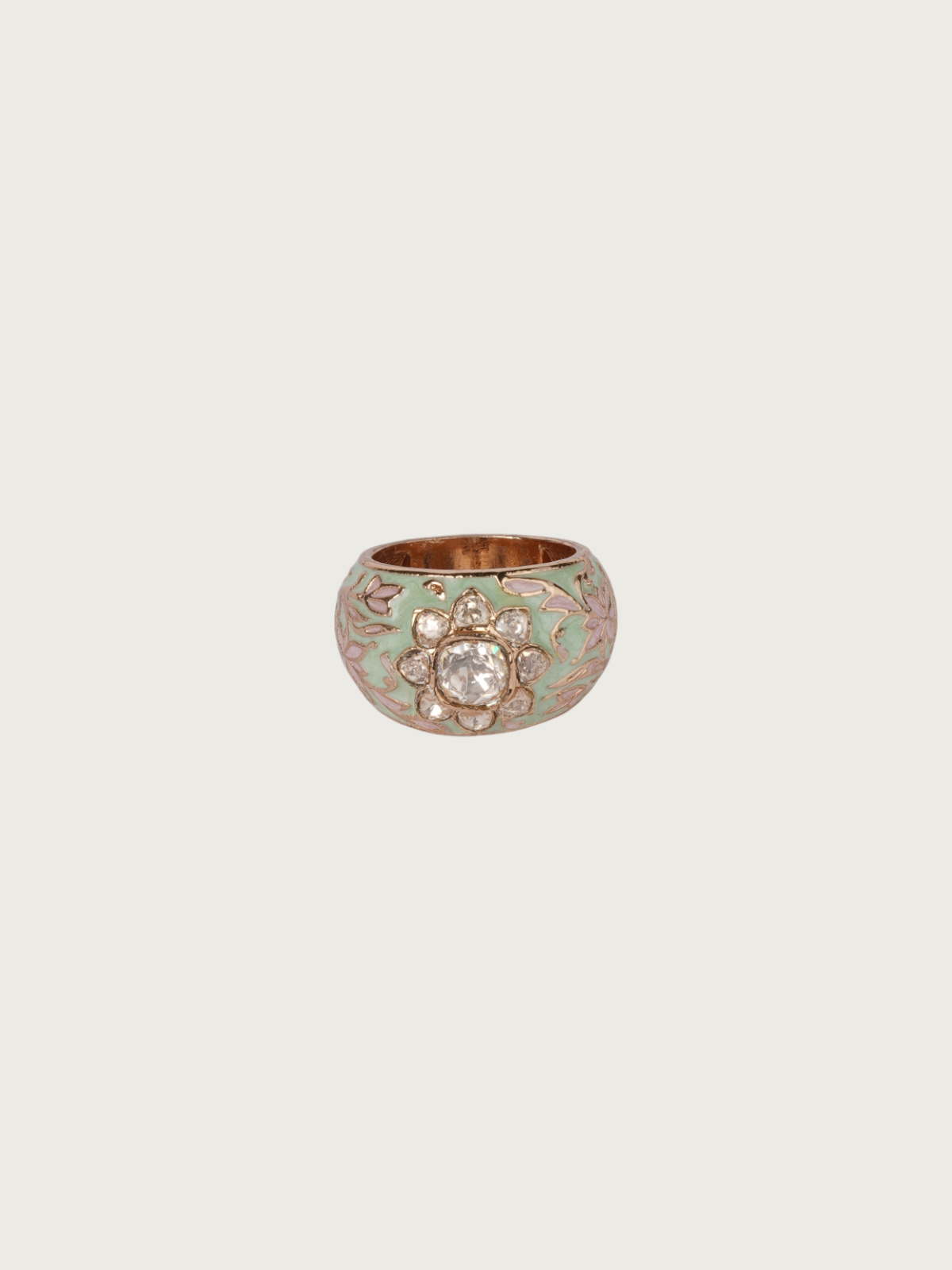 A handcrafted gold-plated band ring featuring pastel enamel work and a kundan-style floral motif at the center. The intricate meenakari detailing in soft mint and blush tones evokes the elegance of Mughal artistry, while the broad band form lends a bold, sculptural touch.