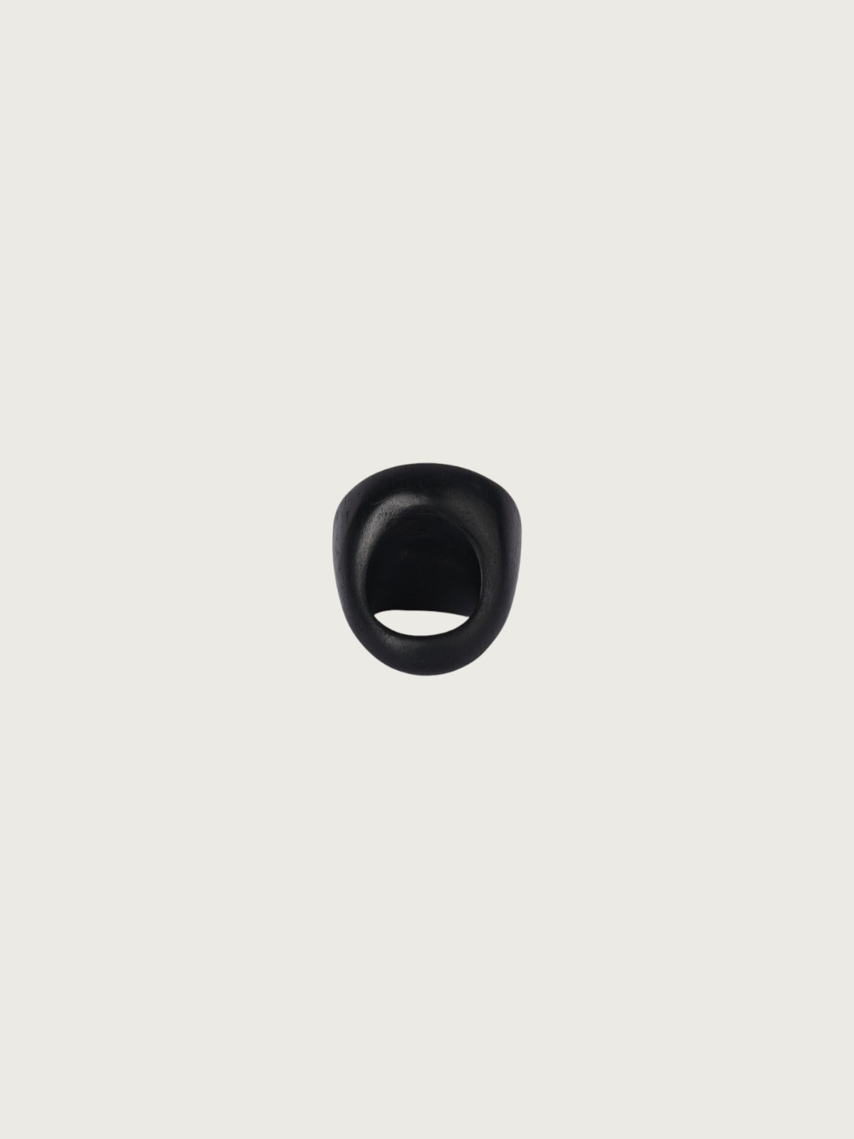 A bold handcrafted ring featuring a circular black base adorned with a vibrant mix of red, green, and white kundan-style stones. The design beautifully contrasts the deep matte base with the lustrous gold-plated setting, creating a fusion of modern minimalism and traditional Indian craftsmanship.