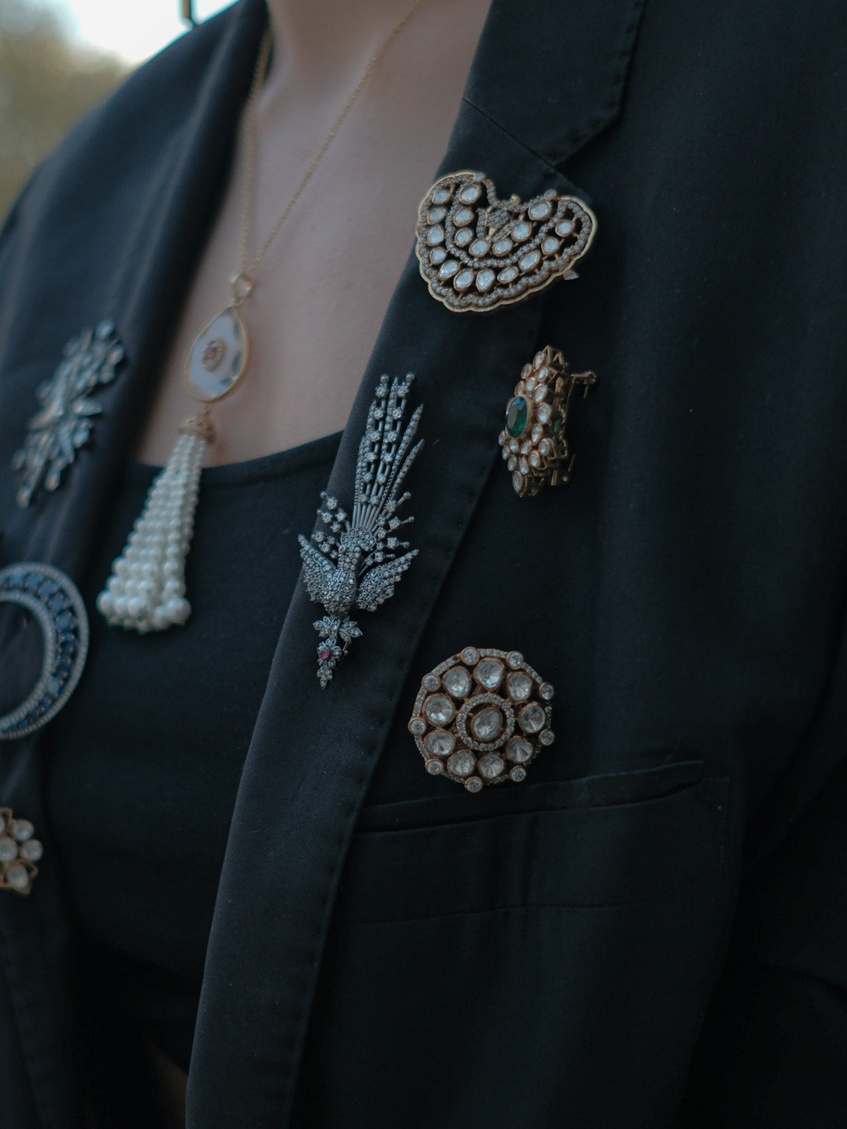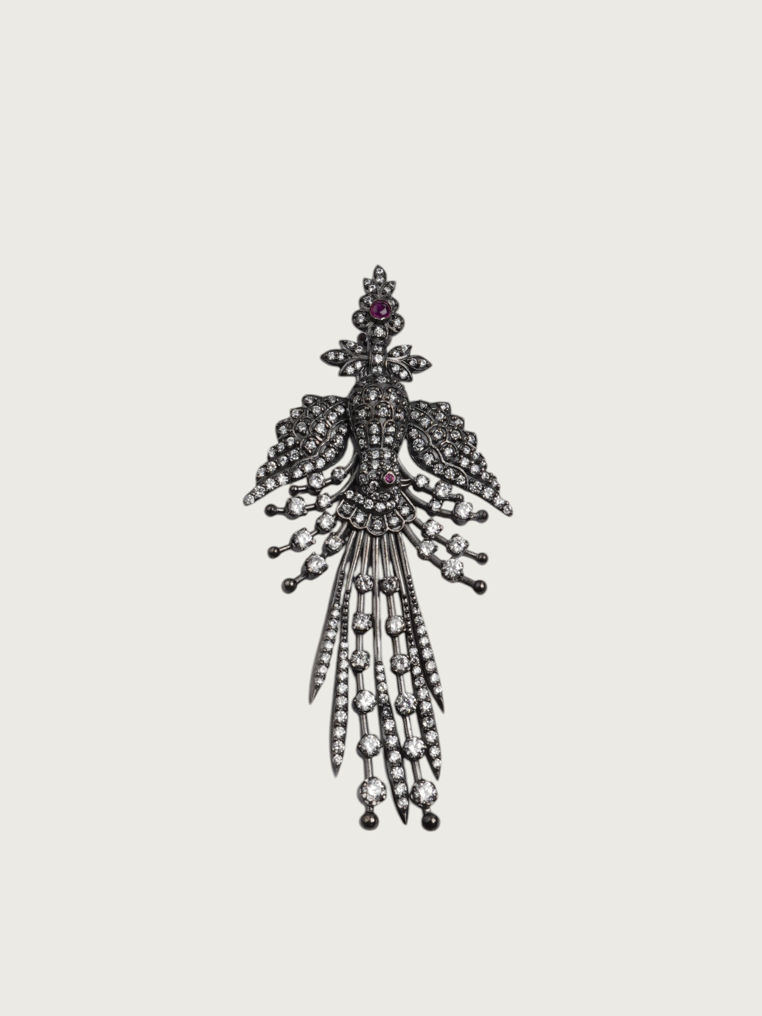 The Royal Phoenix Brooch by Tver showcases the grace of a soaring phoenix with its cascading tail and detailed design. Handcrafted from 925 Silver with clear crystal accents and a subtle touch of purple, this piece adds elegance to any outfit. Inspired by royal Indian artistry, it’s a timeless statement accessory.
