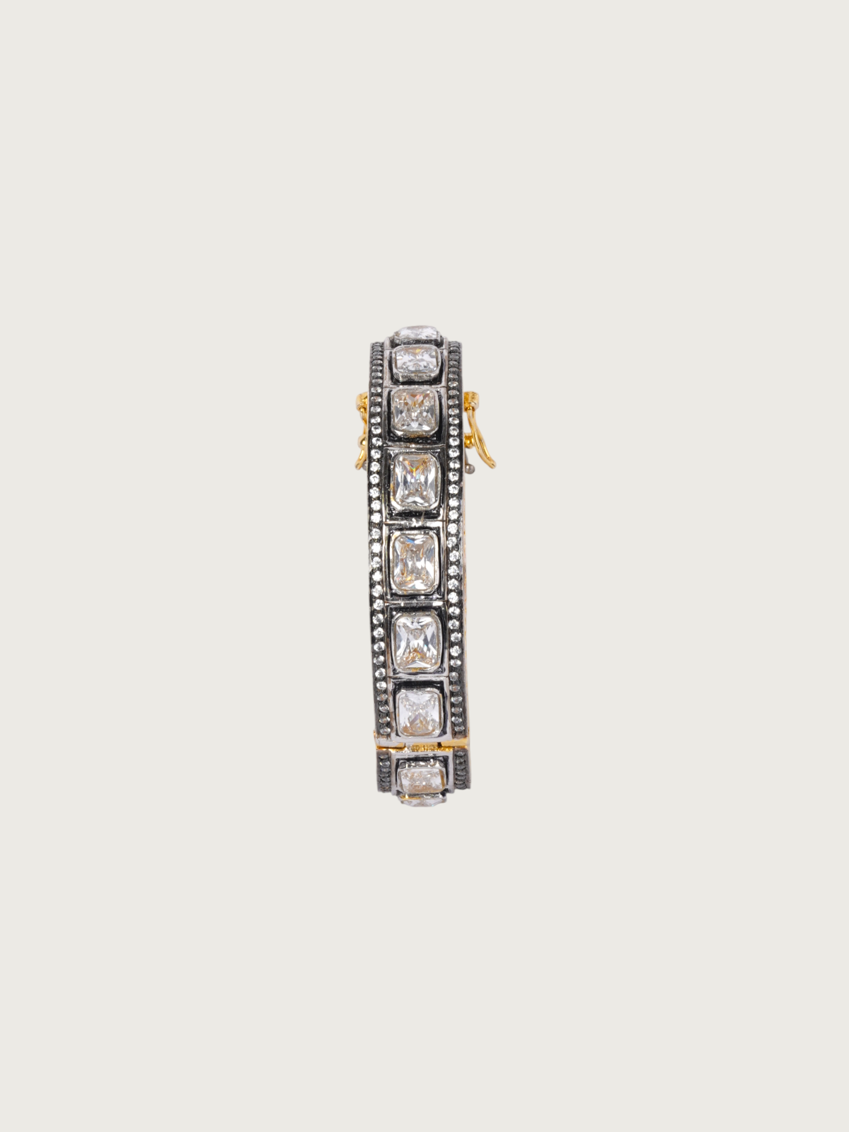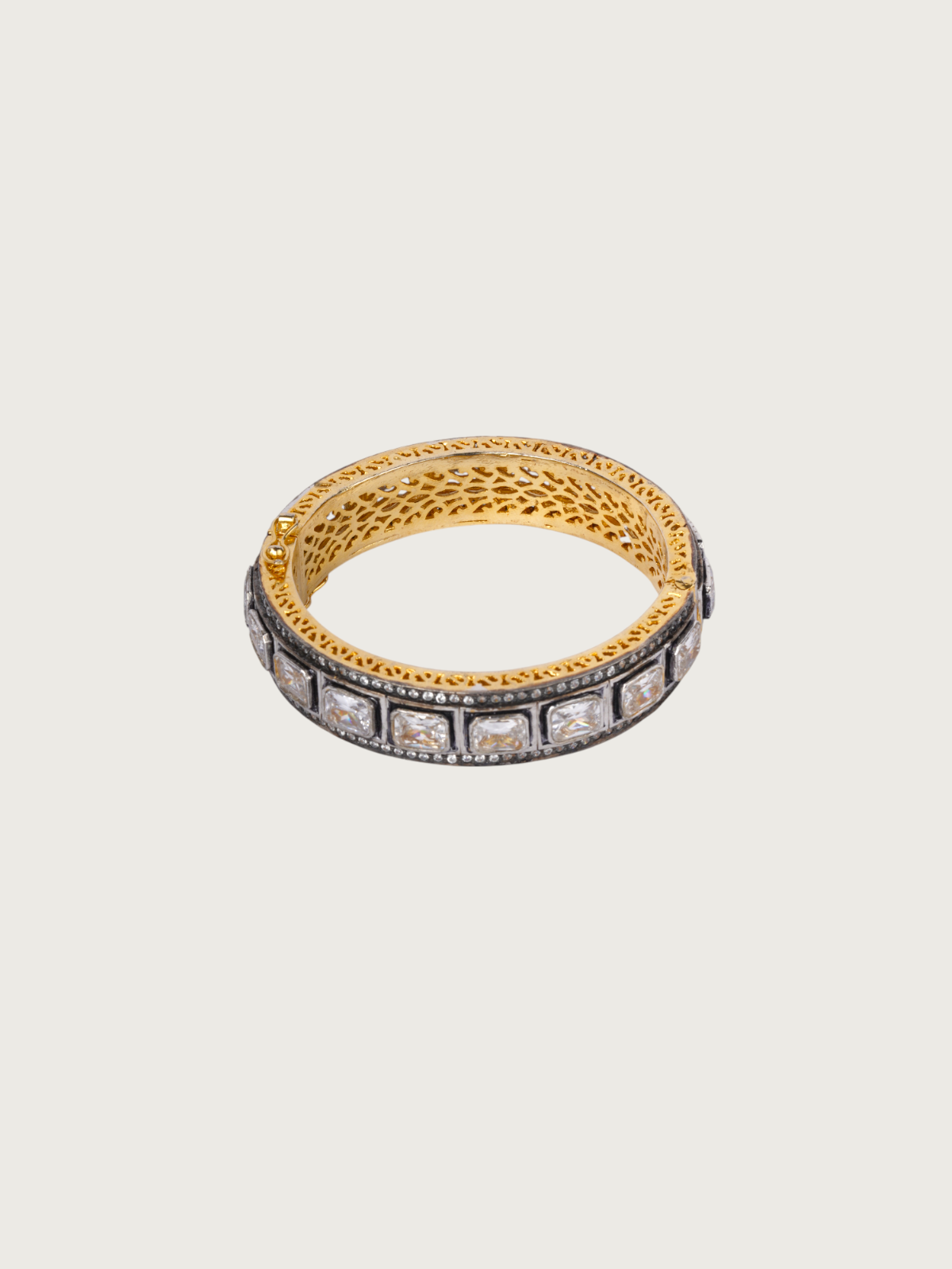 A refined balance of geometry and artistry, this Tver gold-plated bangle highlights the timeless appeal of square-cut polki detailing. The design features alternating panels of white stones set against an oxidized silver finish, framed by delicate borders that add a hint of brilliance.
