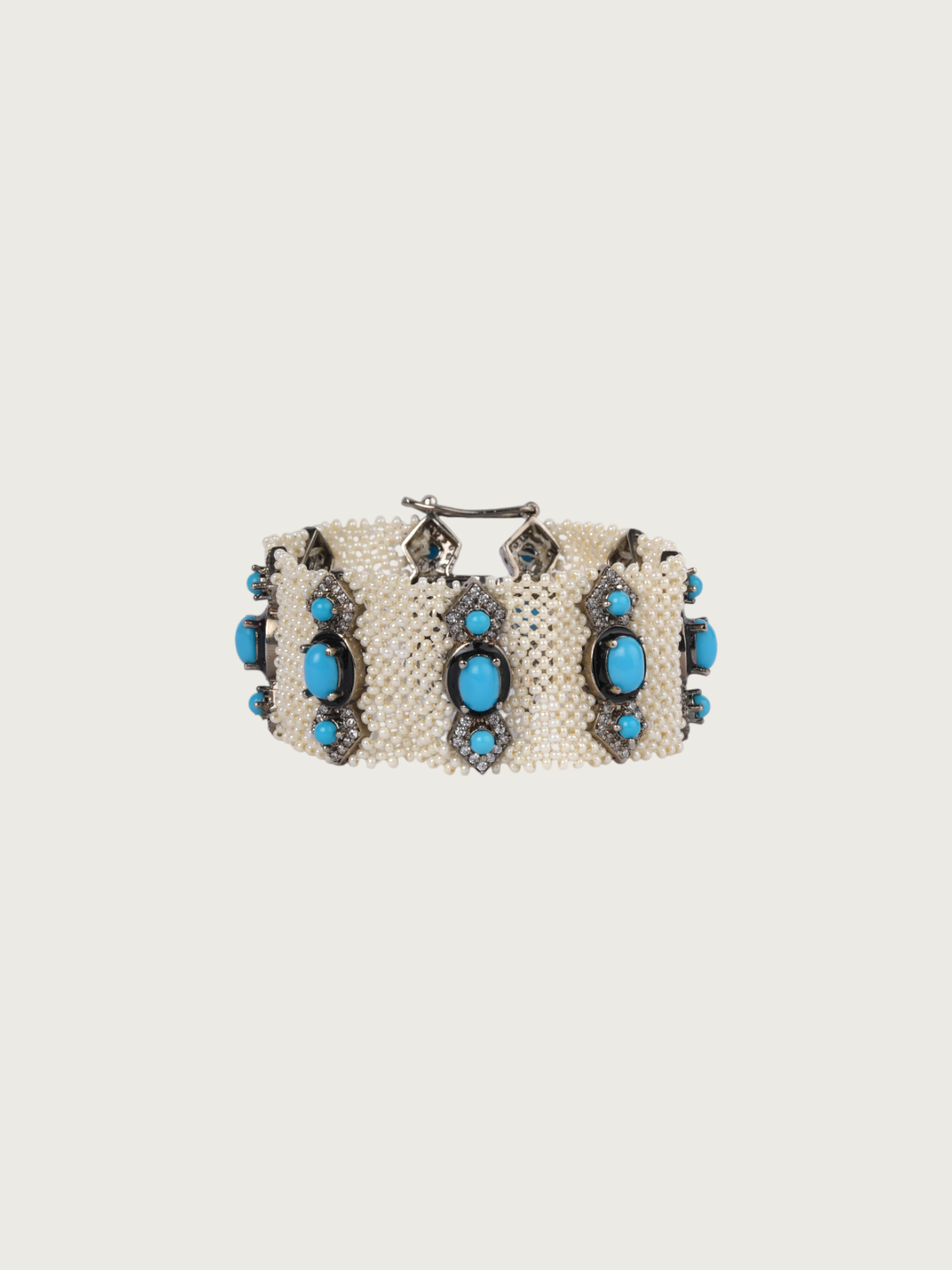 An exquisite statement of craftsmanship, this Tver bracelet combines the timeless beauty of pearls with the striking allure of blue stones. Each link is set in a fine oxidized silver finish, creating a design that is both classic and contemporary. The intricate detailing adds sophistication, making it perfect for an elegant yet modern wrist accent.