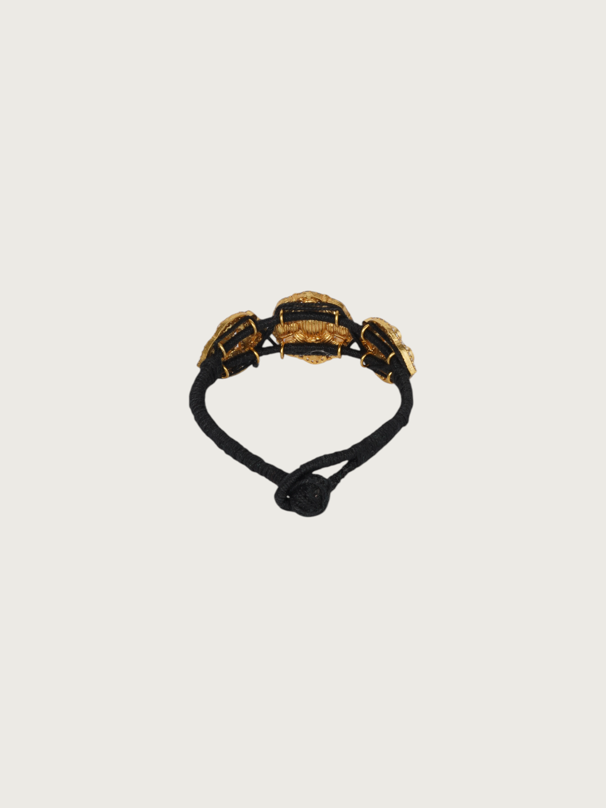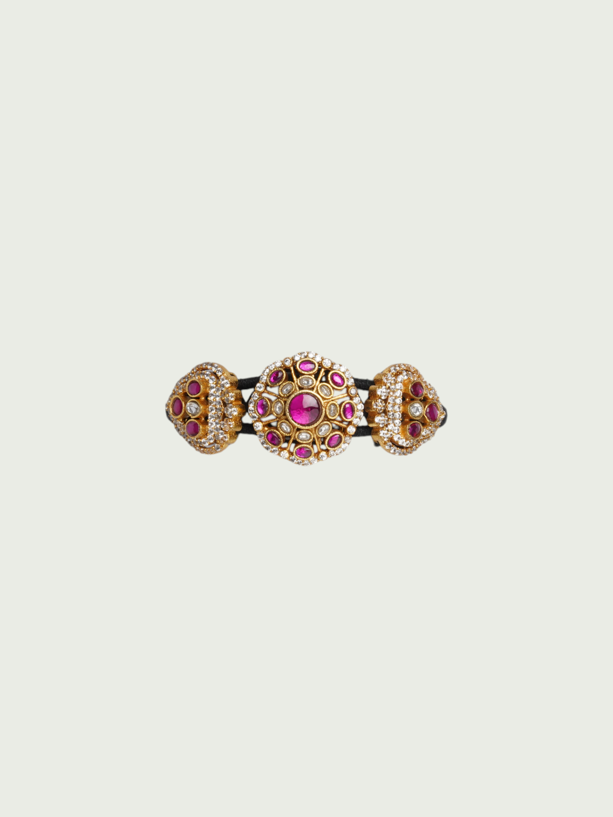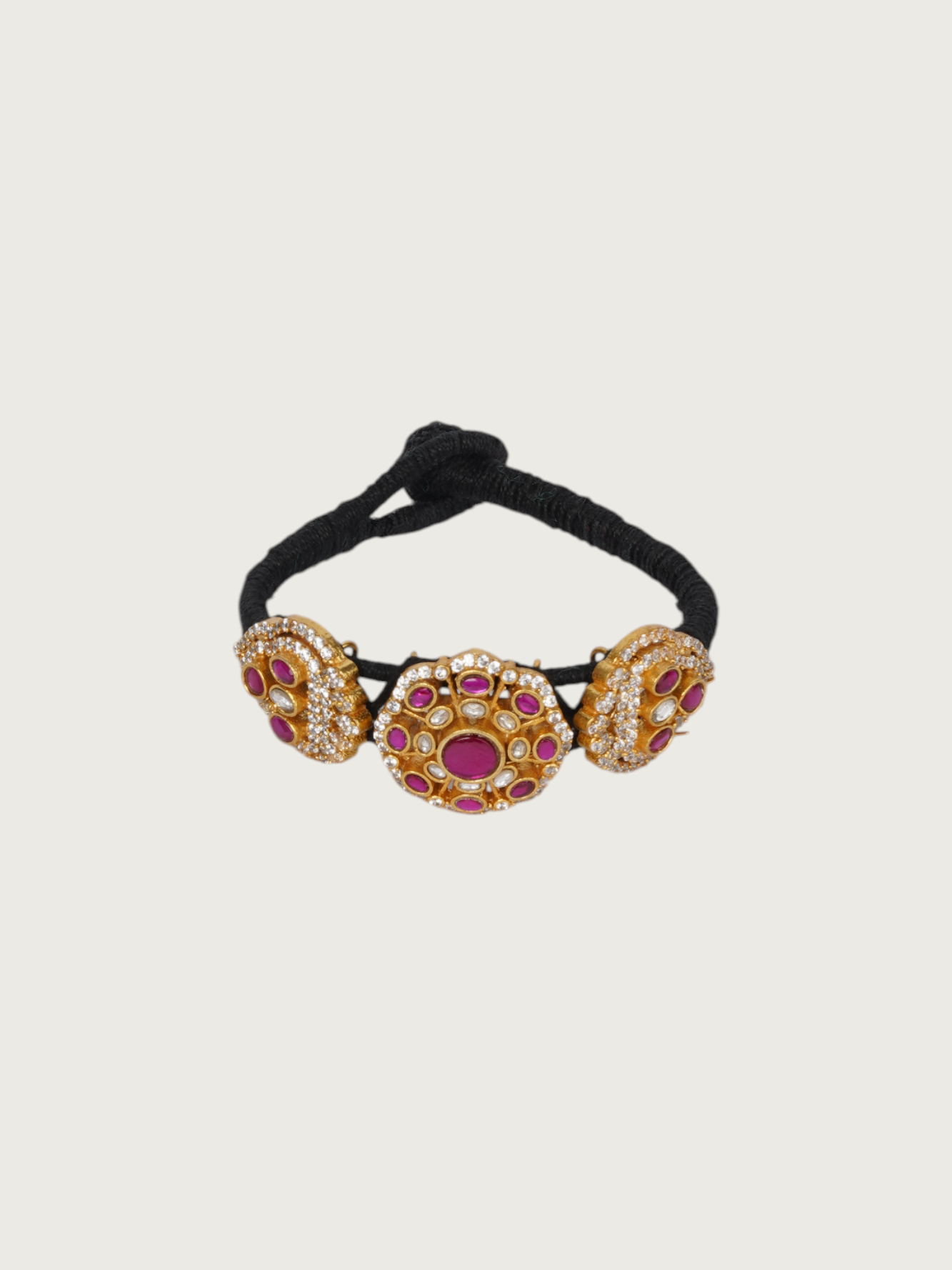 Embrace timeless grace with this gold-plated pink dome bracelet from Tver. Crafted with a black cotton thread base, this piece features three exquisite domed elements studded with ruby-toned and white stones, arranged in an intricate polki-style pattern. The center dome draws attention with its large pink centerpiece, encircled by a floral layout of tiny polki-like sparkles. A perfect blend of traditional charm and statement appeal, this handcrafted bracelet adds a royal touch to your wrist stack or stands stunningly on its own. Ideal for those who appreciate rich heritage aesthetics with bold colour contrasts.