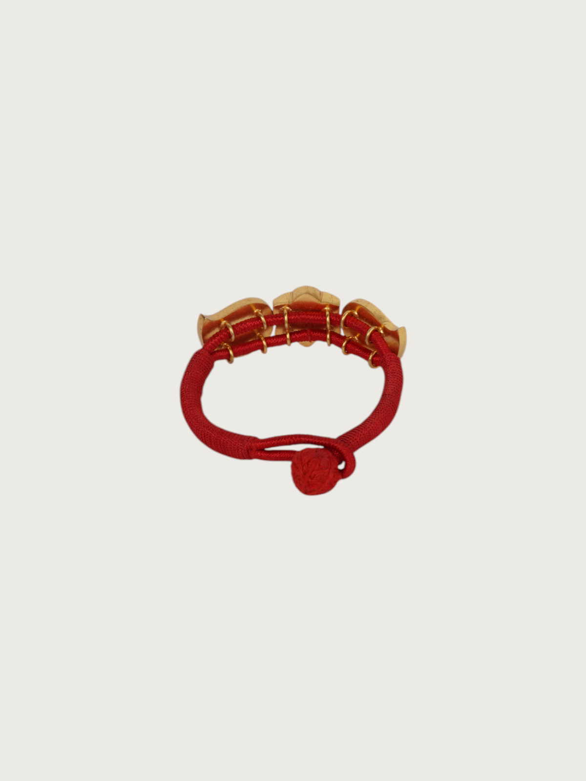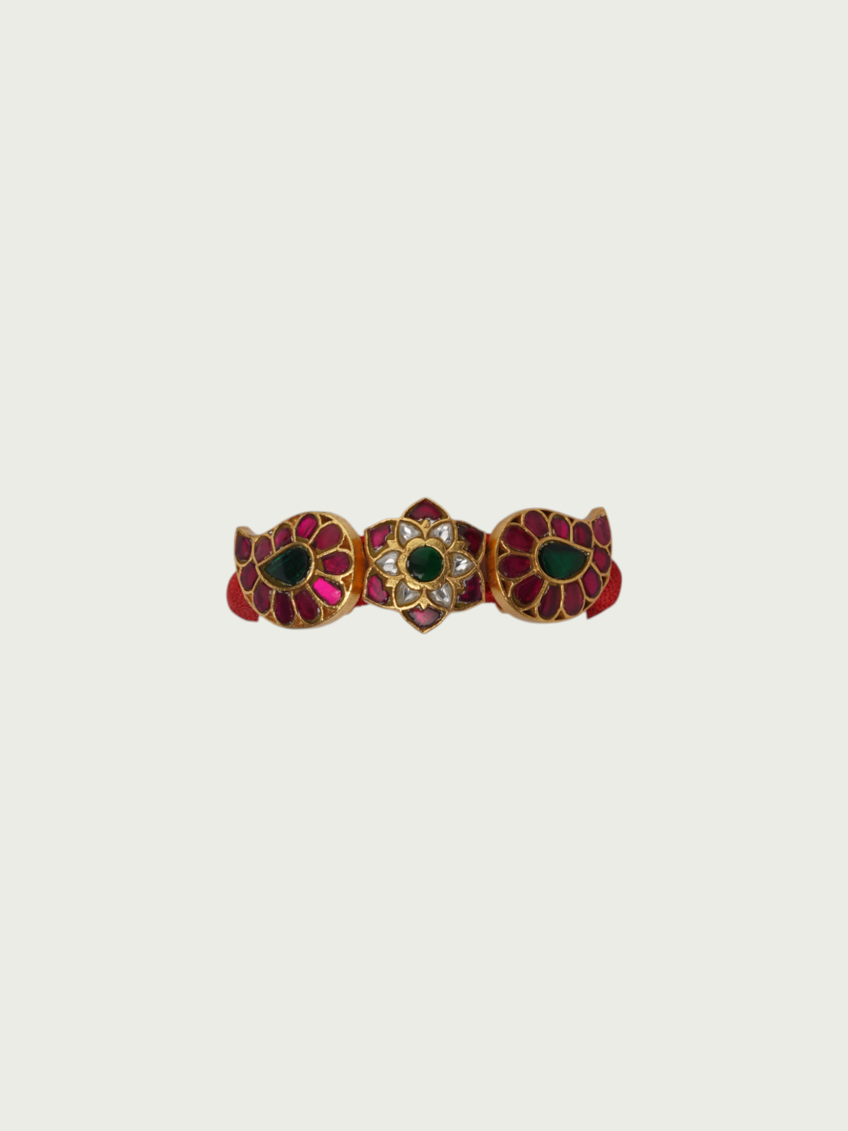 This handcrafted bracelet features a captivating blend of traditional jadau artistry and vibrant color. The central floral motif in green and white is flanked by two petal-style side elements with red and green detailing, all set in a radiant gold-plated finish. The adjustable red thread not only offers a secure fit but also enhances the overall traditional charm of the piece.