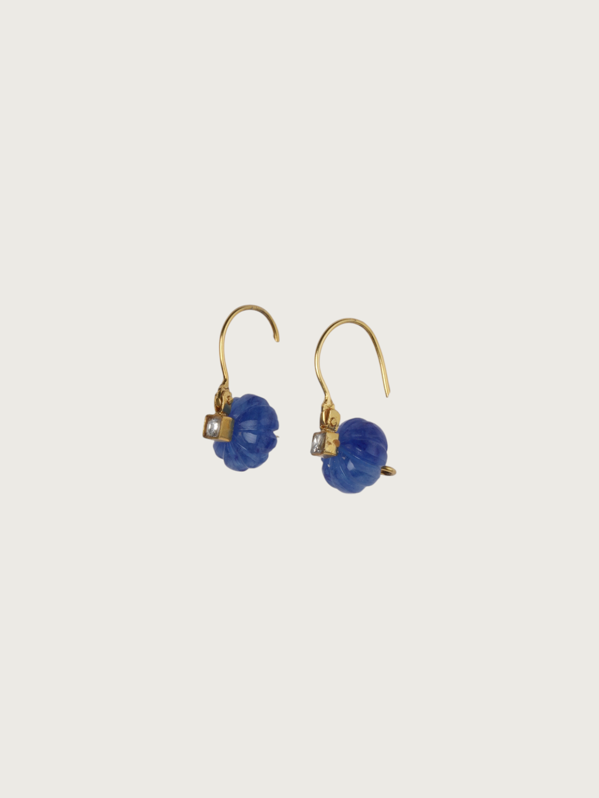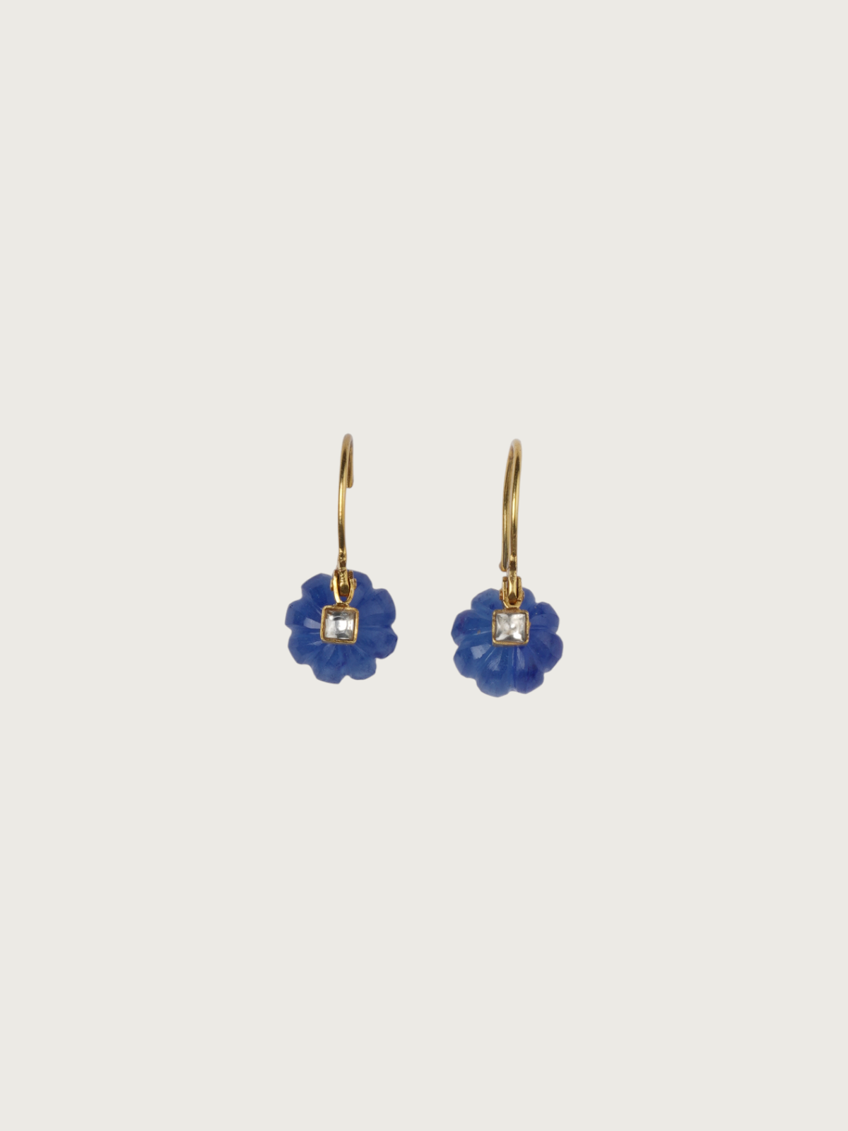 These handcrafted gold-plated earrings showcase an elegant simplicity with a carved blue floral drop paired with a delicate square white accent. The rich hue and sculptural texture create a look that’s both artistic and timeless.