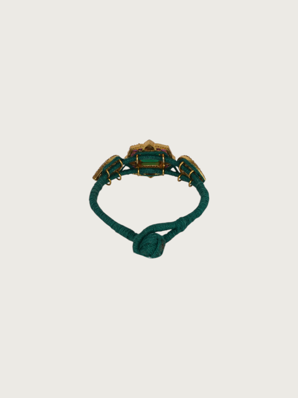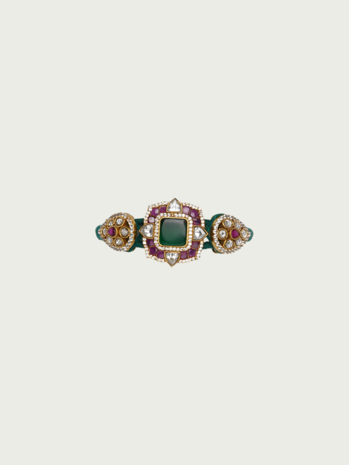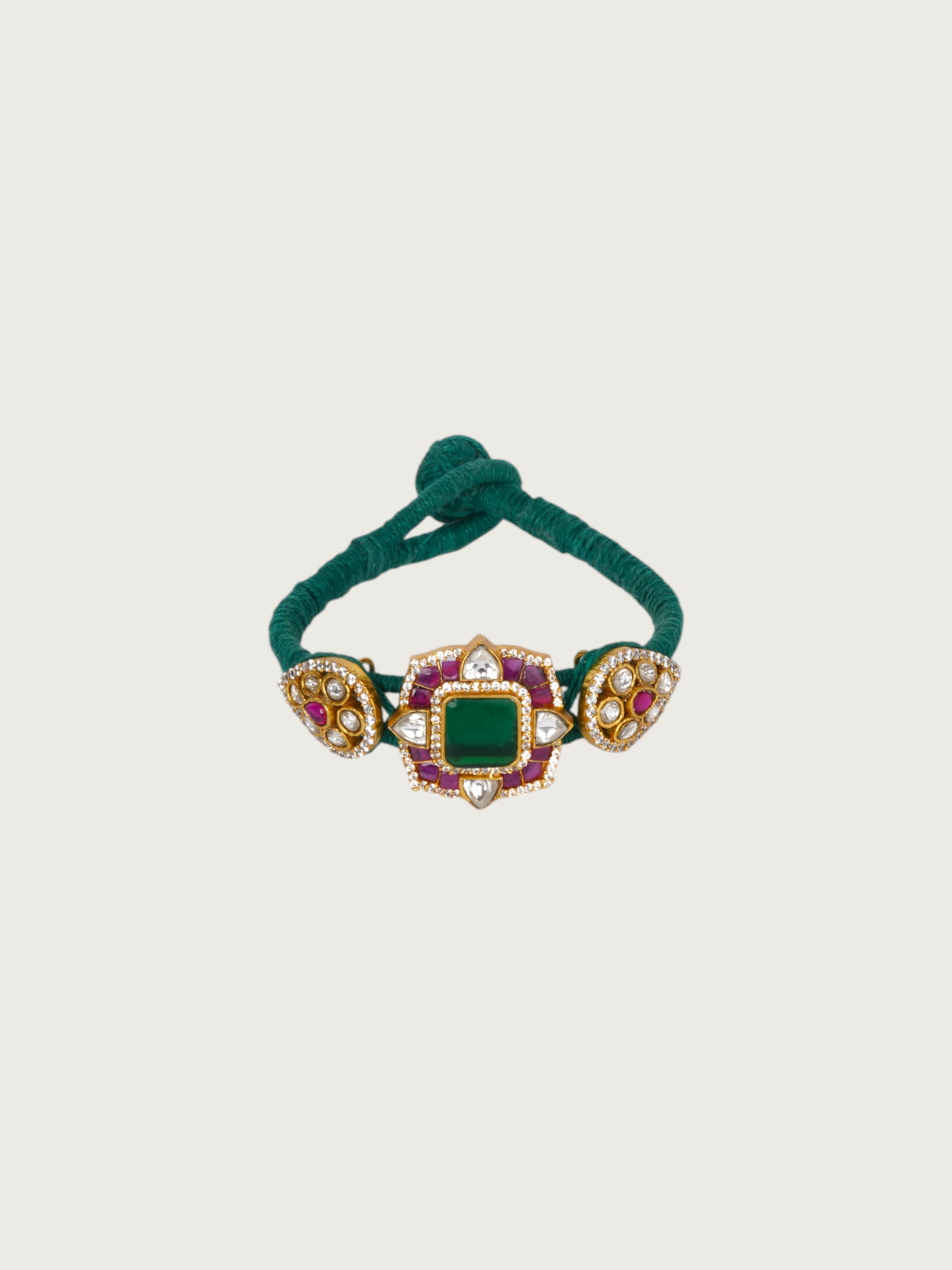 Add a bold yet graceful touch to your look with this green kundan bracelet. Featuring a square green centerpiece set in a jadau-style gold-plated frame, it is flanked by twin floral motifs adorned with pink and champagne-toned kundan work. The deep green thread wrap adds a vibrant contrast, making it perfect for statement layering or standalone wear.