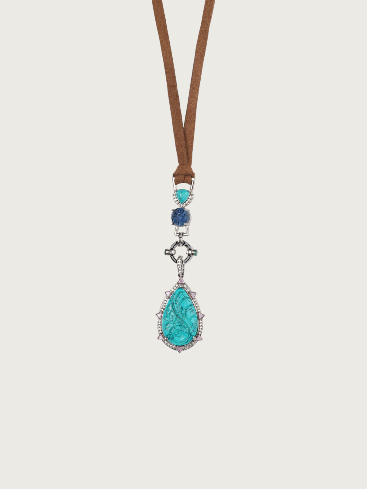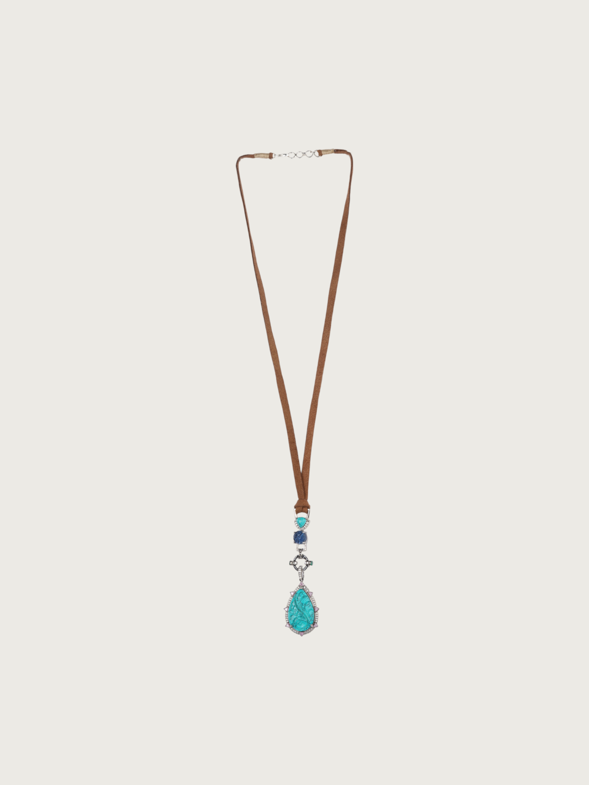 Elevate your look with this one-of-a-kind necklace featuring a beautifully carved drop-shaped teal pendant necklace in a silver-toned frame with delicate white stone accents. The pendant is suspended from a rich brown suede cord, adorned with intricately detailed blue and turquoise beads that add depth and charm to the composition.