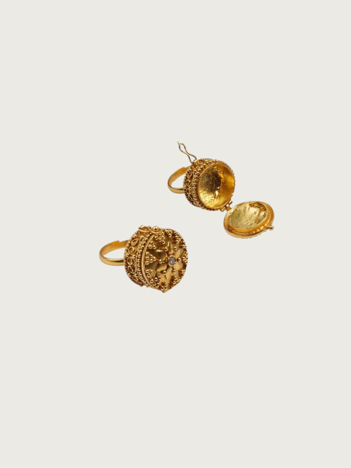 Unfold stories of tradition with this gold-plated locket ring, a rare blend of utility and artistry. Designed with intricate detailing and a charming locket-style opening, this ring evokes a nostalgic charm reminiscent of heirloom treasures. Its antique finish is enhanced with delicate bead work and a single stone at the center, giving it a striking presence on your hand.