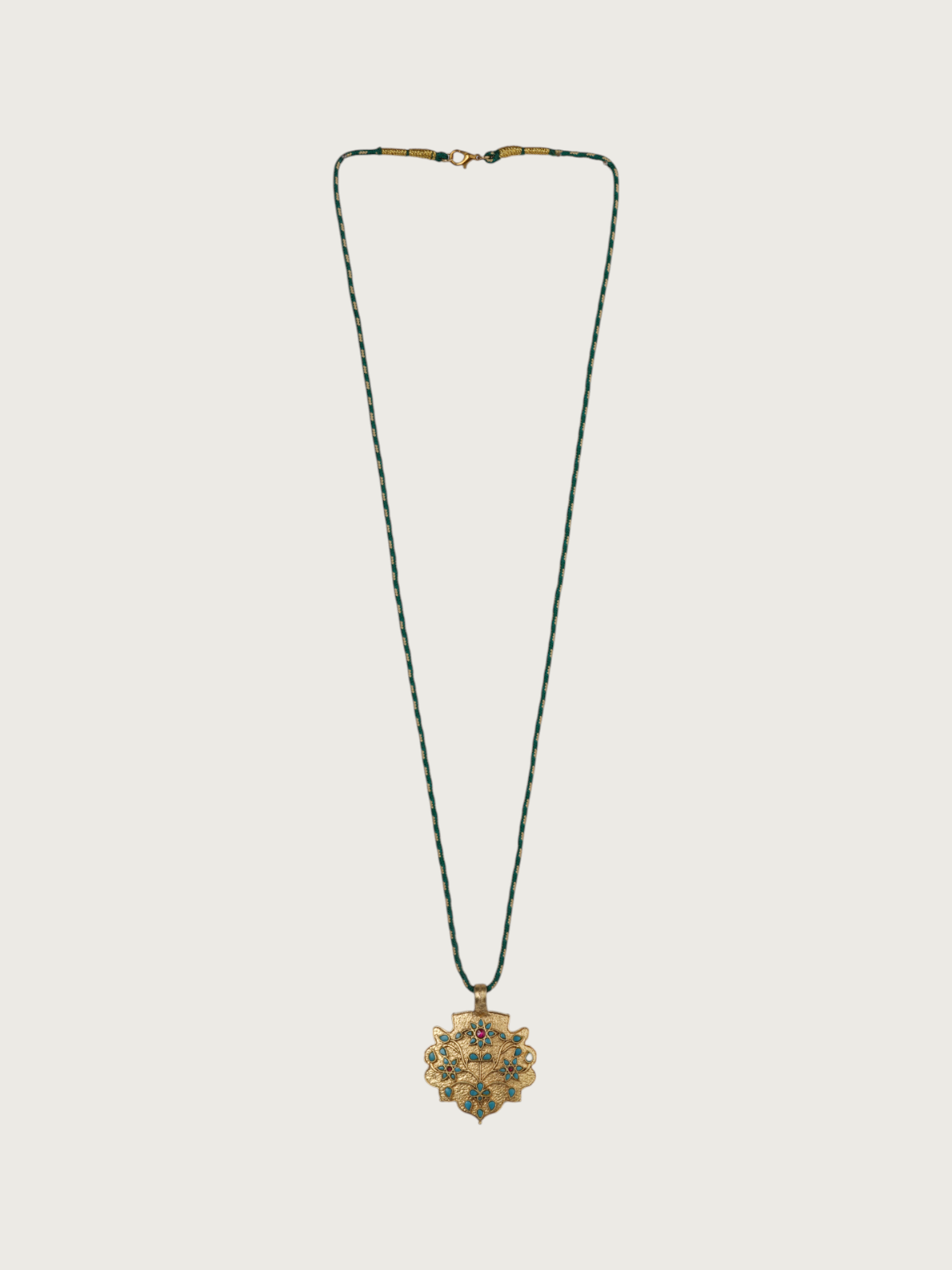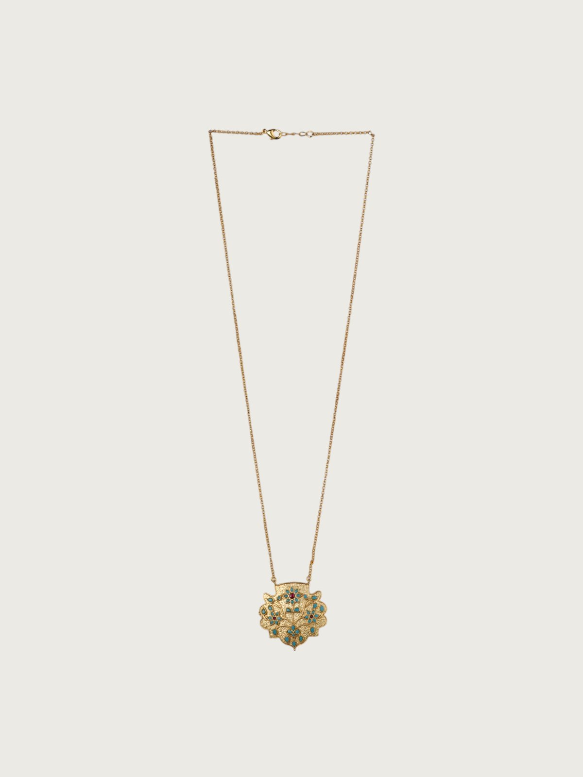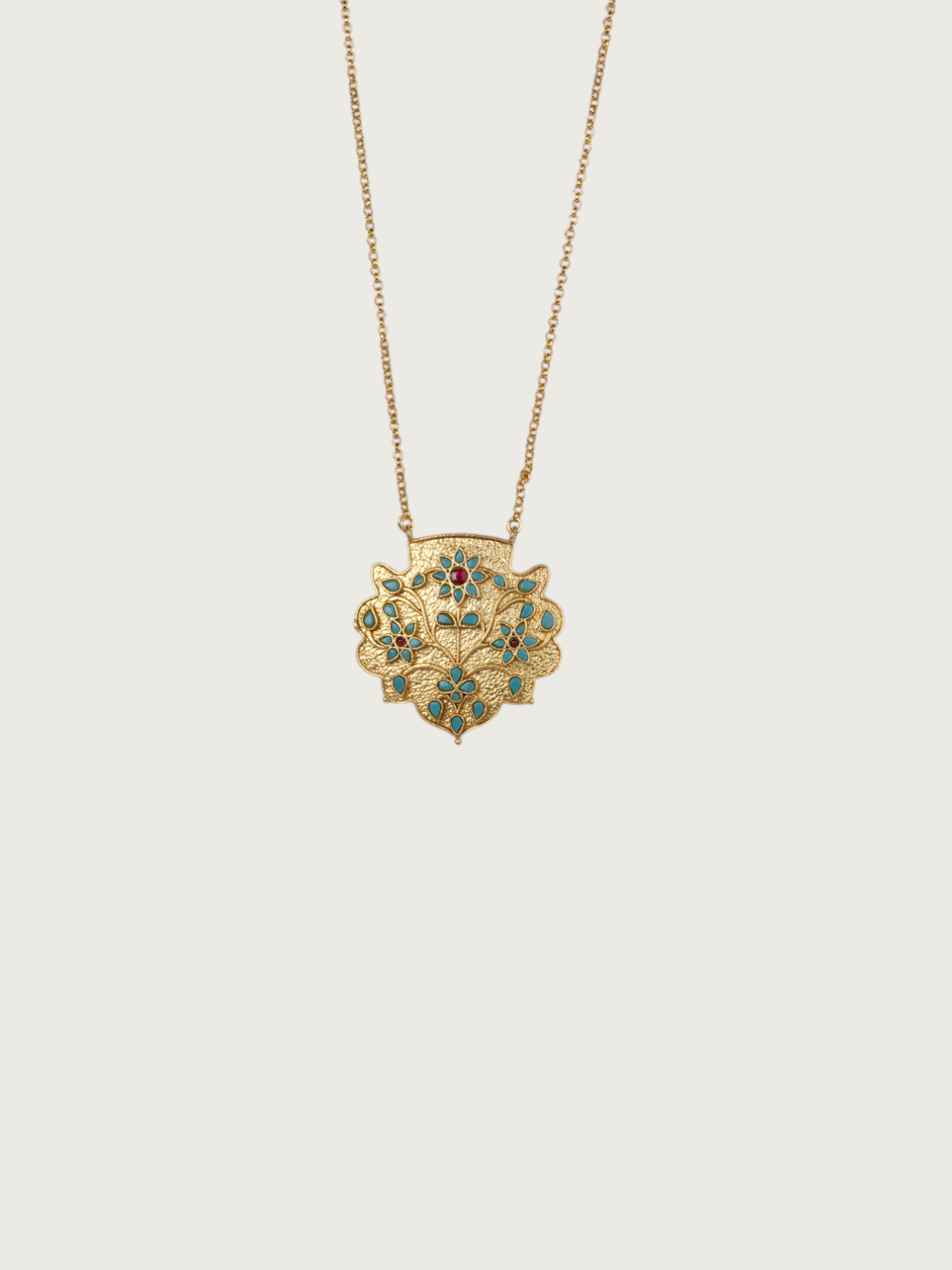 This gold-plated pendant necklace showcases a delicate floral motif with vivid blue accents. The detailed craftsmanship makes it a versatile accessory for any ensemble.