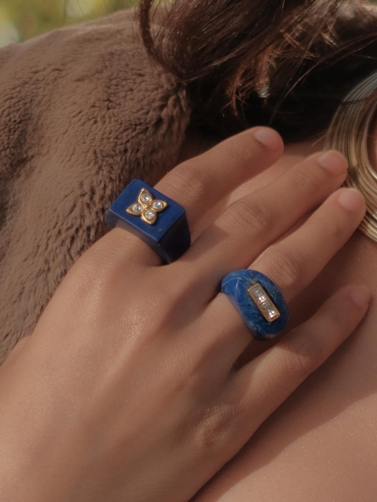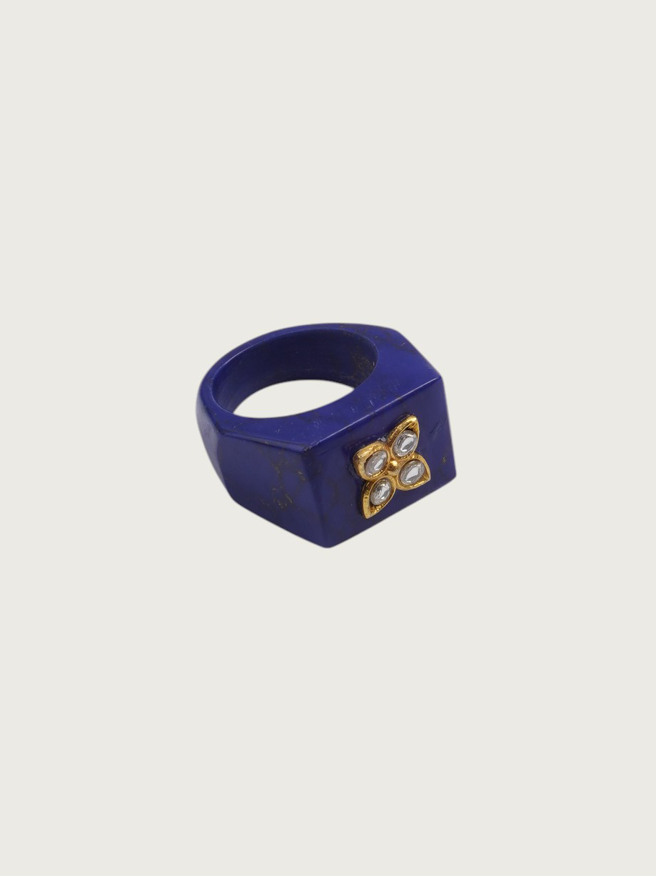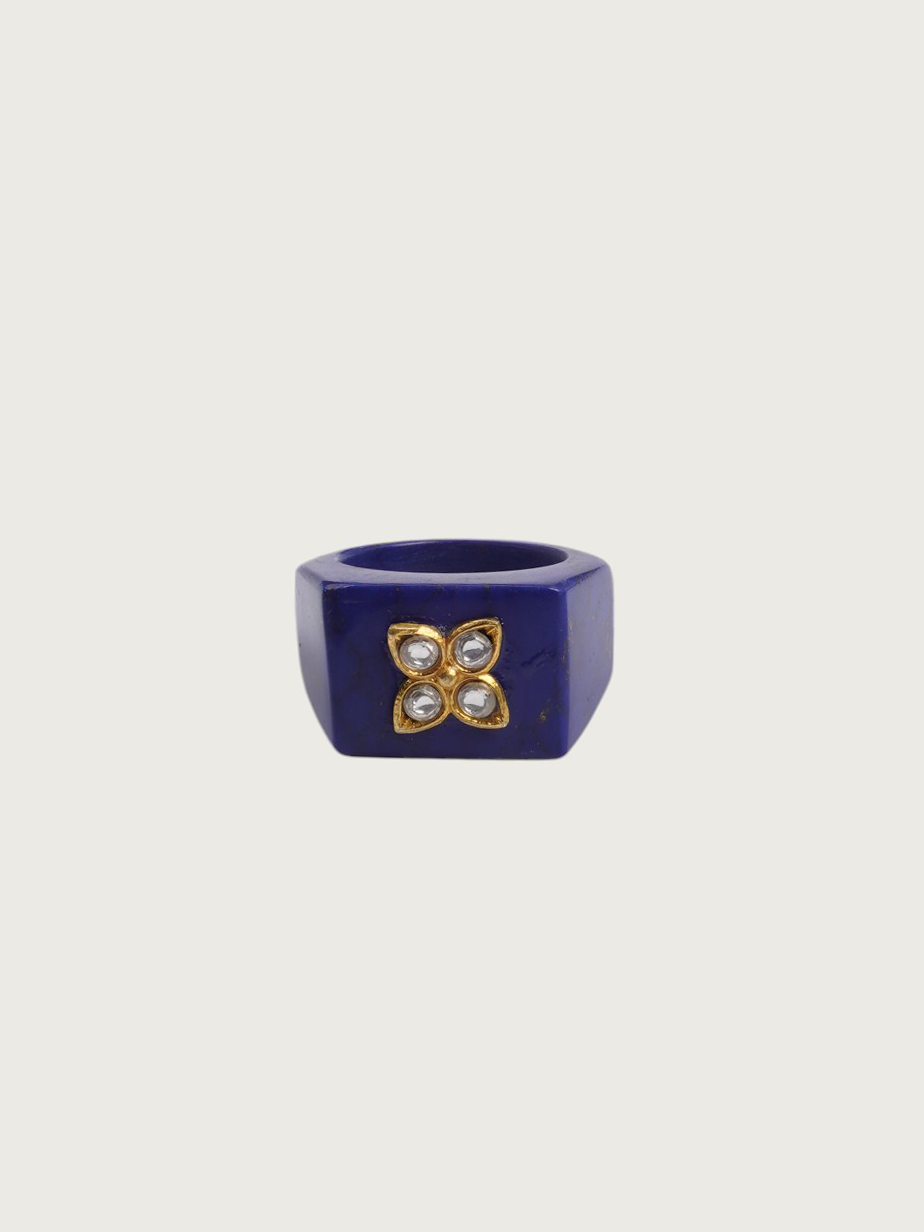 Inspired by Mughal grandeur, this handcrafted Navy Blue signet ring features a deep blue band adorned with jadau stone in a delicate floral motif, set in a gold-plated bezel. The striking combination of rich blue and shimmering stones makes this a timeless statement piece that merges heritage and contemporary elegance.