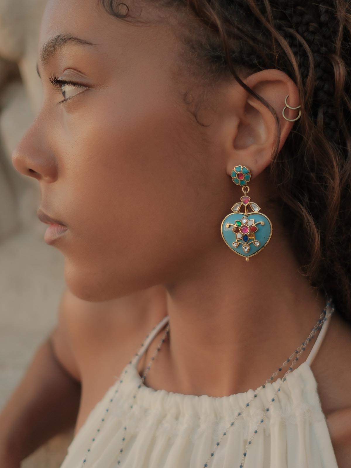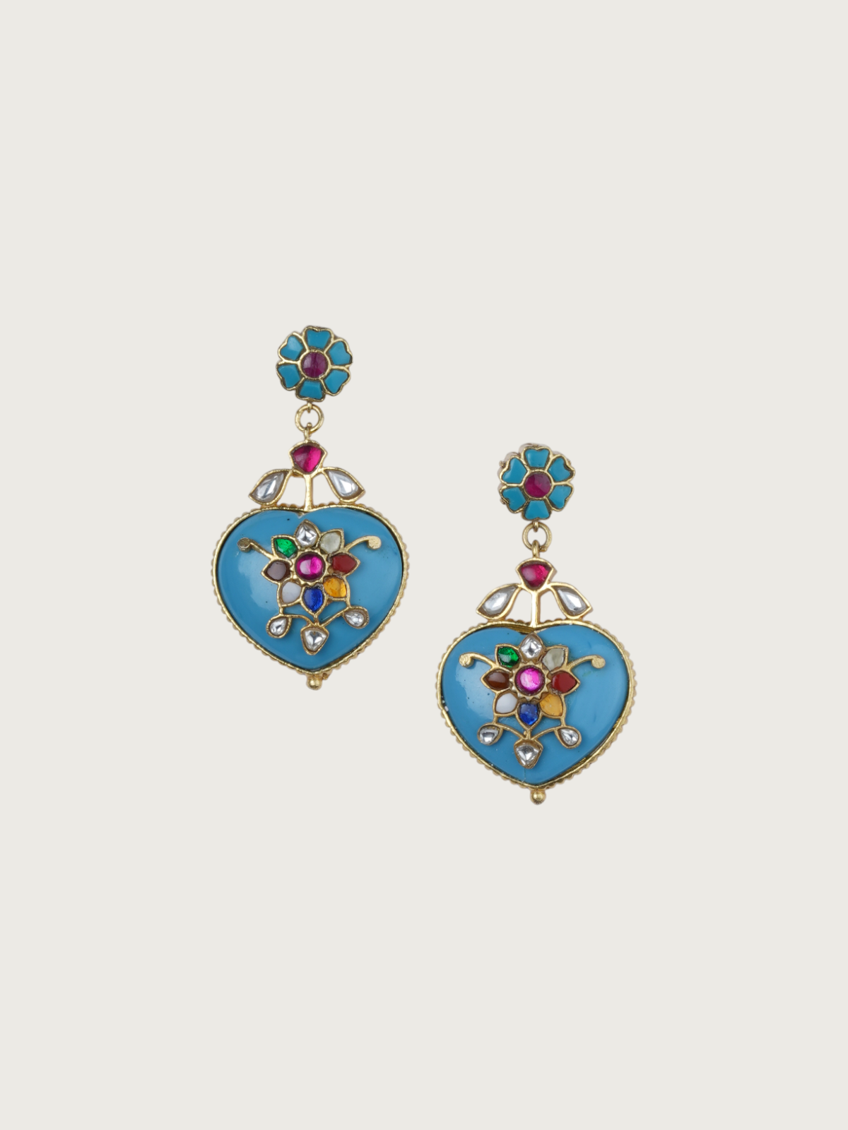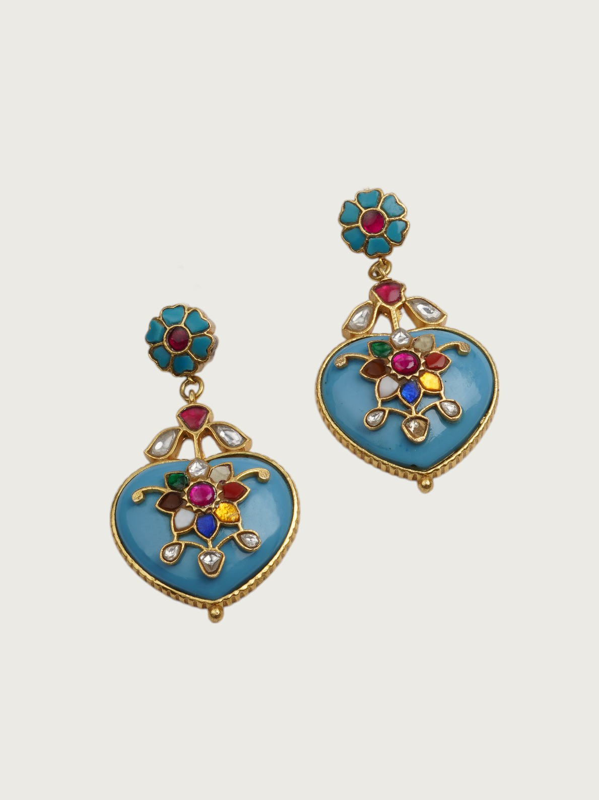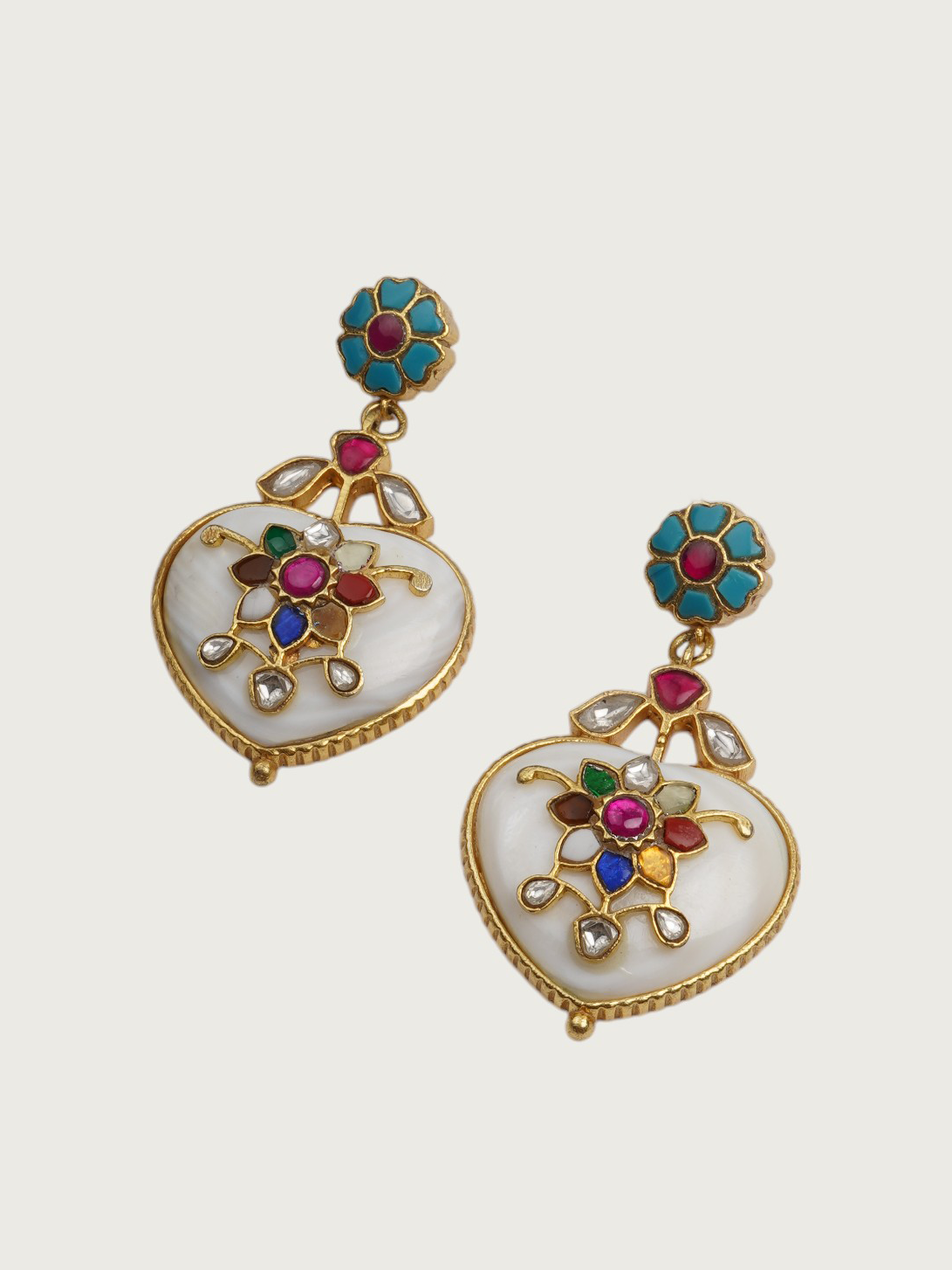 Add a pop of color to your jewelry collection with these gold-plated heart earrings, adorned with vibrant Kundan floral detailing. Featuring a multicolor stonework design, these earrings blend traditional charm with modern elegance. The floral stud top and dangling heart motif make them a perfect choice for statement looks.
