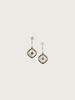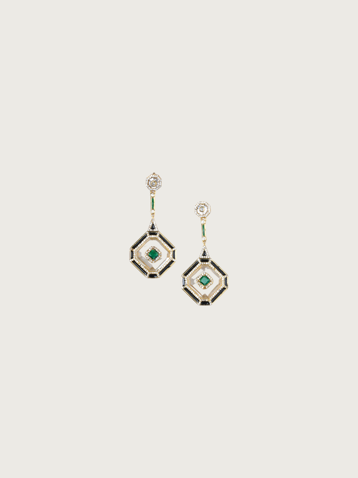 Make a bold style statement with these striking hexagon-shaped earrings, exquisitely designed with a blend of sharp geometry and delicate detailing. The centerpiece features a vivid green square stone encased within a layered hexagonal frame of black and white enamel, bordered with fine crystal embellishments. The drop design is extended with a slender bar and floral stud that completes the look with understated elegance.