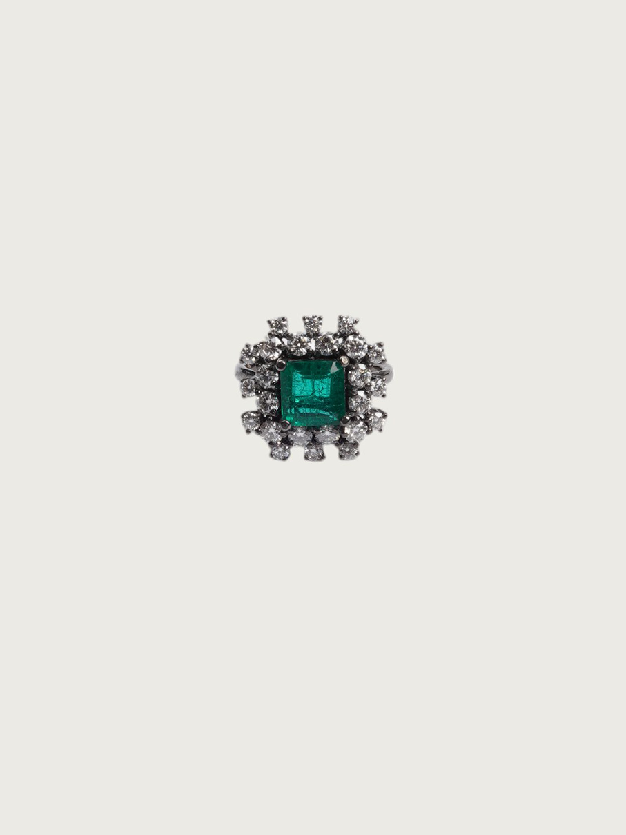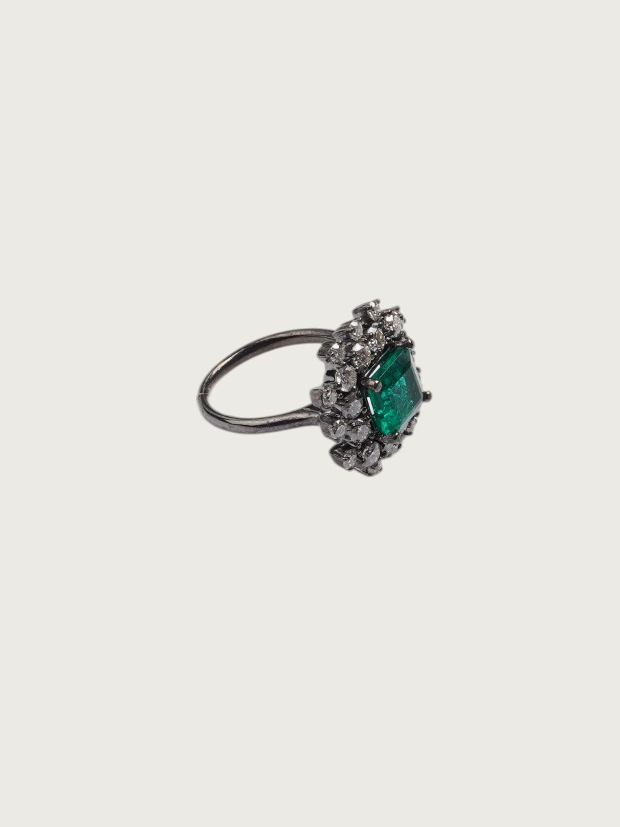 Timeless elegance meets vintage-inspired craftsmanship in this handcrafted green diamond halo ring. Featuring a vivid emerald-cut green stone, encircled by delicate diamond accents, this ring is set in 925 silver, enhancing its antique charm and regal aesthetic.
