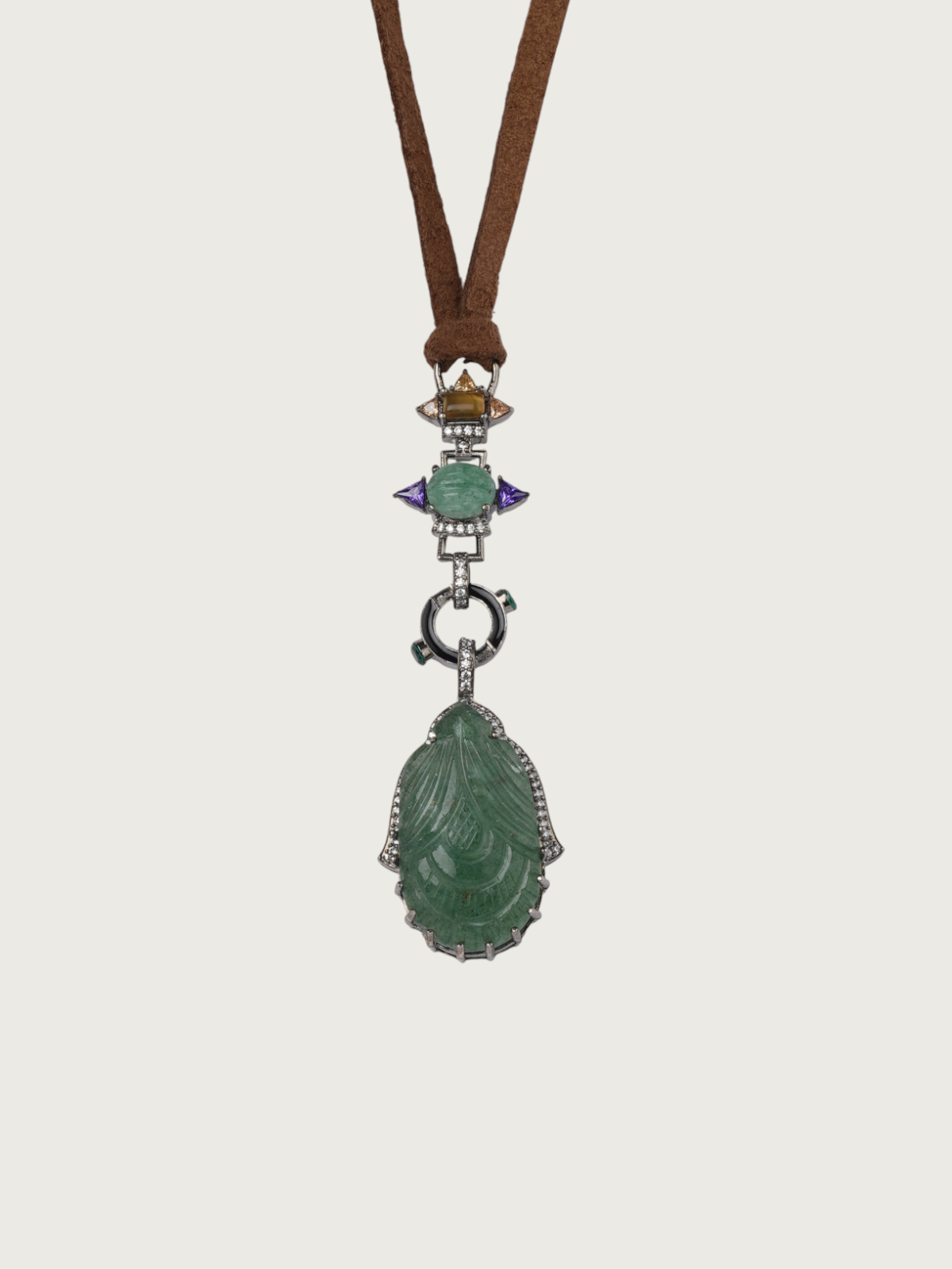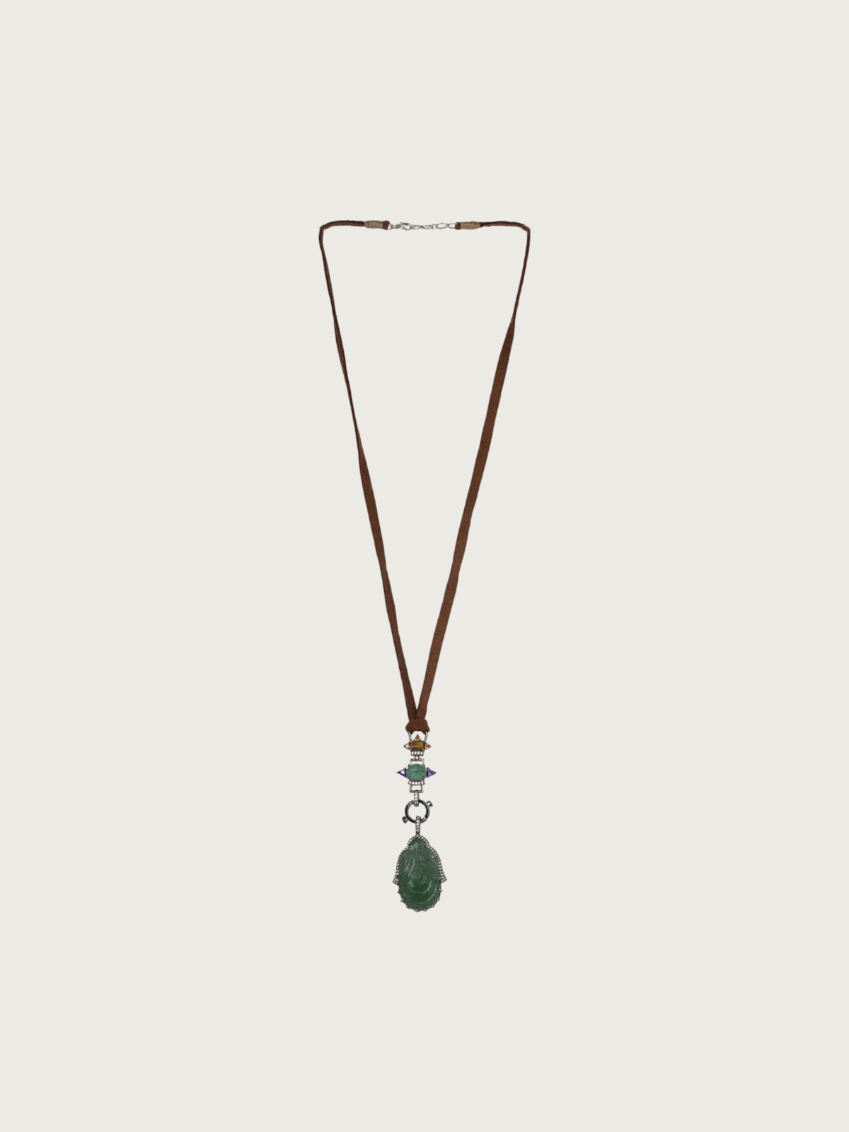 Add a bold artisanal flair to your look with this striking pendant necklace, showcasing a finely carved green stone centerpiece framed in a sleek metal bezel. The pendant is accented with geometric and floral elements in hues of purple, yellow, and green stones, lending it a bohemian yet contemporary edge. It hangs gracefully from a soft brown suede cord, making it ideal for layering or wearing solo as a standout piece.