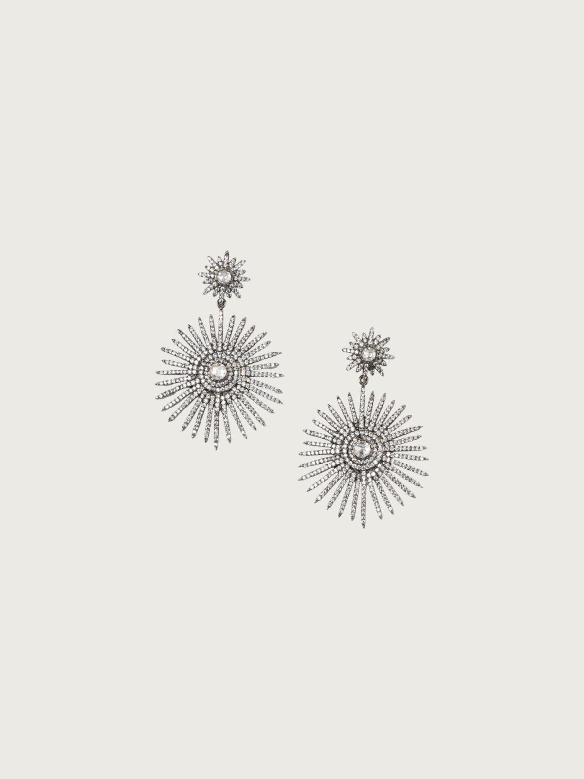 Add a radiant flair to your look with these stunning starburst silver-toned stud earrings. Intricately crafted with a sunburst motif, the earrings feature layered concentric lines of fine detailing that mimic shimmering rays, centered around a brilliant reflective stone. The smaller top motif adds dimension and completes the celestial charm of this pair. Designed to stand out, these earrings bring a bold yet elegant sparkle to any outfit.