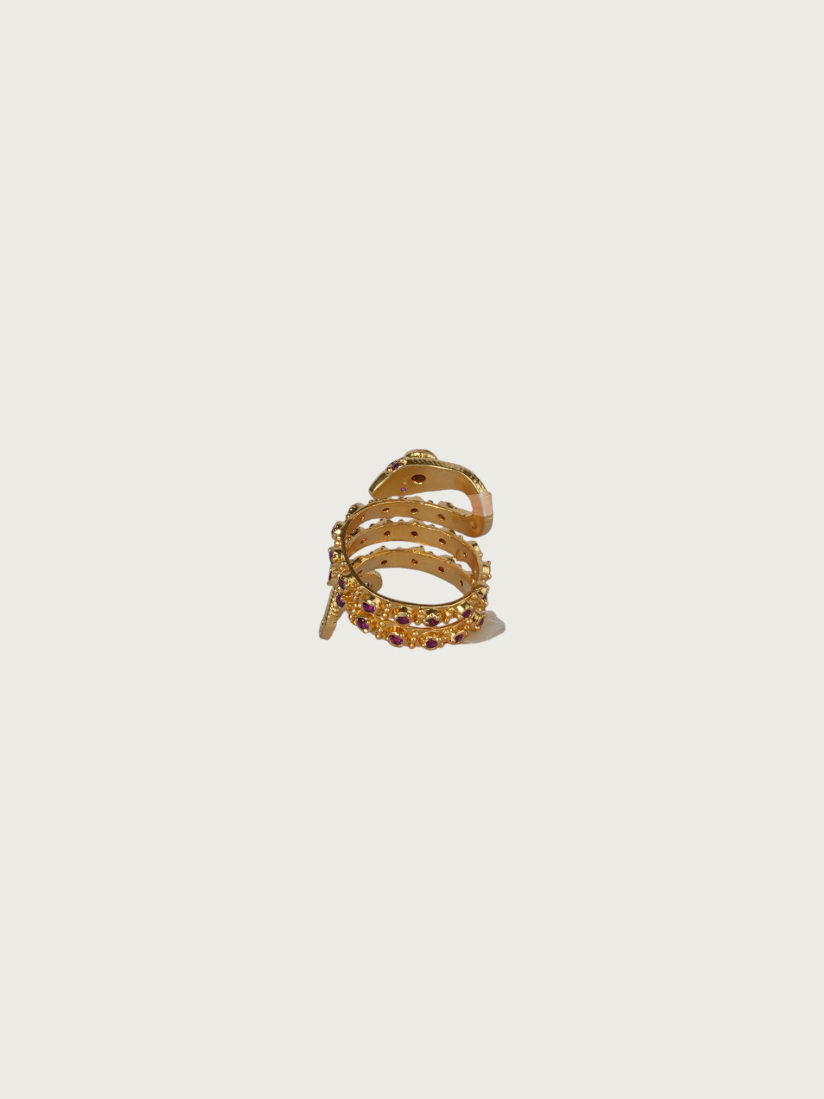 Unleash your bold side with this exquisite snake-shaped statement ring featuring a gold-plated finish and vivid pink stone accents. The coiled design wraps gracefully around your finger, symbolizing transformation, strength, and mystery. A single pear-cut pink stone forms the snake’s eye, adding a striking focal point to the piece.
