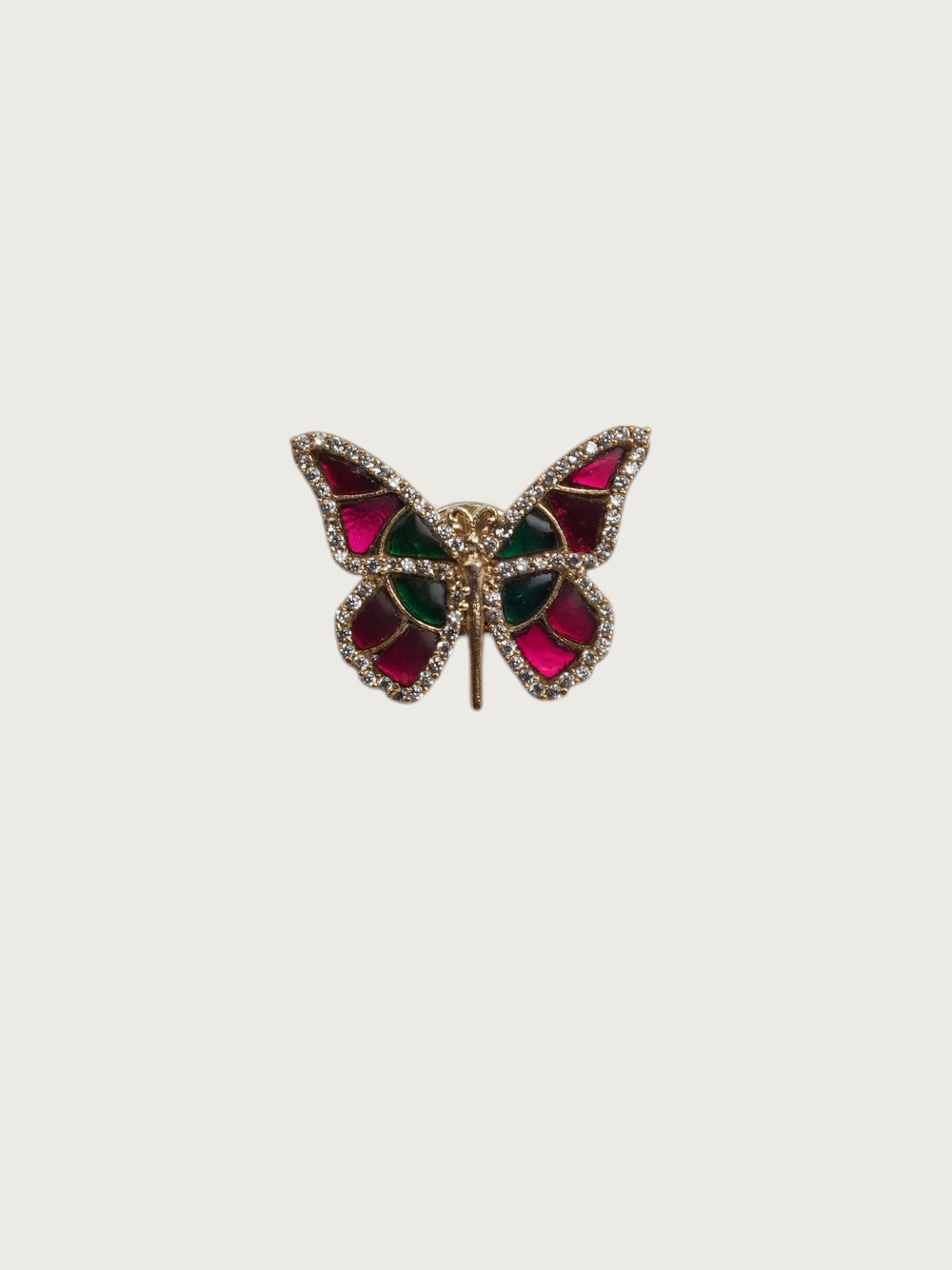 The Butterfly Brooch by Tver is a vibrant, handcrafted piece in shades of pink and green. Made from gold-plated brass, this brooch adds a playful yet elegant charm to your ensemble, embodying the grace of traditional Indian craftsmanship with a modern twist.