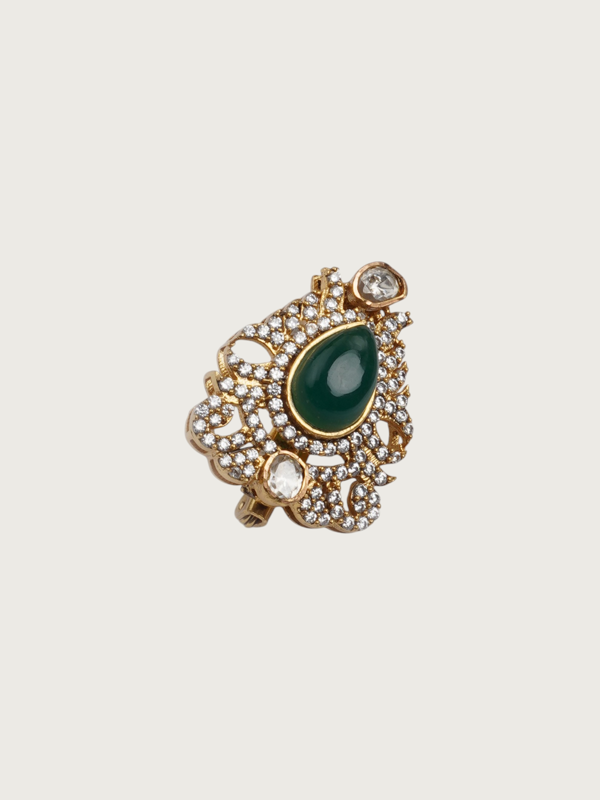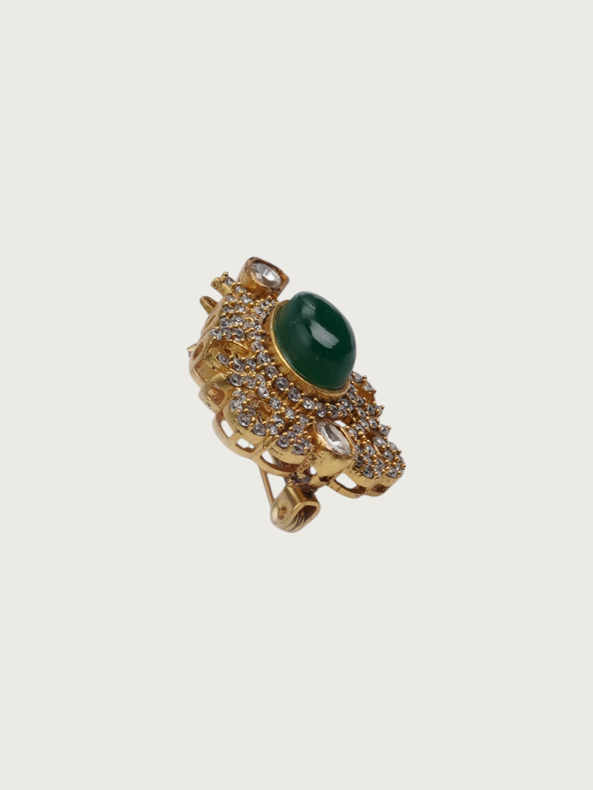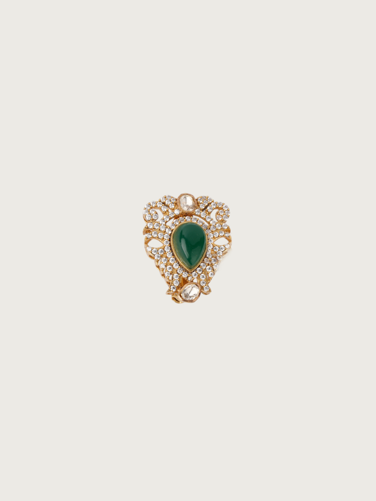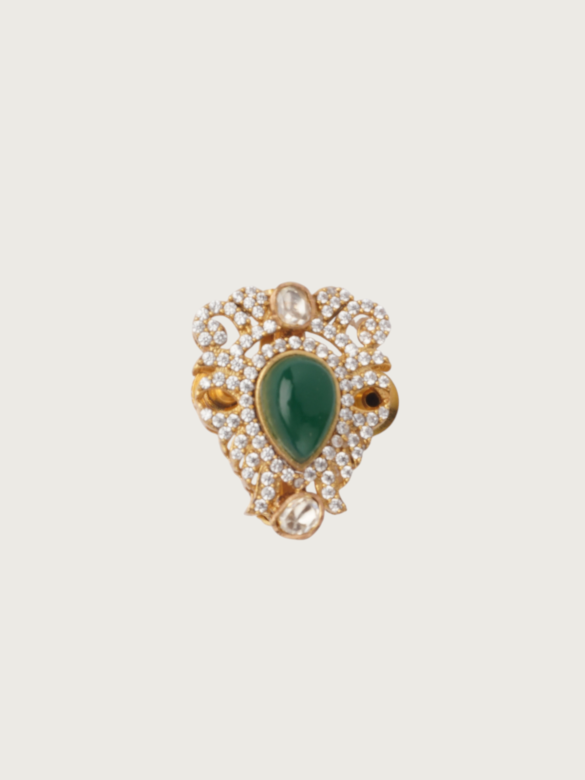 The Green Lace Brooch by Tver is a timeless accessory inspired by Mughal-era designs. Crafted in gold-plated brass, it features a striking green oval center with intricate crystal detailing in a lace-like pattern. A versatile statement piece that blends classic elegance with modern minimalism.