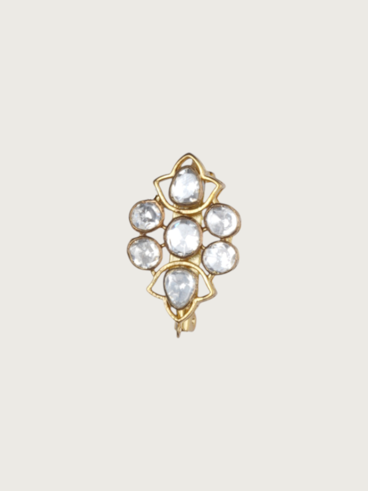 Elevate your attire with this elegant floral brooch designed in a symmetrical drop silhouette. Crafted with refined kundan-style stones in a radiant gold-plated frame, this brooch captures a traditional essence with modern finesse. The teardrop and circular stone placements form a blooming motif that adds a subtle sparkle. Perfect for adding a hint of regal charm to both ethnic and contemporary outfits.