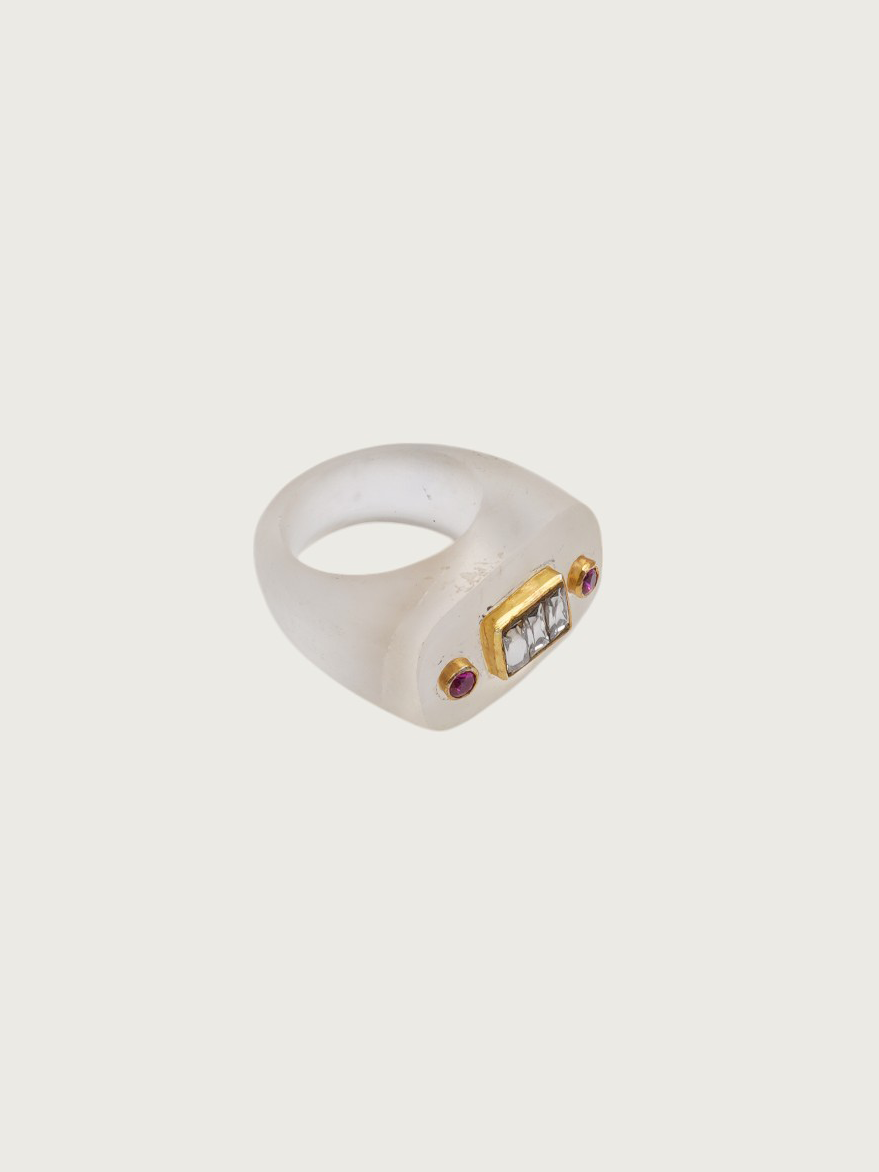 The Frosted Mughal Signet Ring is a bold fusion of tradition and contemporary design. Inspired by the elegance of Mughal-era jewelry, this handcrafted ring features a frosted translucent base, accented with intricate gold-plated detailing and shimmering embellishments. The structured design brings a vintage charm while maintaining a modern, minimal aesthetic.