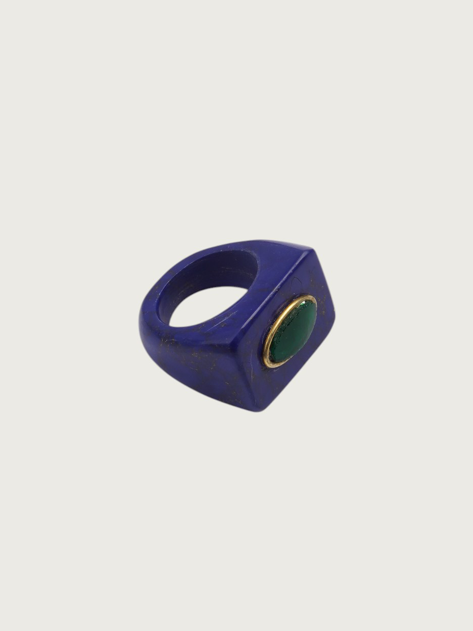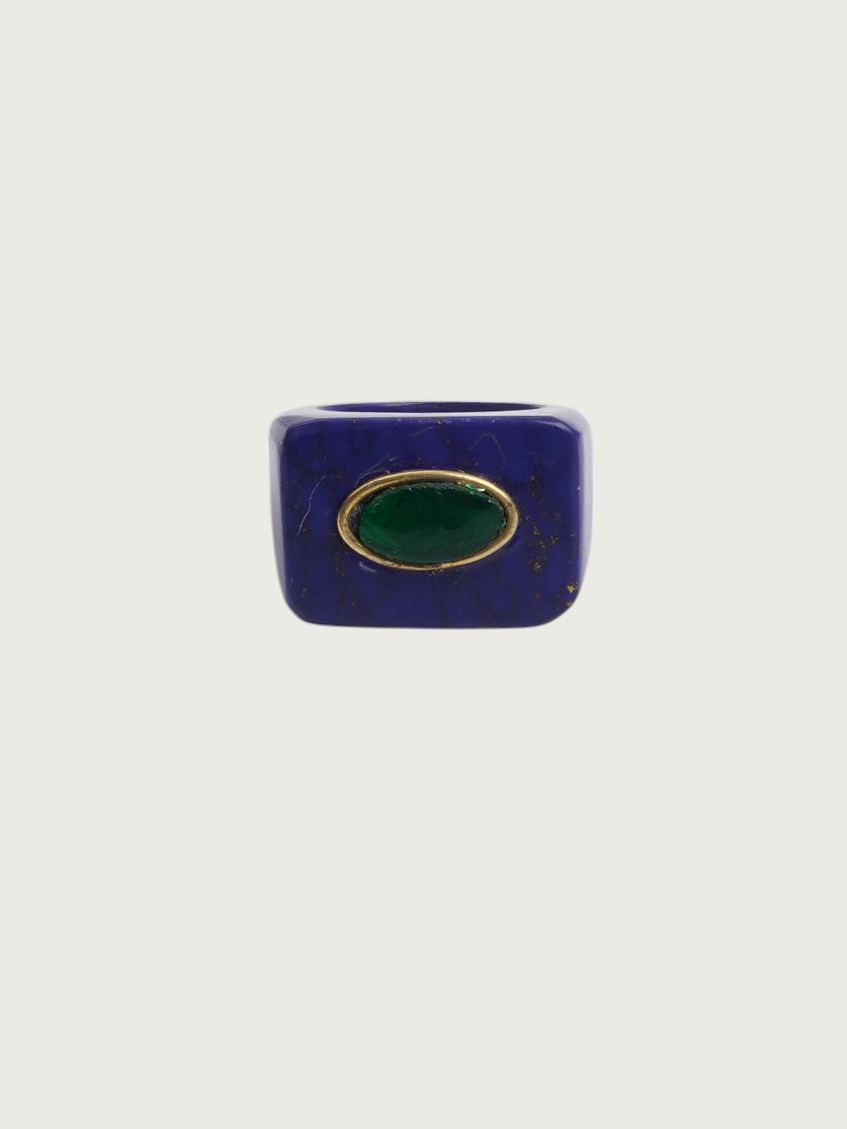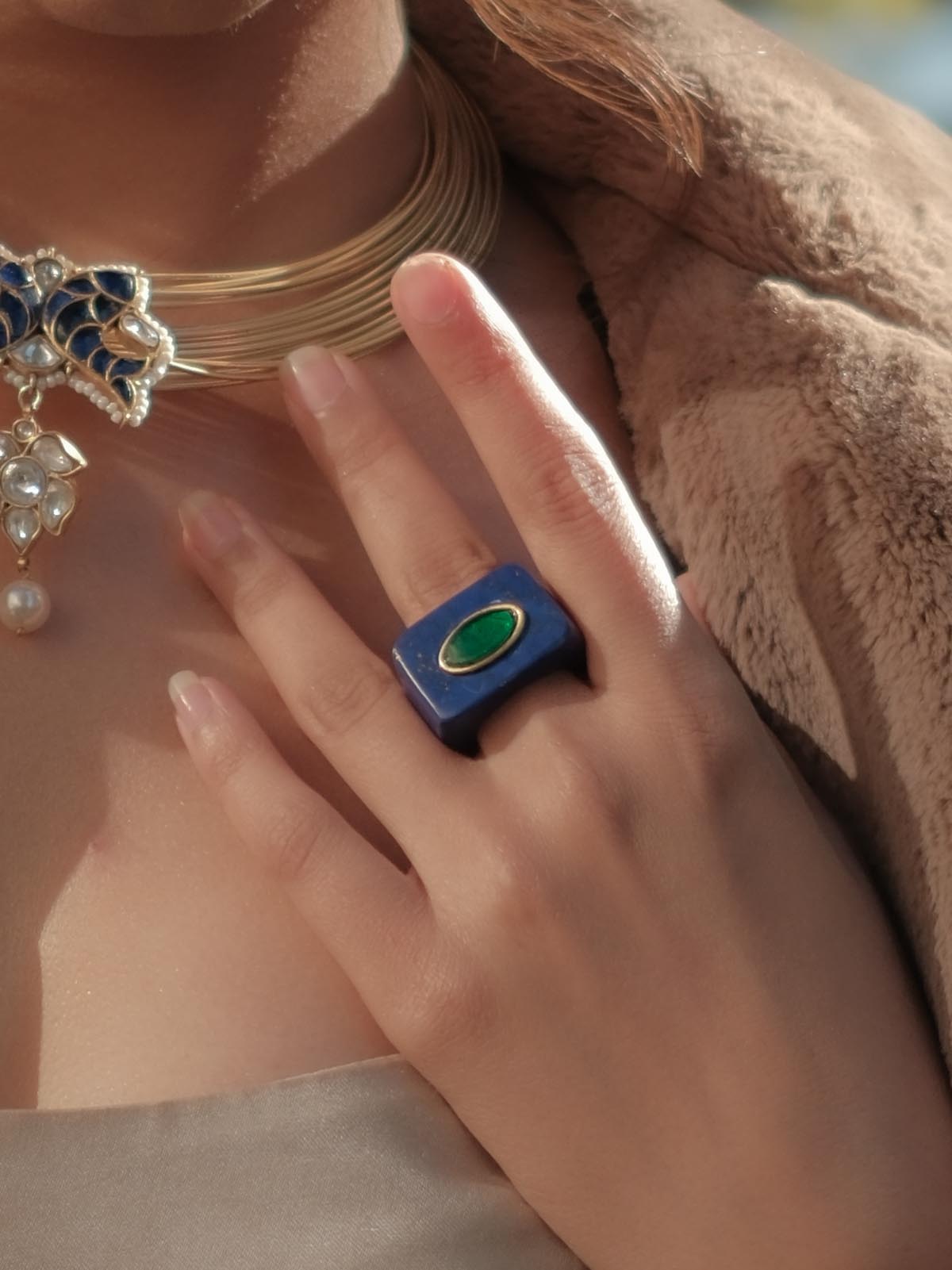 Bold and timeless, this handcrafted blue signet ring embodies Mughal-inspired elegance with a modern twist. Featuring a deep blue band, the ring is accentuated with a rich green oval stone set in a gold-plated bezel, offering a regal contrast that makes it a true statement piece.