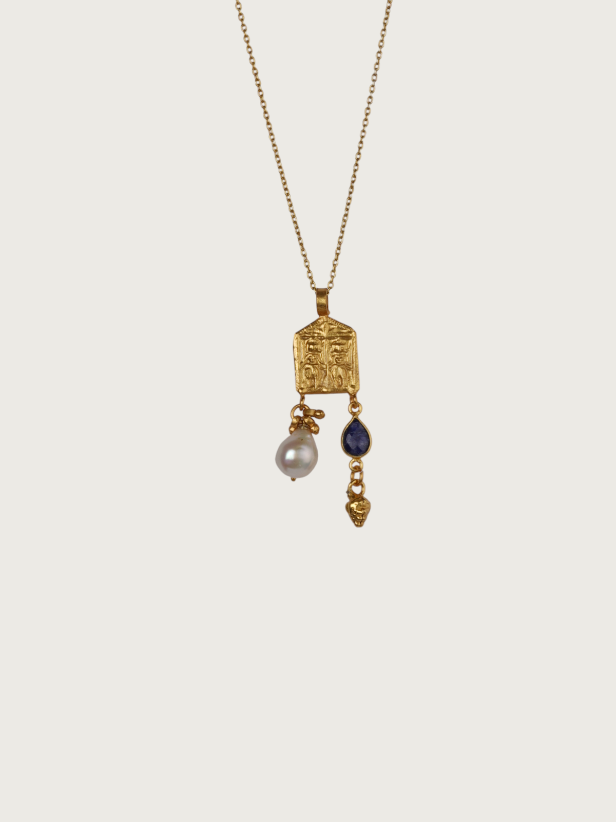 Celebrate heritage and symbolism with this exquisite gold-plated necklace featuring a hand-carved Vishnu-Lakshmi pendant. Suspended from a sleek golden chain, the central pendant is etched in antique style, representing divine grace and protection. Accentuated by two asymmetric danglers – a lustrous pearl on one side and a deep navy-blue stone with a delicate gold drop on the other – this piece adds spiritual charm and a regal touch to your everyday or statement wear.