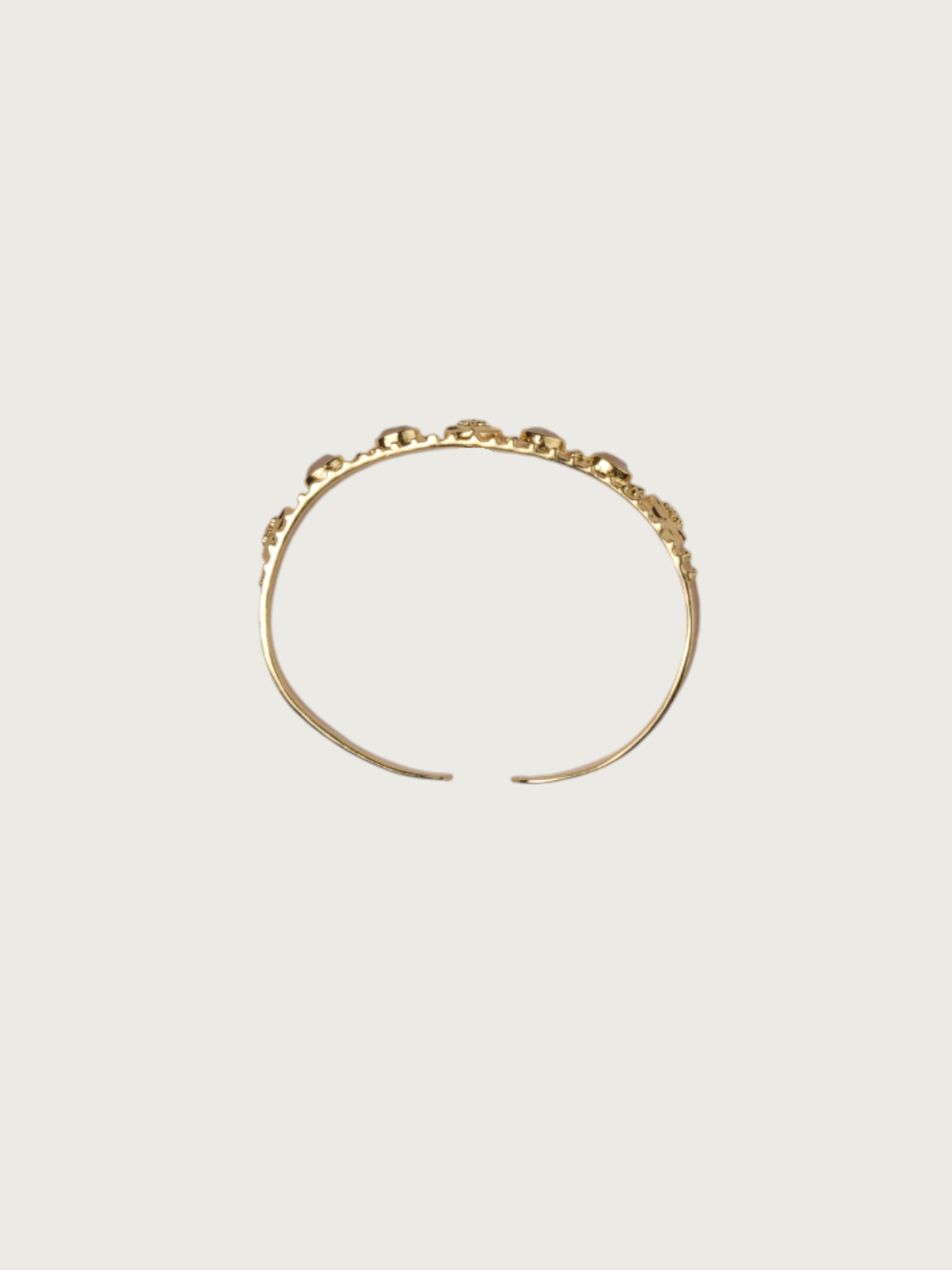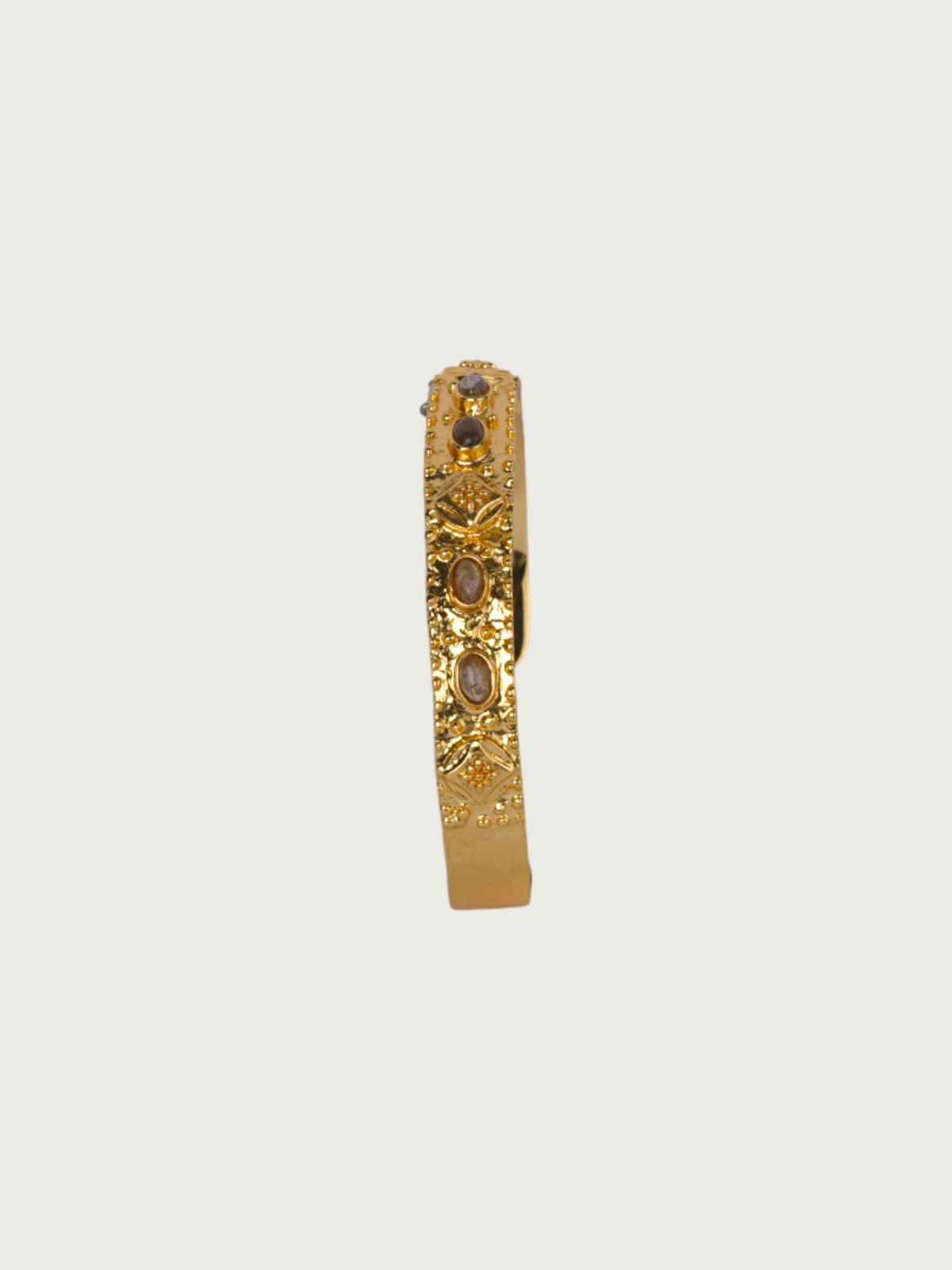 A timeless statement of craftsmanship, this Tver gold-plated cuff bracelet features intricate engraving inspired by traditional motifs. The design is highlighted by oval stone-like detailing set in geometric patterns, giving it a handcrafted richness that feels both classic and modern.