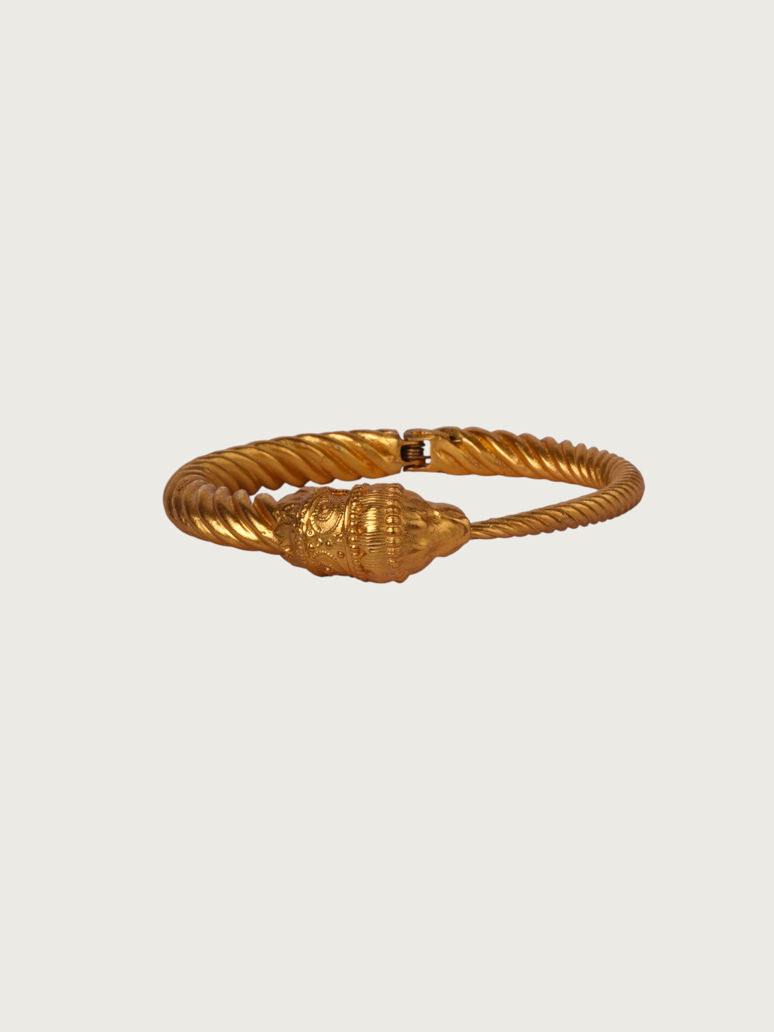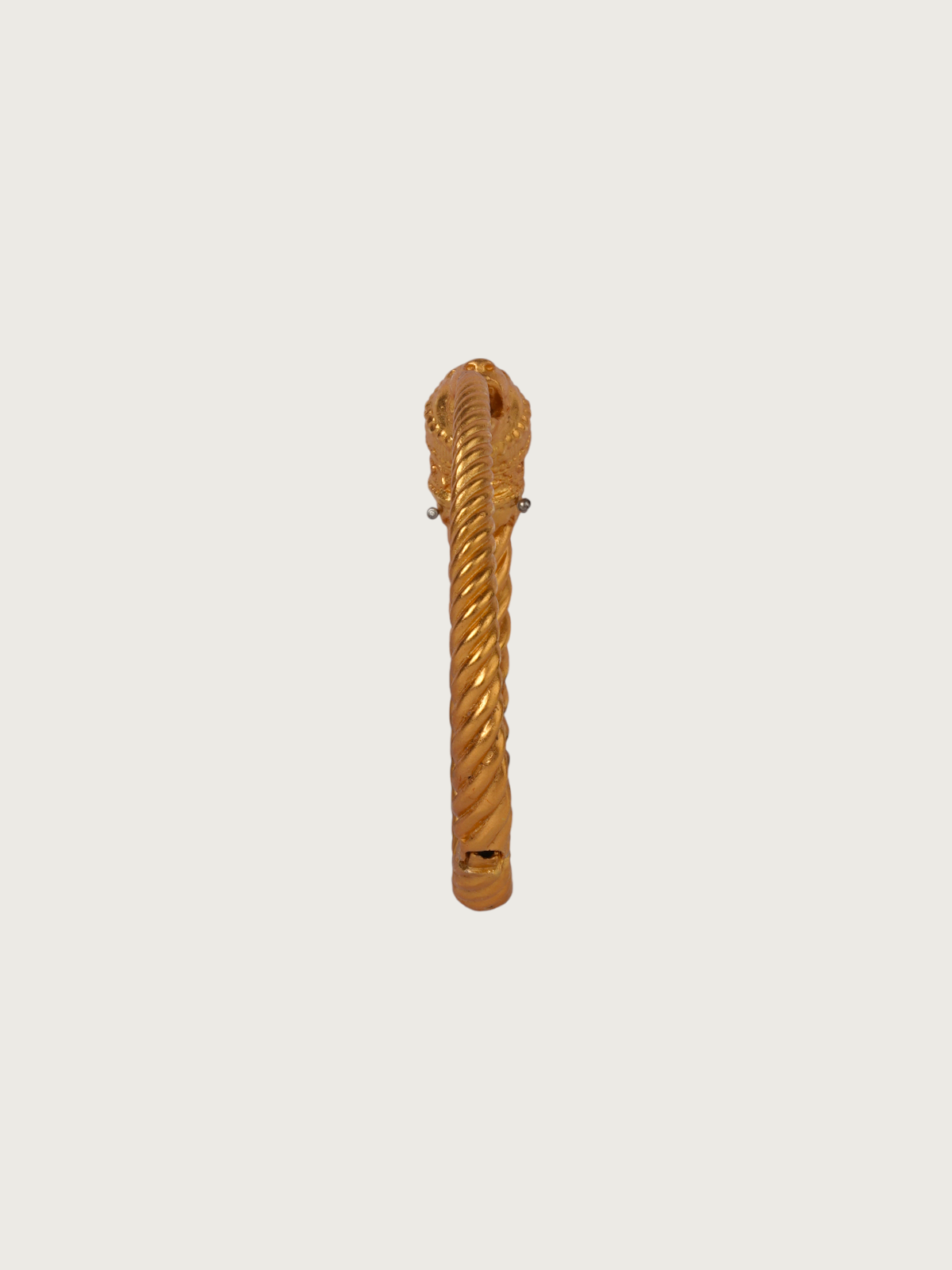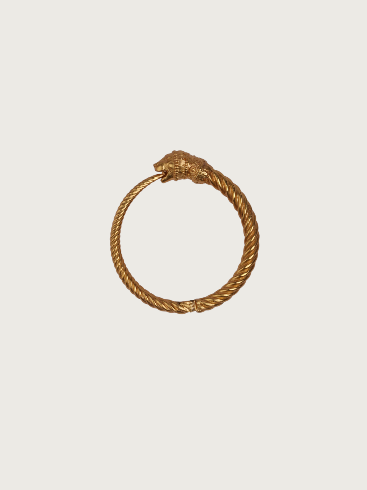 A blend of strength and artistry, this Tver gold-plated bangle captures timeless design with a bold, twisted rope form and sculpted ornamental ends. Its detailed craftsmanship draws inspiration from ancient metalwork, creating a piece that feels both rooted in tradition and effortlessly contemporary.
