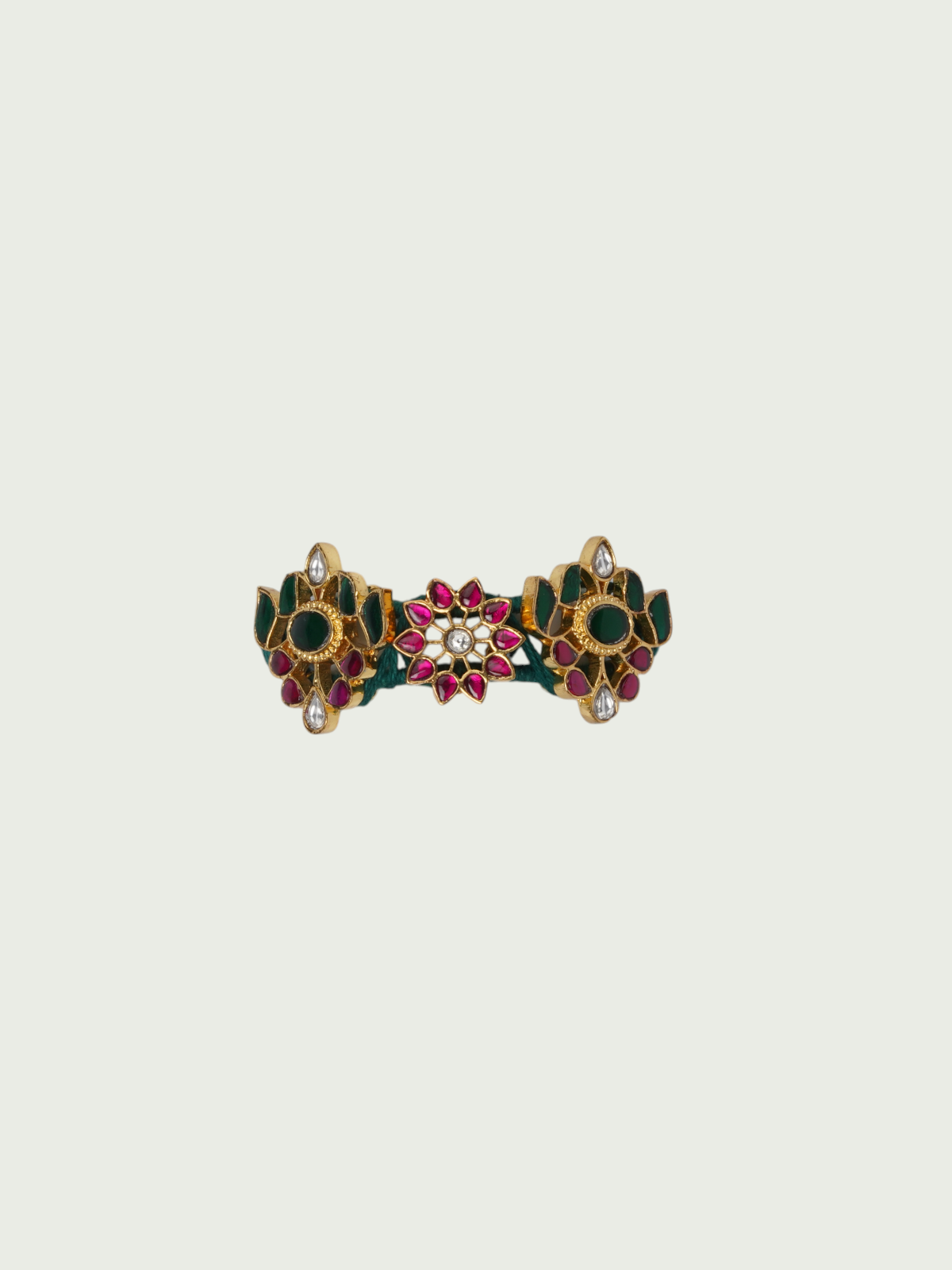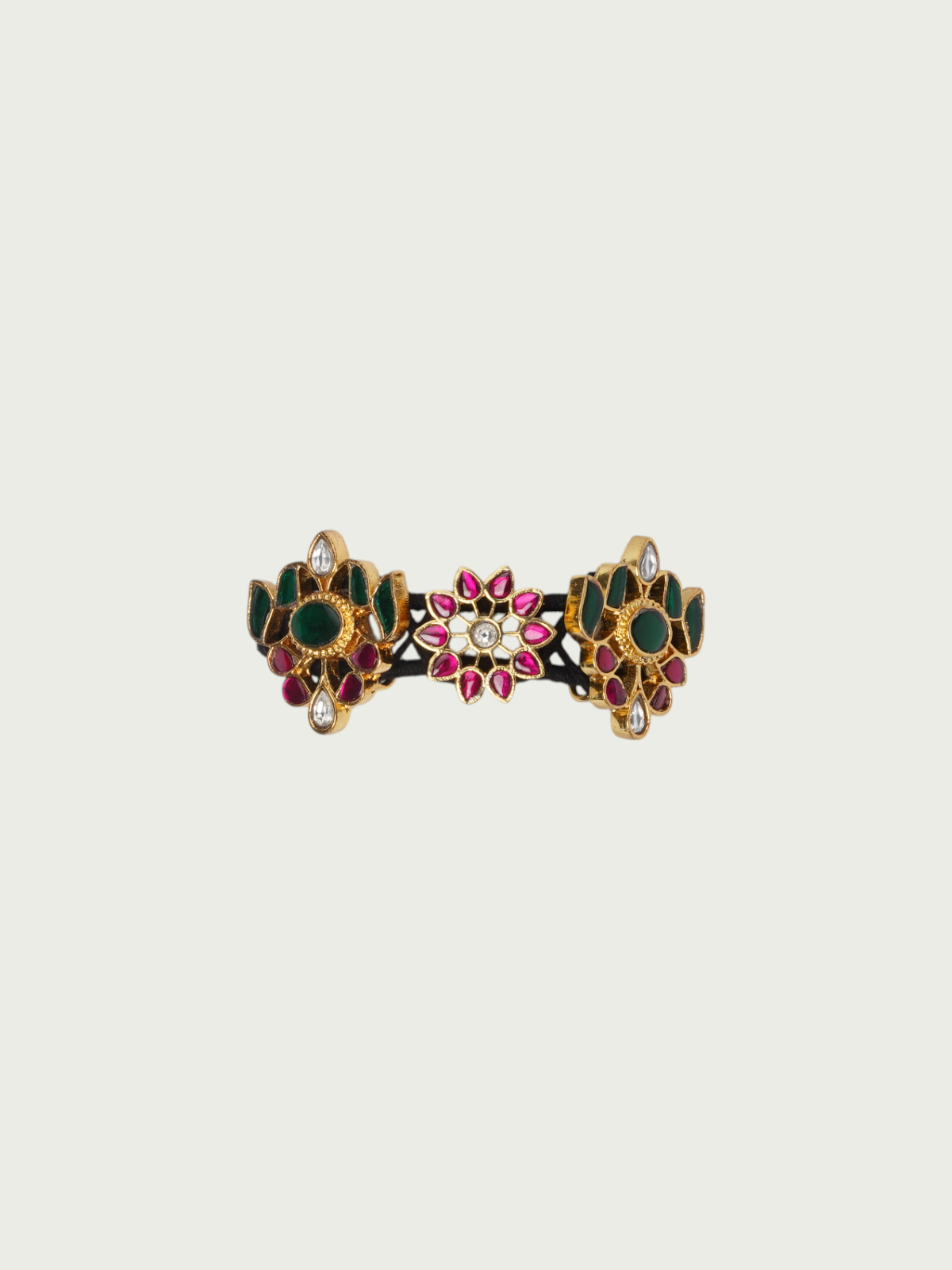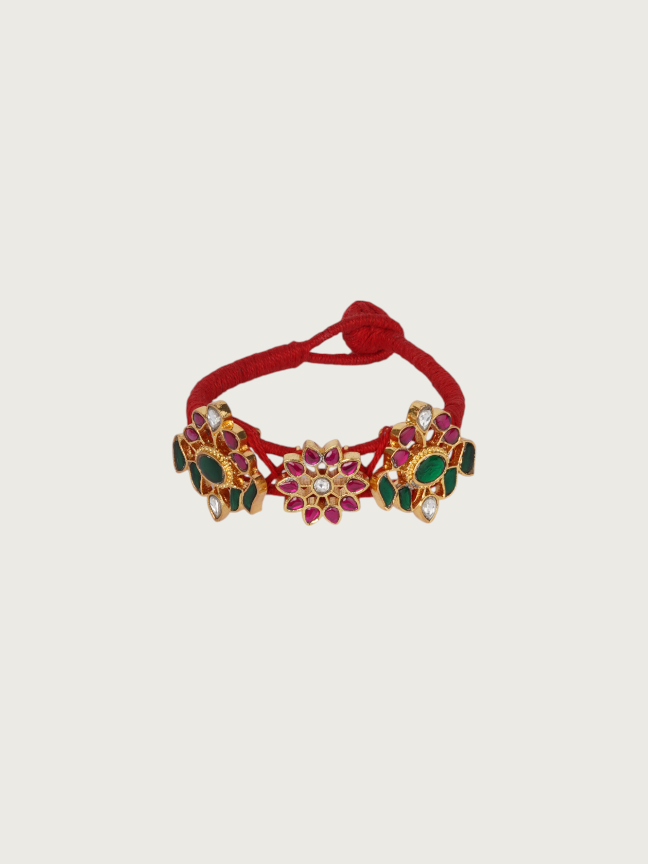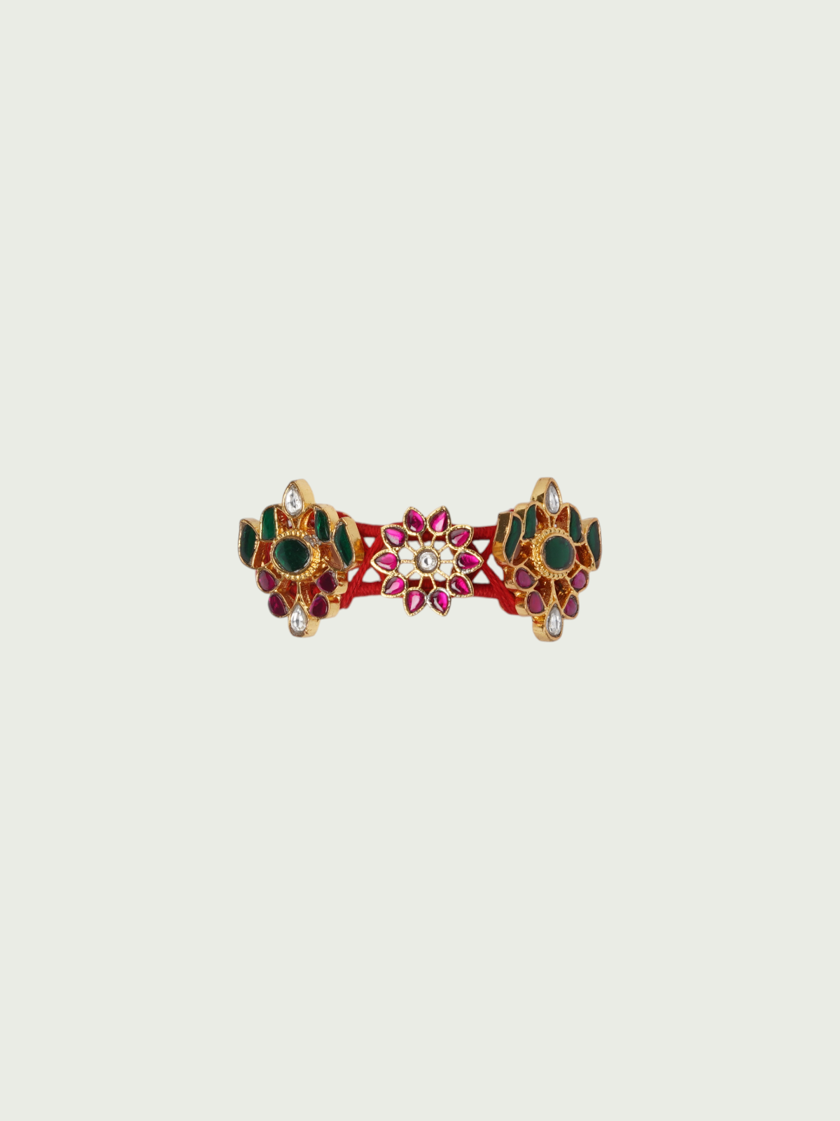 Elevate your accessory collection with this handcrafted jadau bracelet featuring a radiant arrangement of uncut-style stones in traditional floral motifs. Set in a warm gold-plated finish, the piece highlights a trio of intricately embellished components, enhanced with rich multicolor detailing – including hues of red, green, and white.