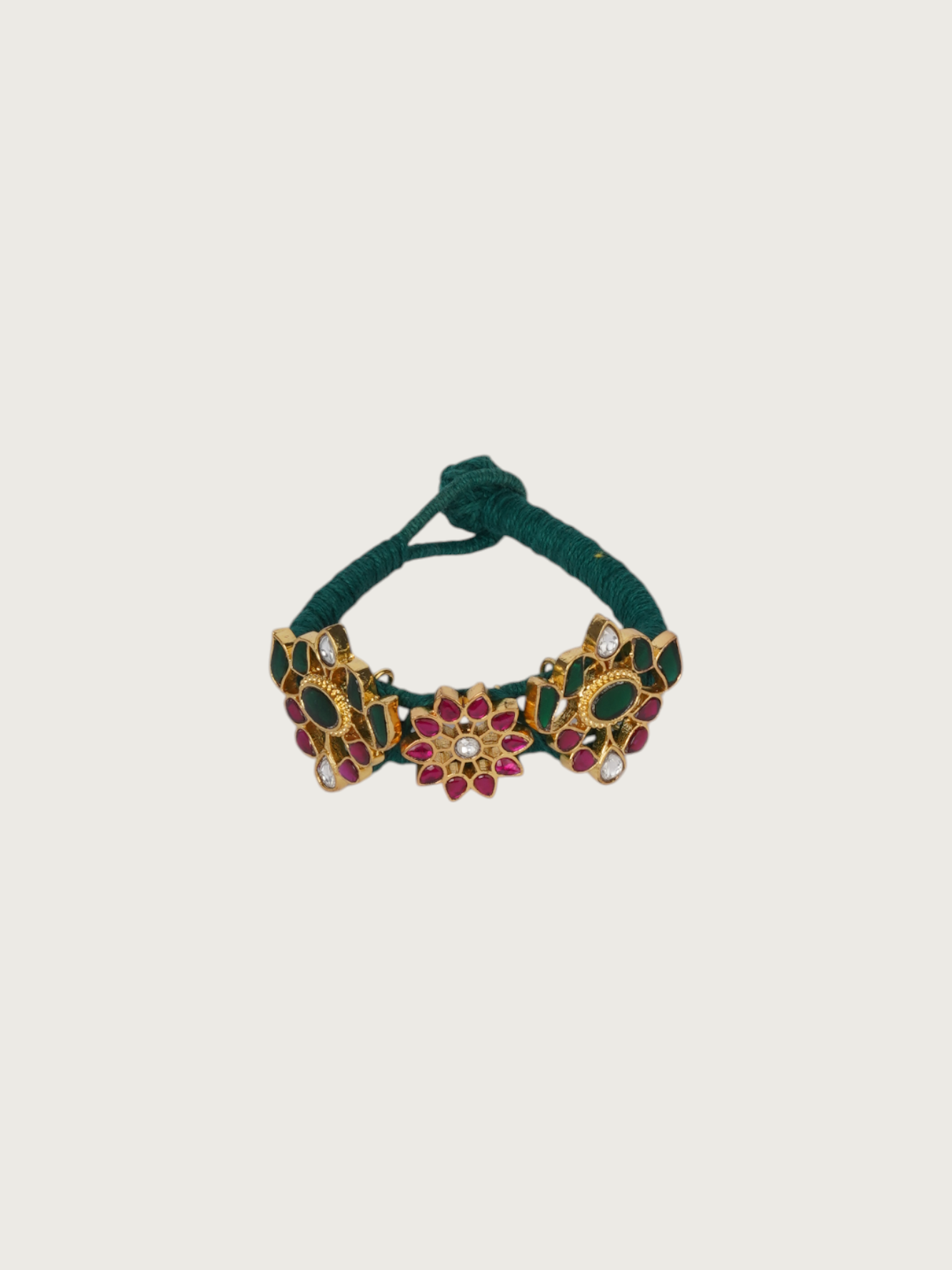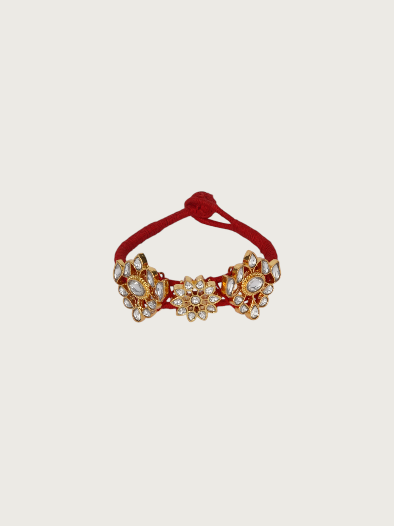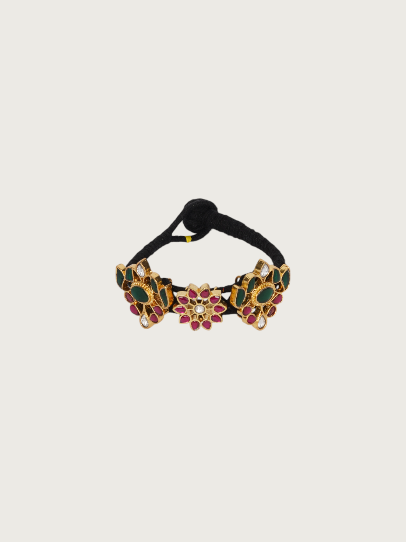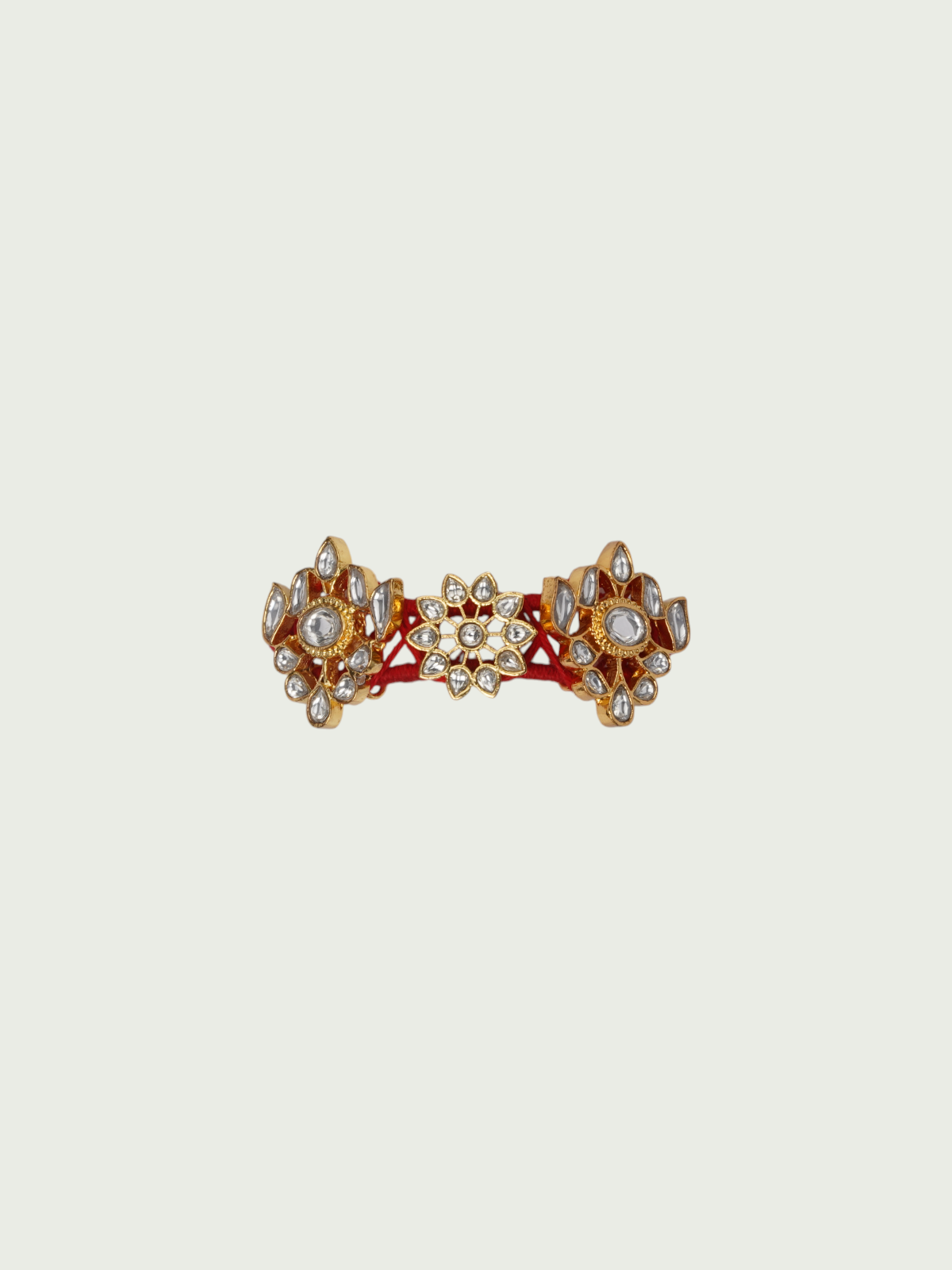 Elevate your accessory collection with this handcrafted jadau bracelet featuring a radiant arrangement of uncut-style stones in traditional floral motifs. Set in a warm gold-plated finish, the piece highlights a trio of intricately embellished components, enhanced with rich multicolor detailing – including hues of red, green, and white.