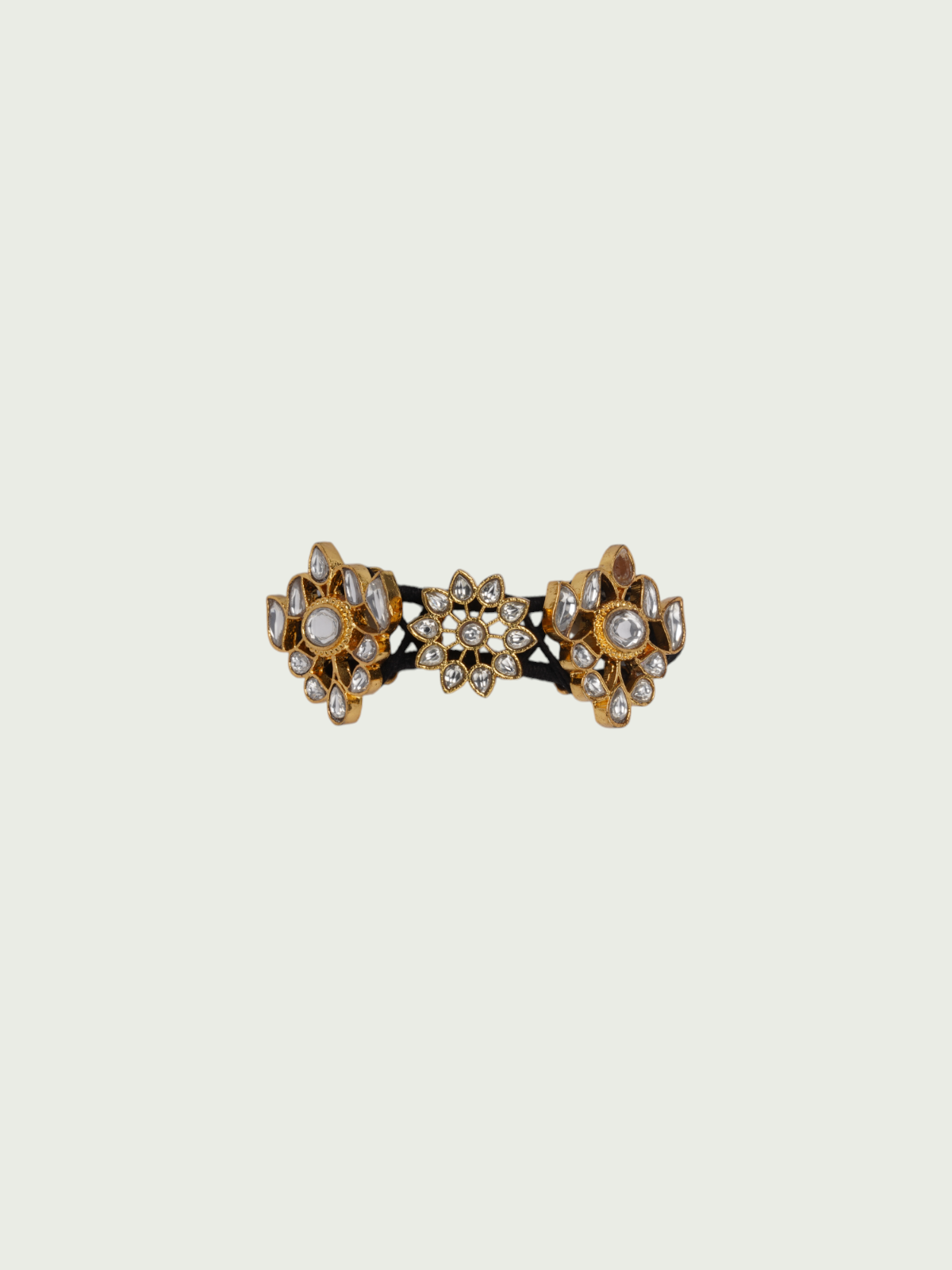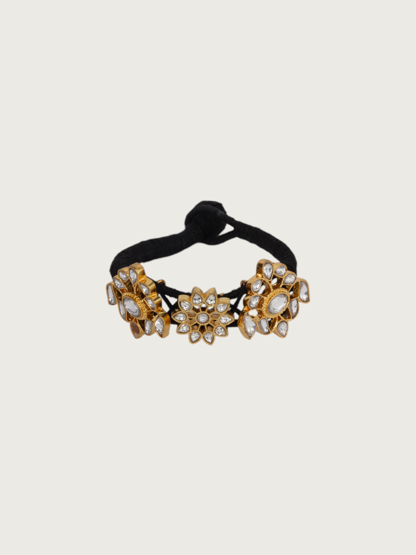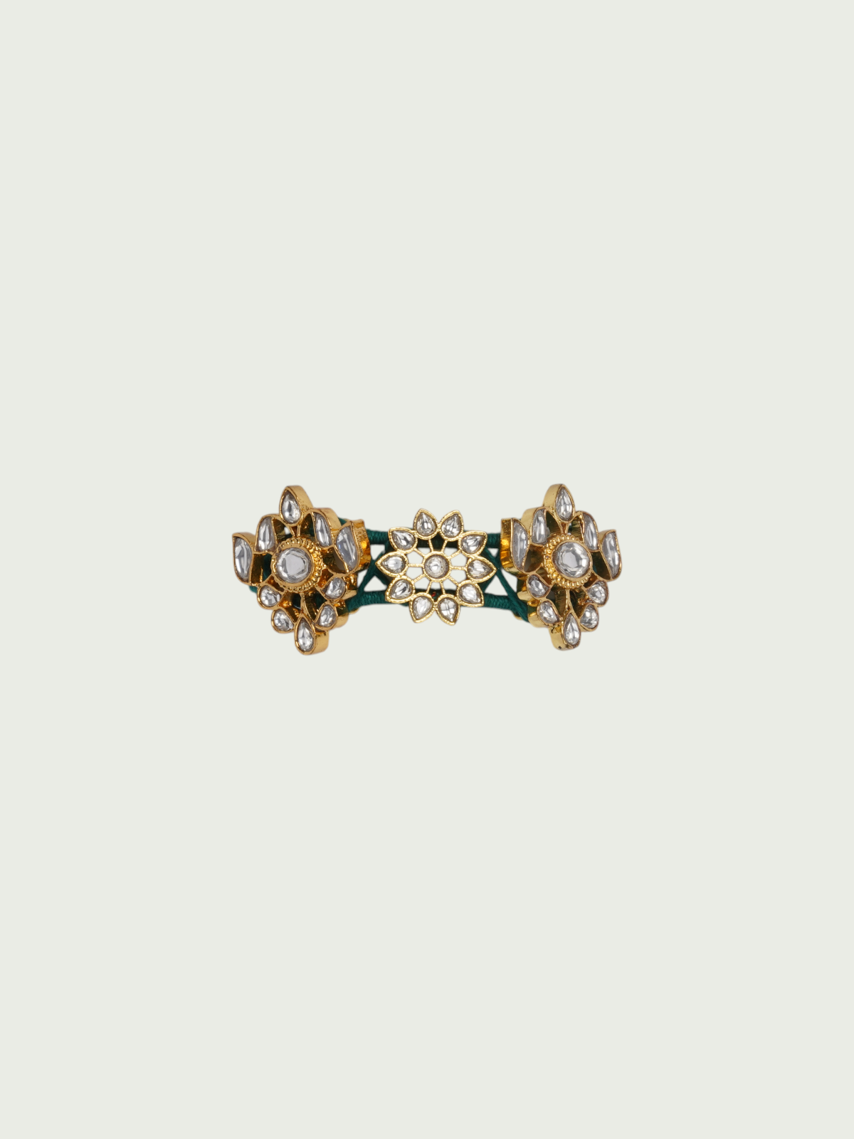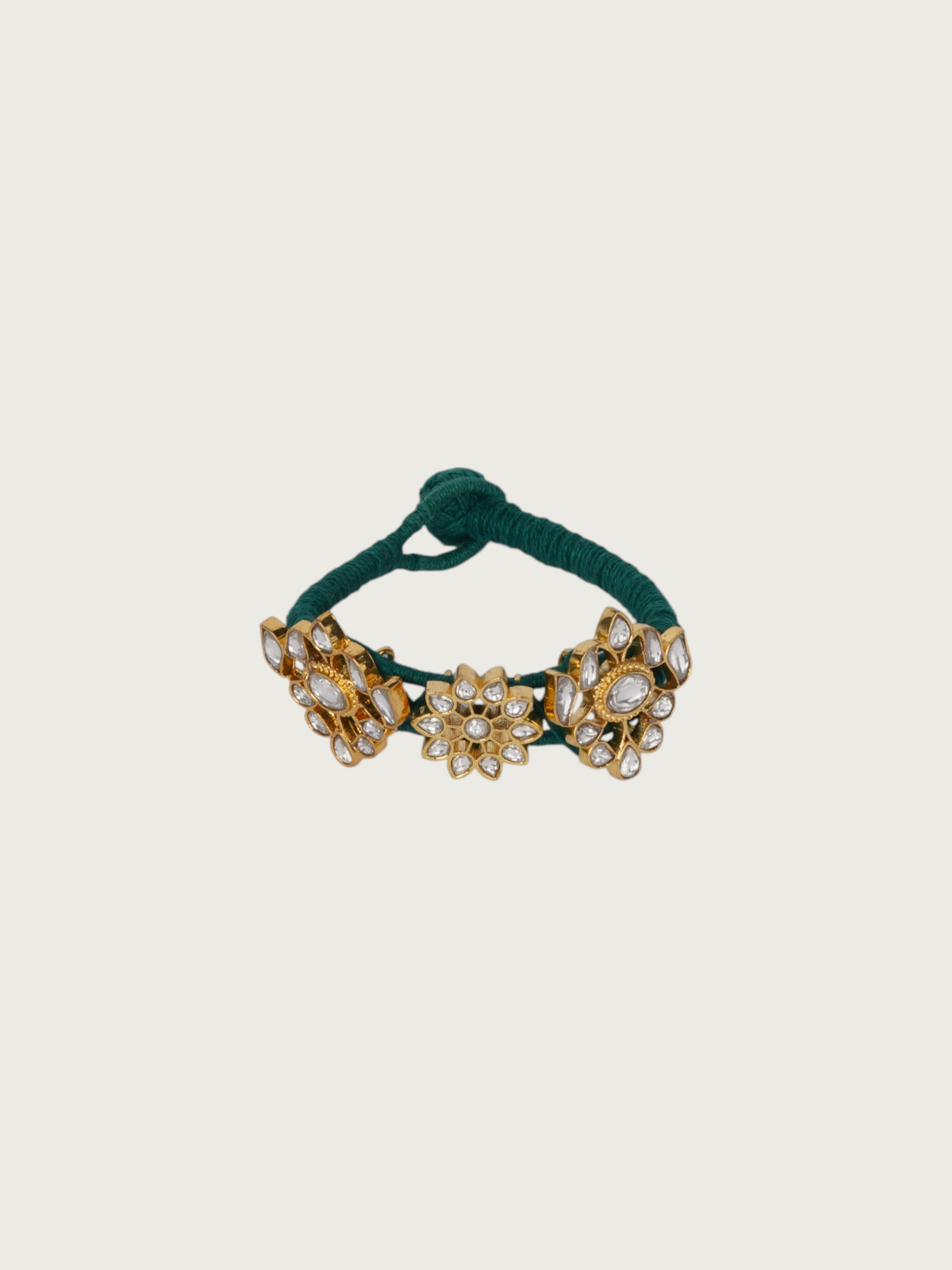 Elevate your accessory collection with this handcrafted jadau bracelet featuring a radiant arrangement of uncut-style stones in traditional floral motifs. Set in a warm gold-plated finish, the piece highlights a trio of intricately embellished components, enhanced with rich multicolor detailing – including hues of red, green, and white.