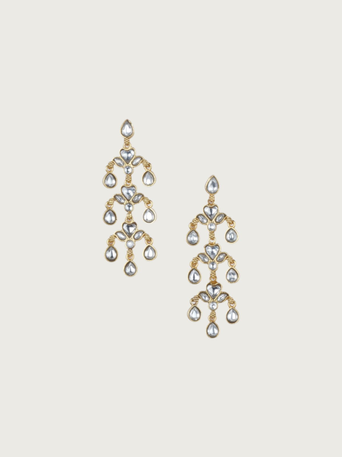 Add timeless grace to your look with these elegant layered kundan earrings. Crafted with refined precision, each earring showcases an intricate tiered design of pear-shaped kundan motifs, arranged like chandeliers to form a graceful silhouette. The gold-plated base adds warmth and richness, perfectly complementing the clear white kundan elements for a radiant yet balanced appeal.