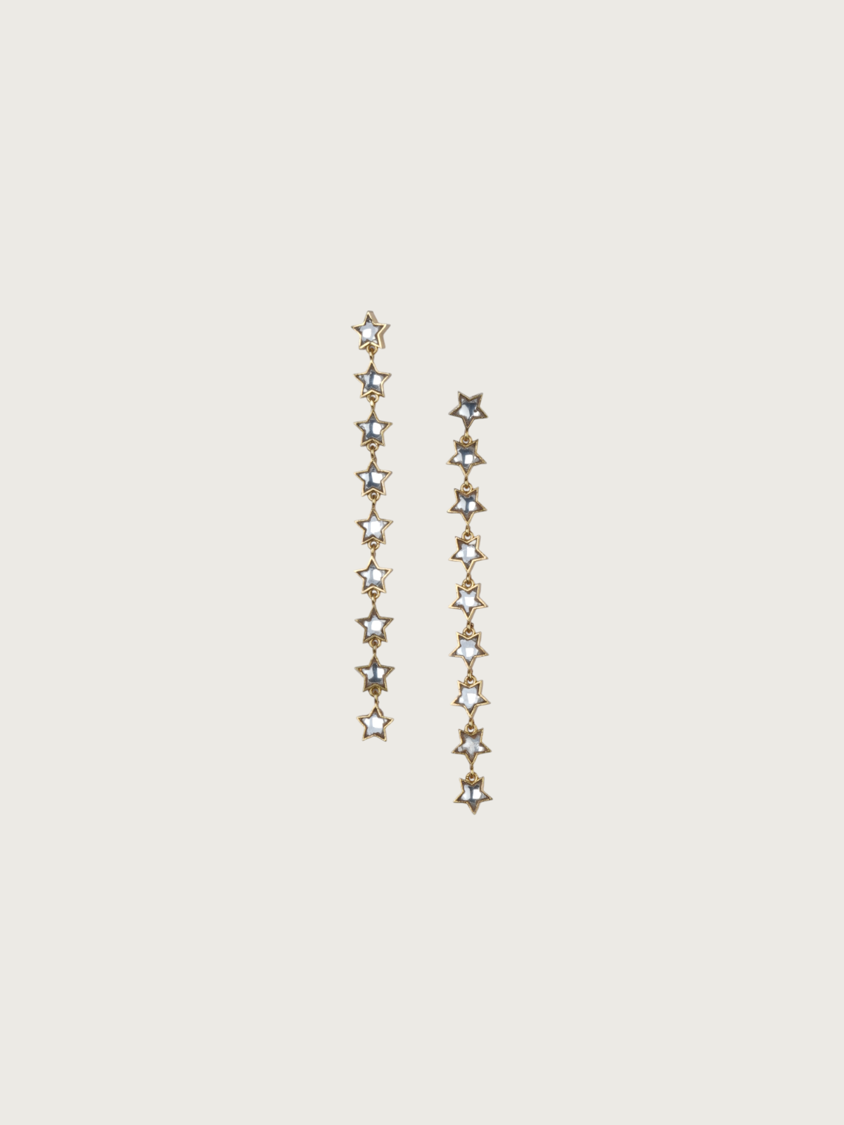 Twinkling with celestial charm, these Starry Cascade Dangler Earrings are designed to make you glow like the night sky. Crafted in a sleek vertical silhouette, each star element is encrusted with reflective kundan-style work, set against a golden frame. The linear arrangement of stars creates an elongated, elegant look that moves gracefully with every step.