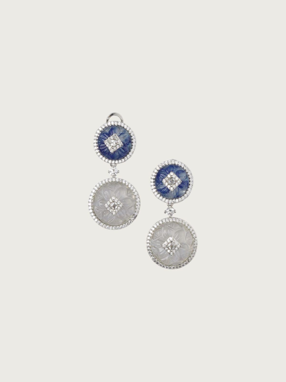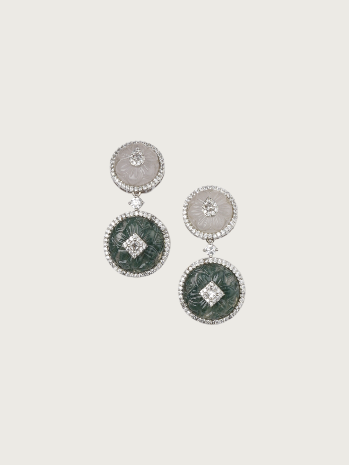Elevate your jewelry wardrobe with our stunning collection of dual-tone stone dangler earrings. Each pair is thoughtfully handcrafted to showcase two contrasting carved stone discs — one on top and one below — highlighted by dazzling CZ centerpieces and delicate halos. Set in a polished silver-toned finish, these earrings effortlessly marry modern geometry with traditional carving, creating an exquisite harmony of craft and style.