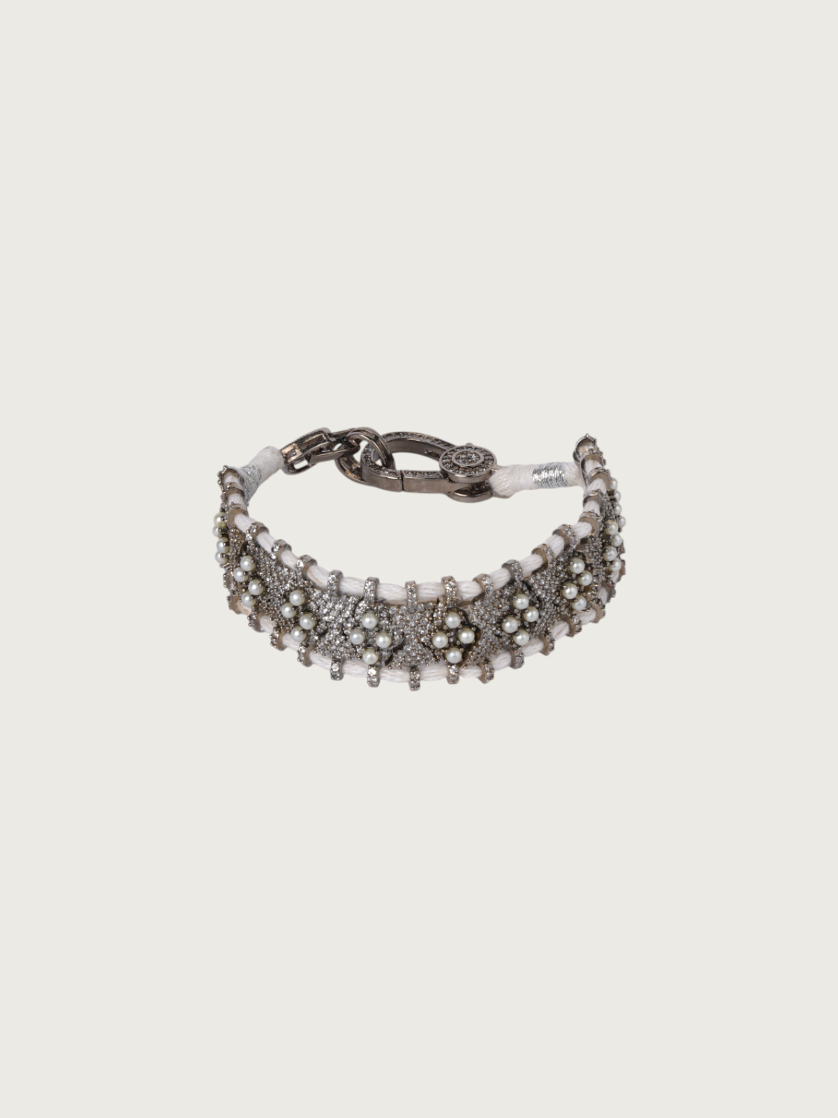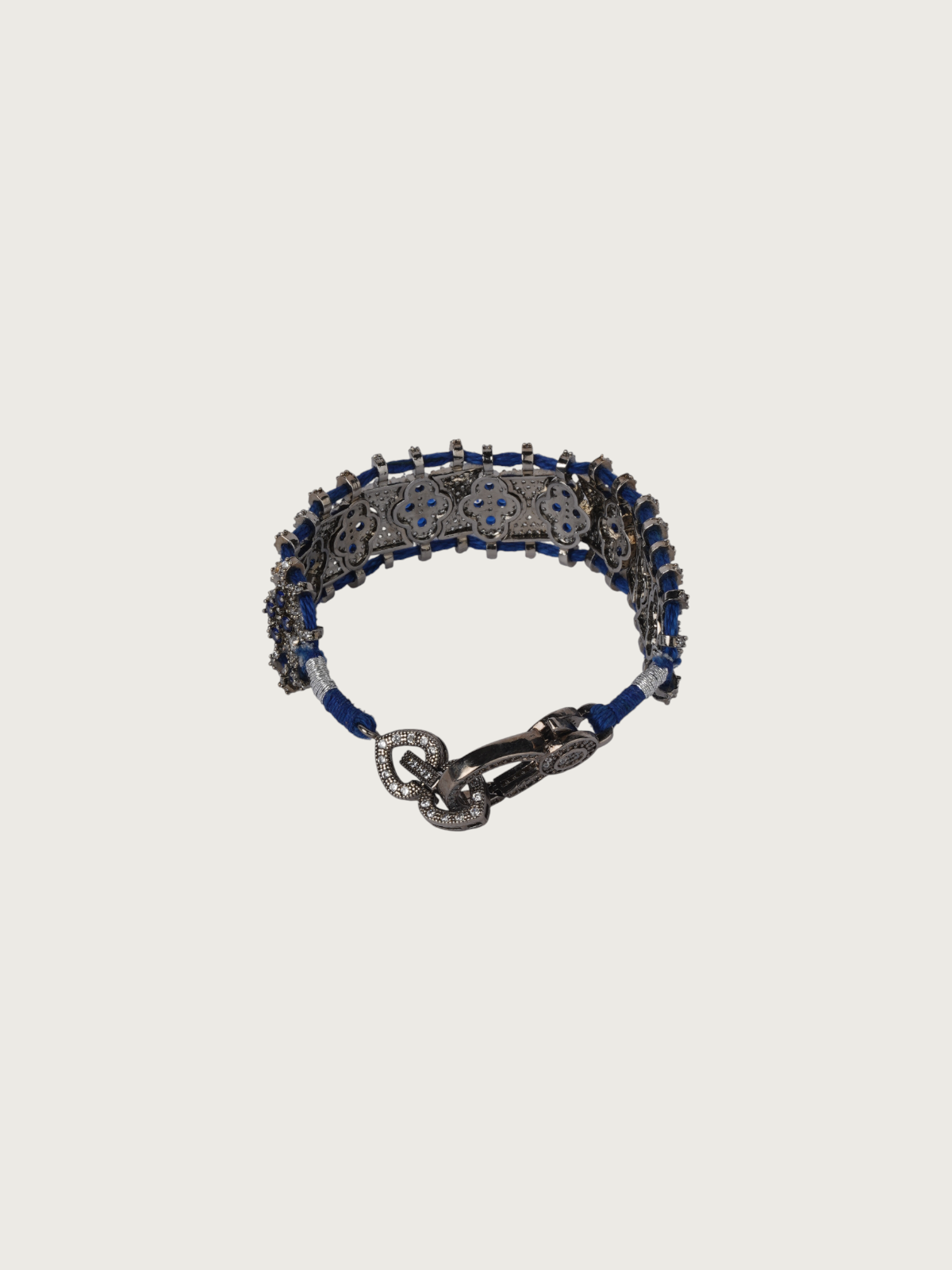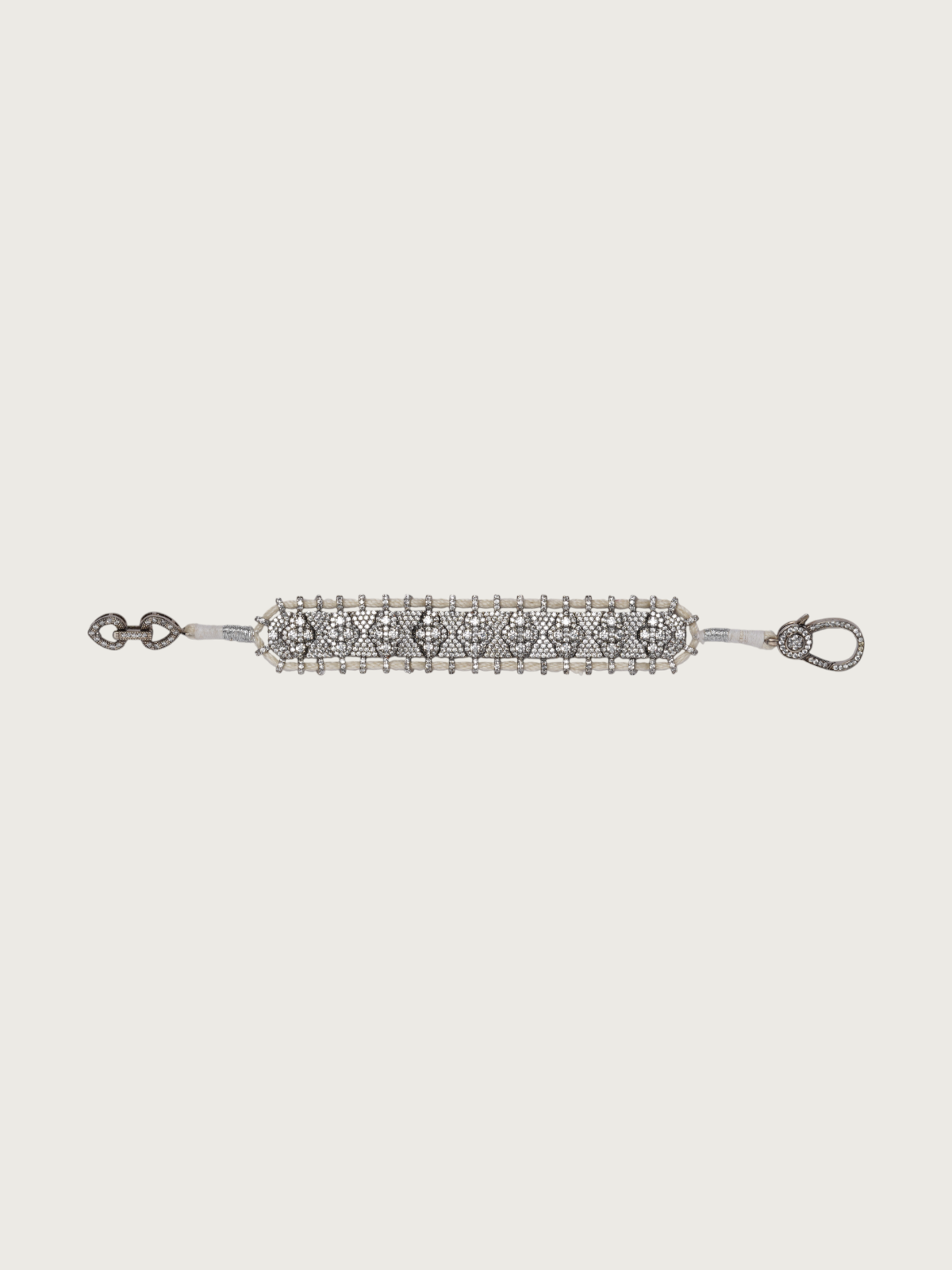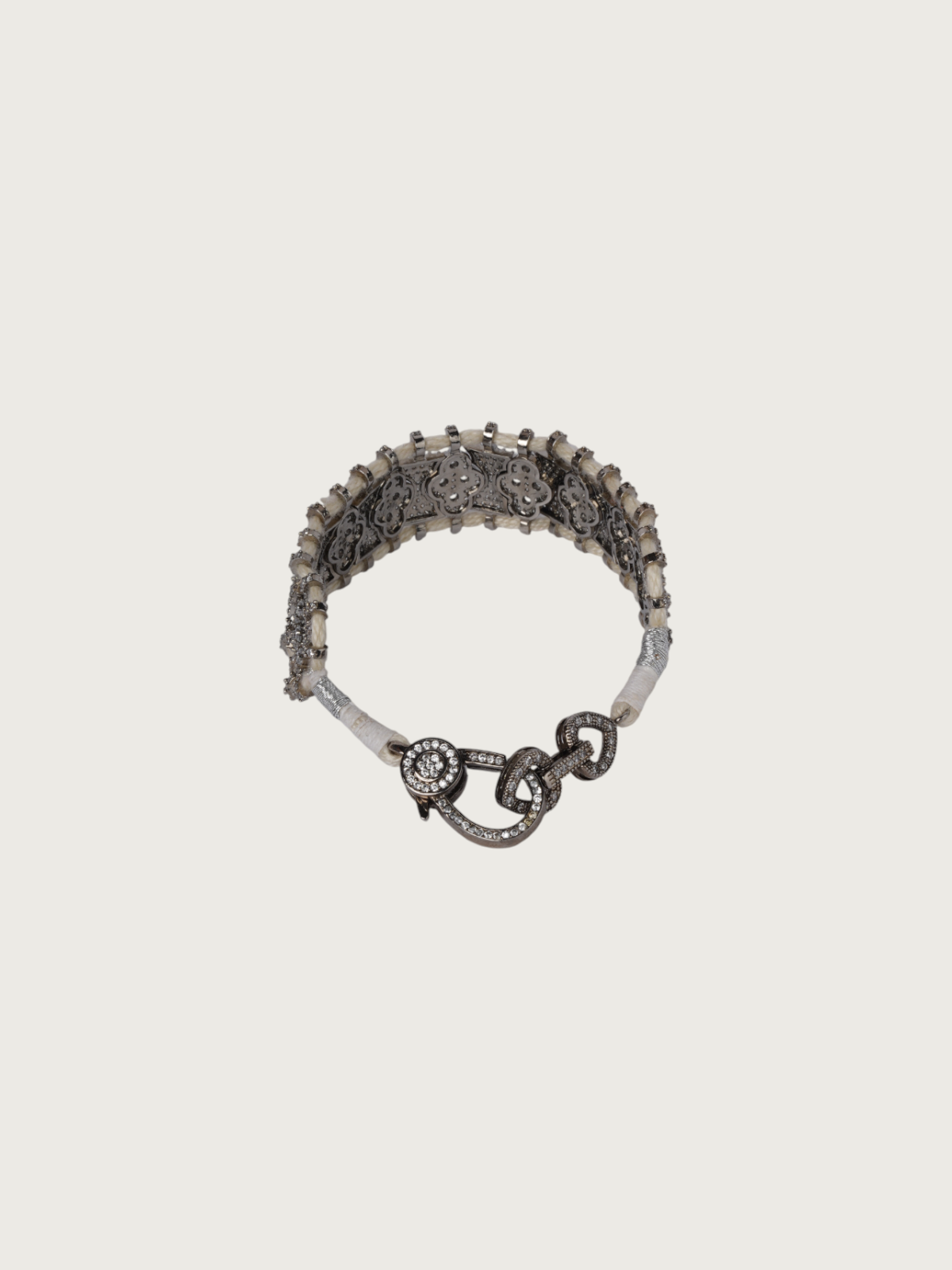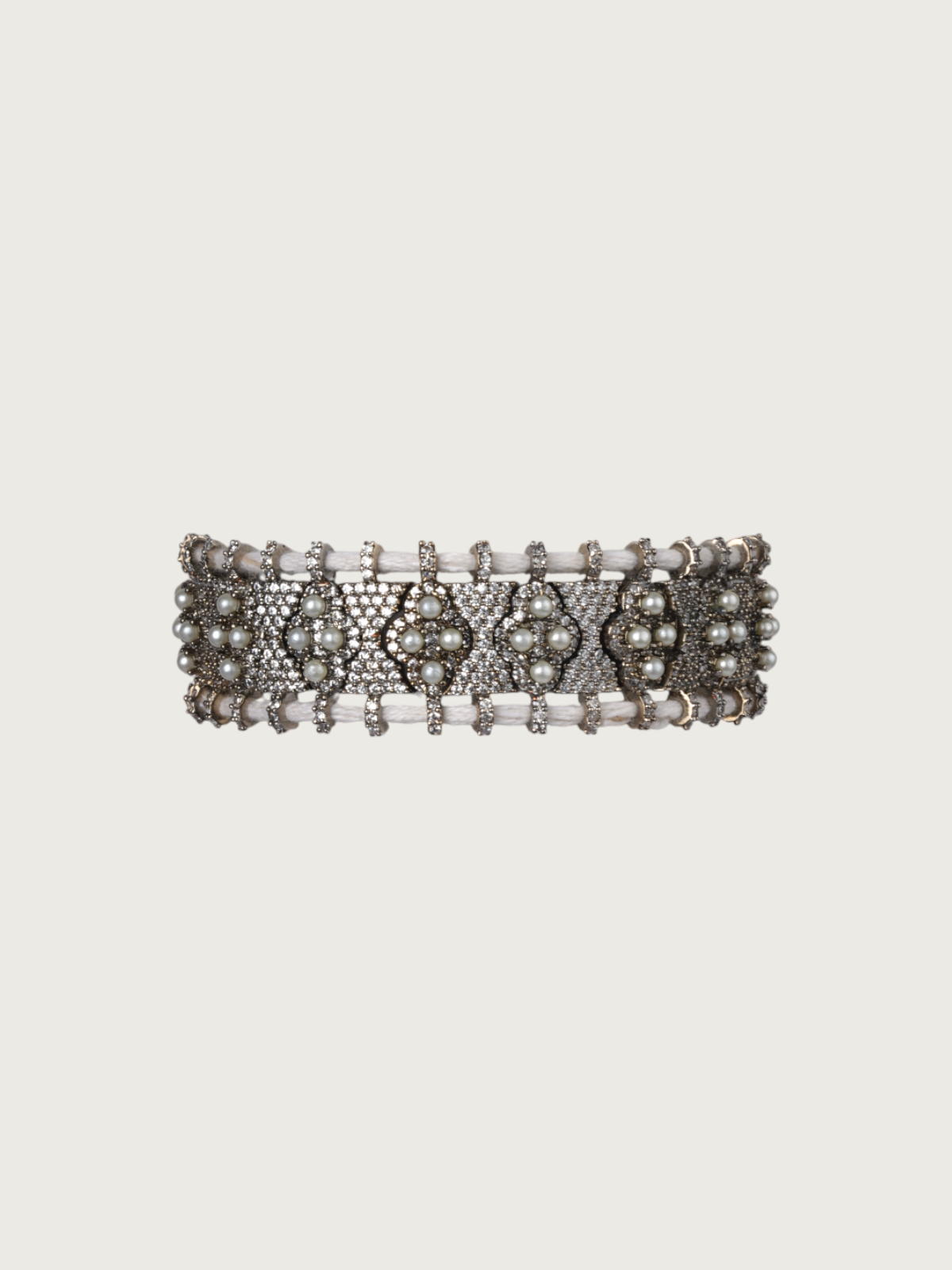 A delicate balance of texture and brilliance, this Tver bracelet features a handwoven thread paired with oxidized silver floral detailing. The intricate pattern sparkles with crystal highlights, giving it a modern yet timeless charm. Embellished with dainty pearl-like accents, it carries a vintage charm with a touch of luminosity. A versatile piece that transitions seamlessly from day to night.