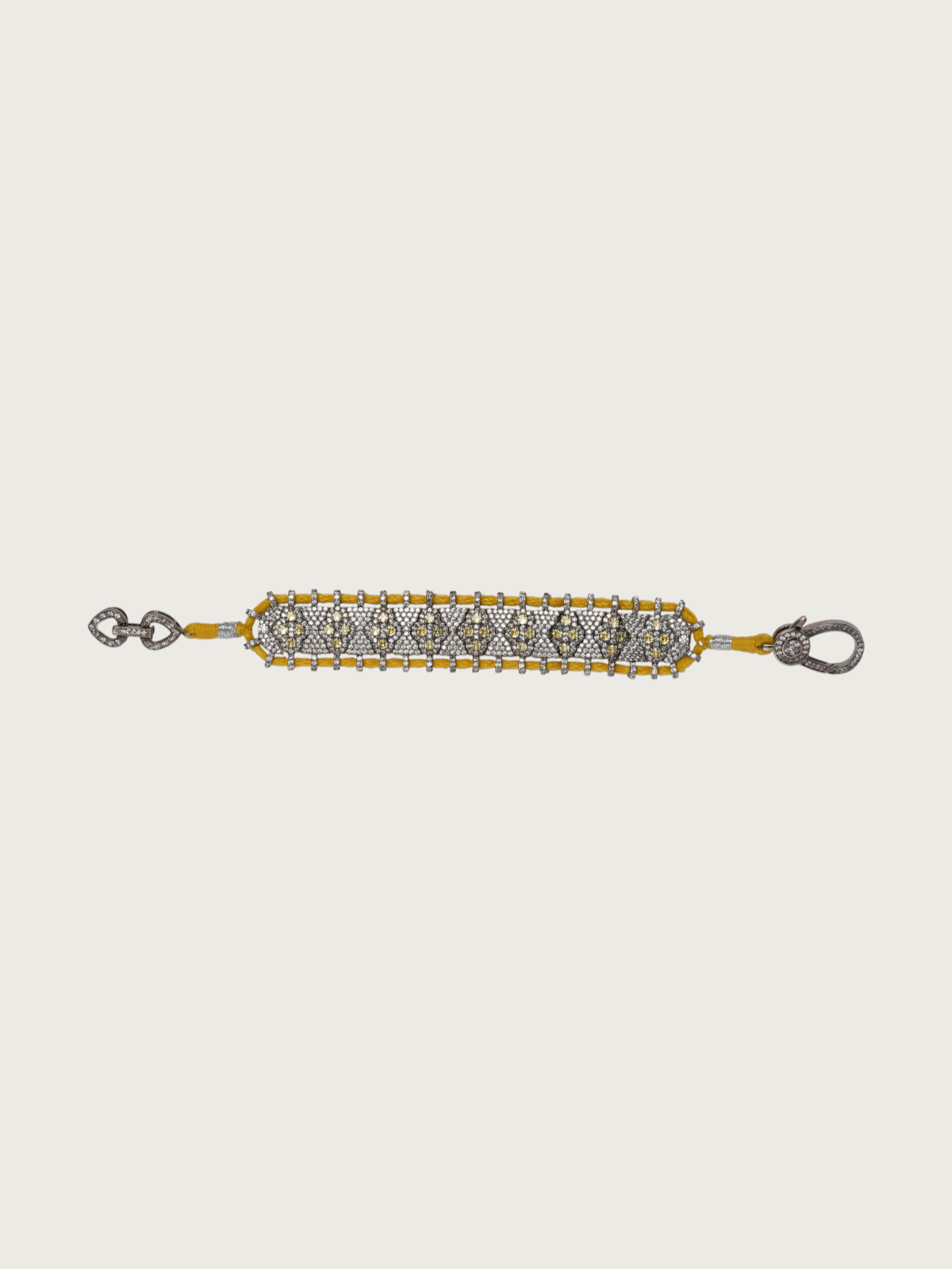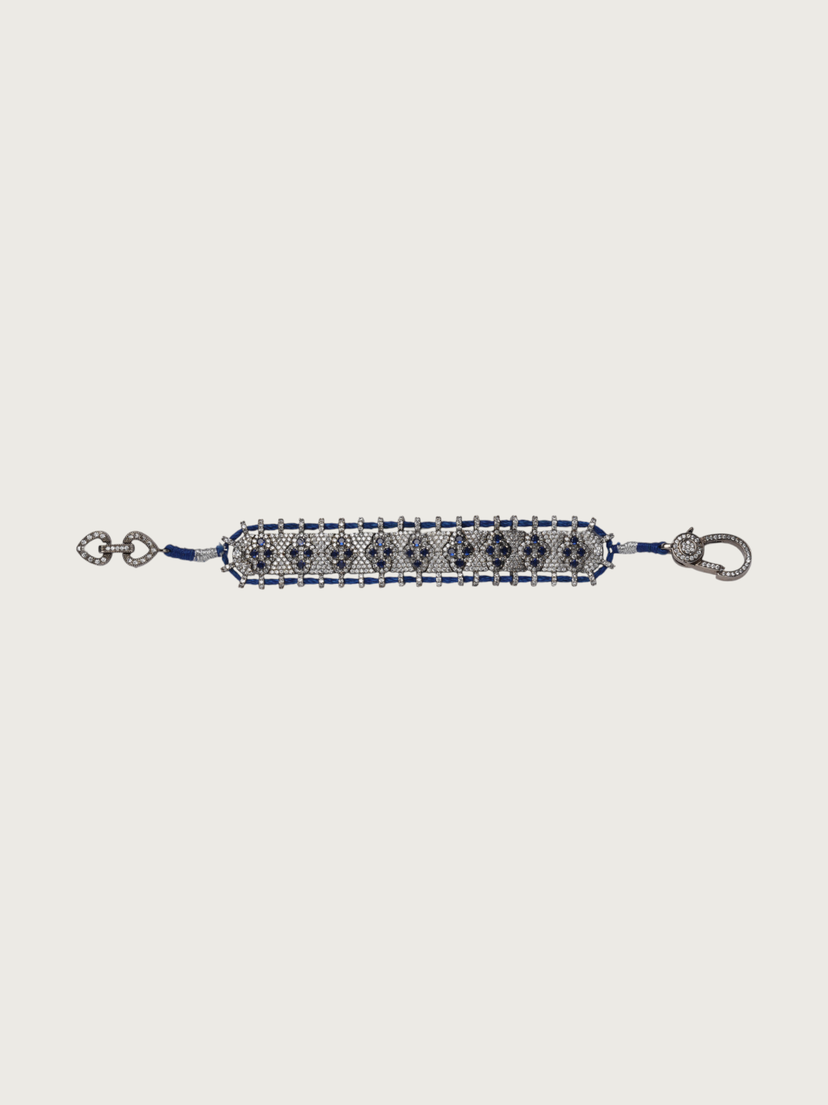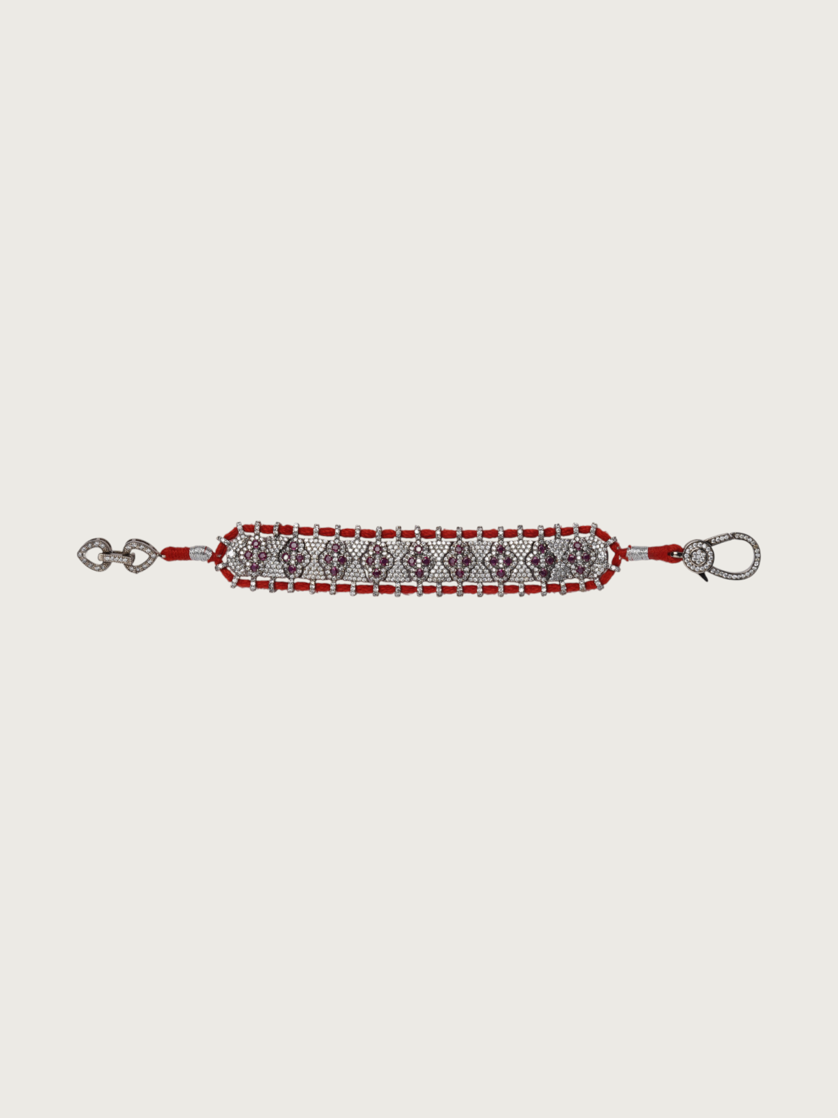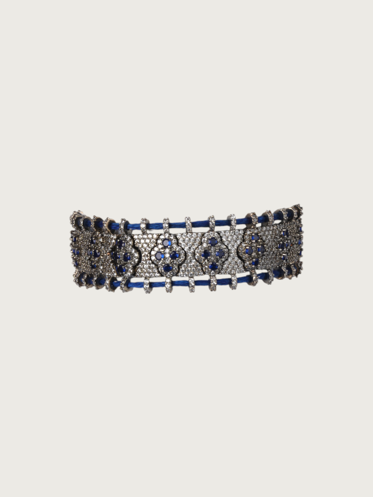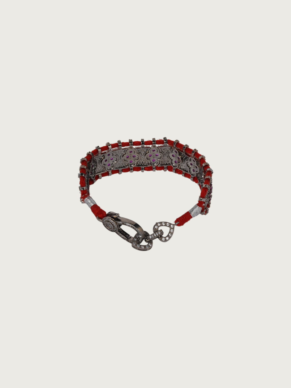 A delicate balance of texture and brilliance, this Tver bracelet features a handwoven thread paired with oxidized silver floral detailing. The intricate pattern sparkles with crystal highlights, giving it a modern yet timeless charm. Embellished with dainty pearl-like accents, it carries a vintage charm with a touch of luminosity. A versatile piece that transitions seamlessly from day to night.