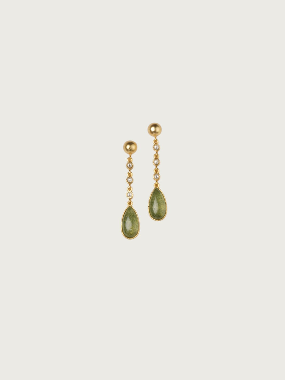 Sleek, elegant, and refreshingly unique – these green teardrop drop earrings exude a timeless charm. Featuring beautifully polished green teardrop stones suspended from a delicate line of pearl-accented links, the design is finished with a soft gold-plated base that enhances their understated grace.